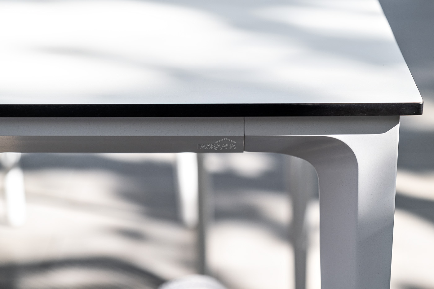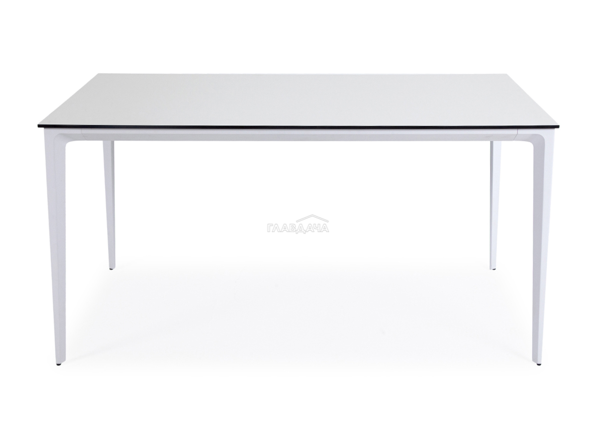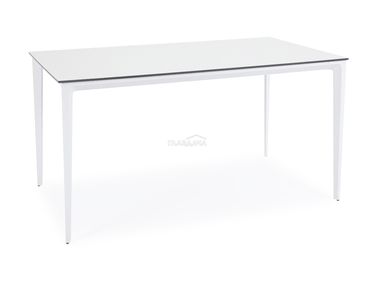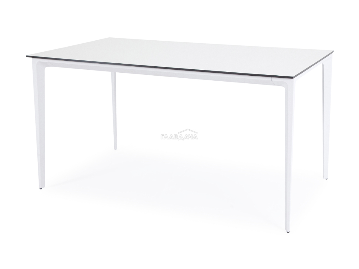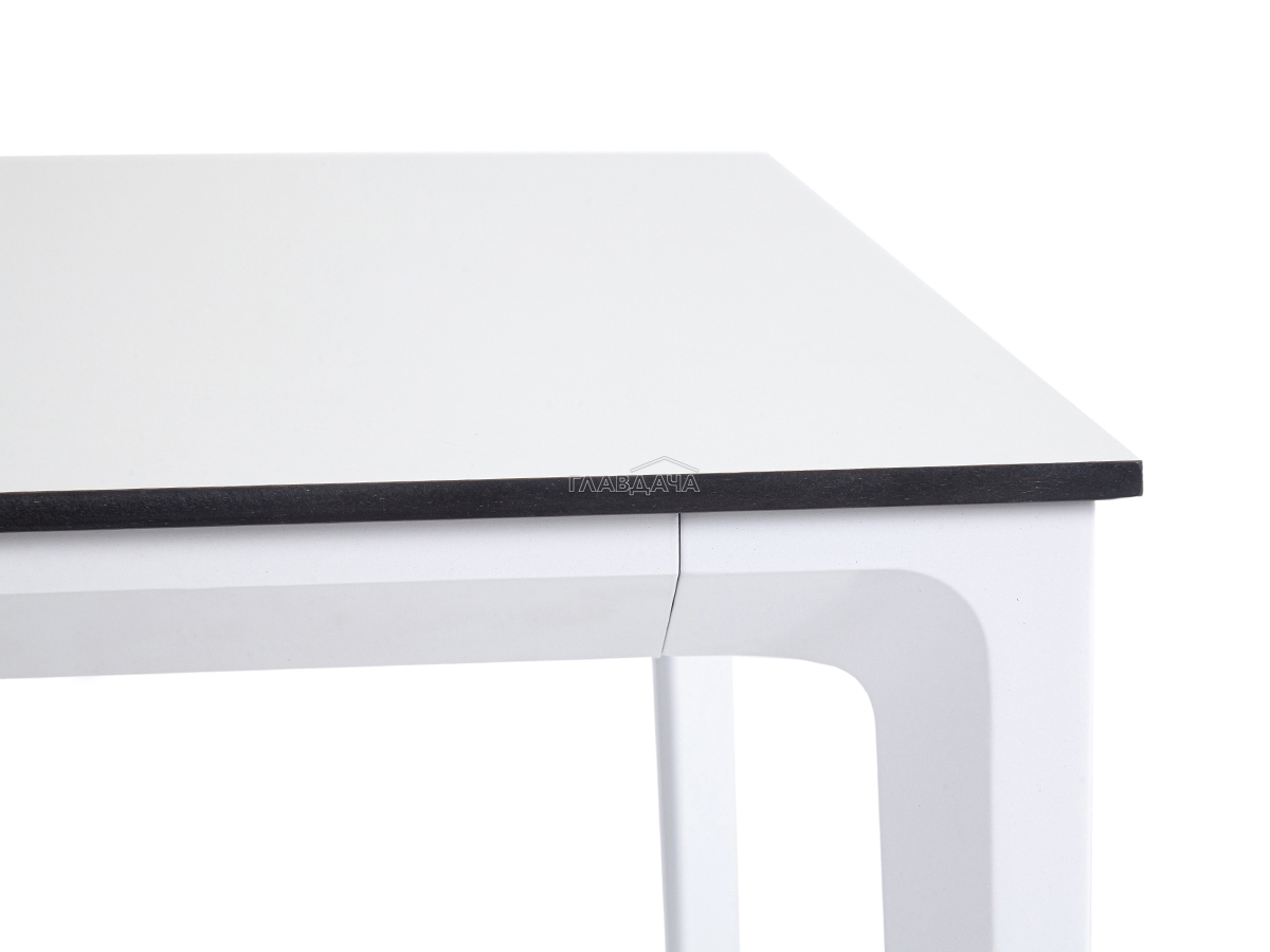 Столешница выполнена из современного высококачественного монолитного компакт-пластик HPL, толщиной 12 мм в молочном цветом. Материал устойчив к высоким температурам, попаданию влаги и может использоваться при любых погодных условиях. Подстолье изготовлено из крашеного алюминия белого цвета.