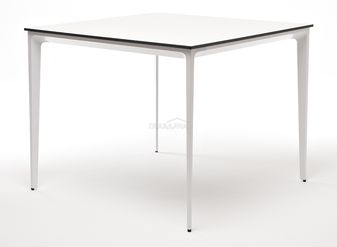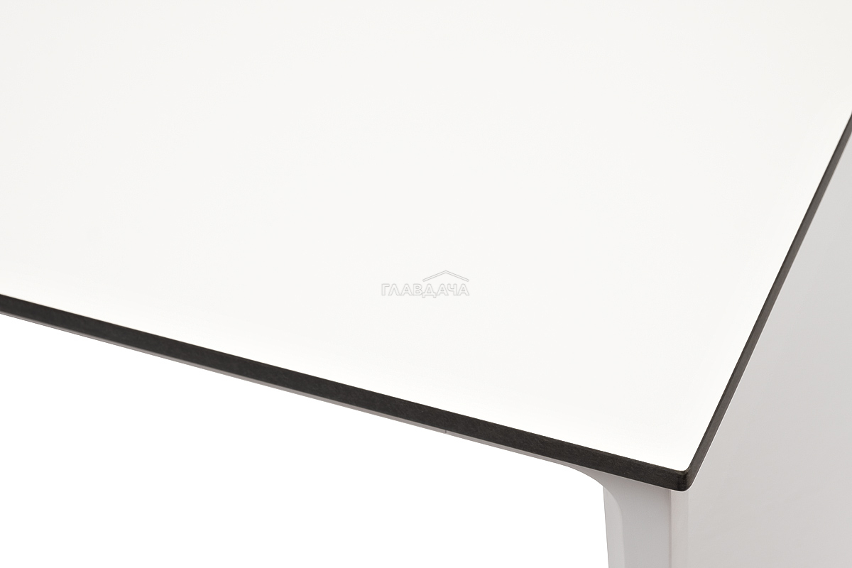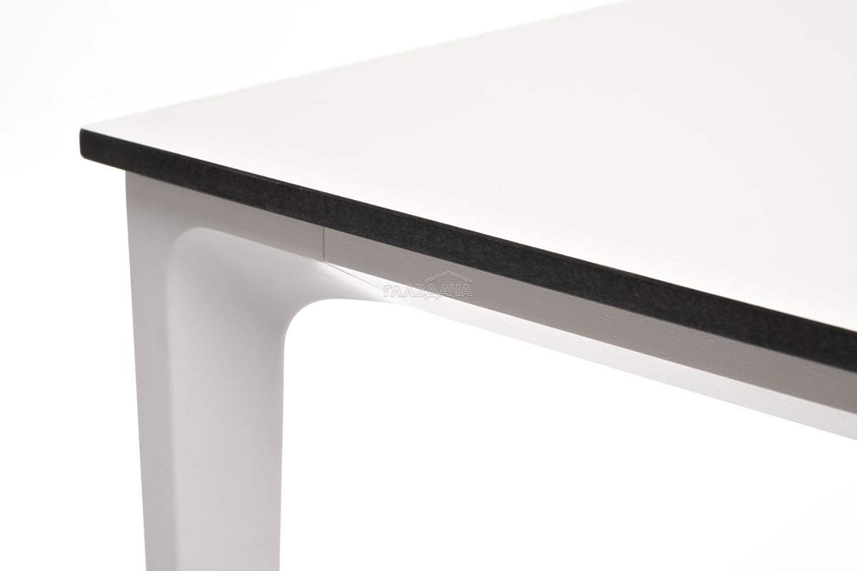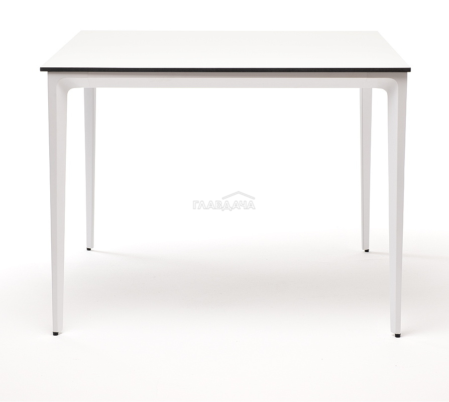 Столешница выполнена из современного высококачественного монолитного компакт-пластик HPL, толщиной 12 мм в молочном цветом. Материал устойчив к высоким температурам, попаданию влаги и может использоваться при любых погодных условиях. Подстолье изготовлено из крашеного алюминия белого цвета.