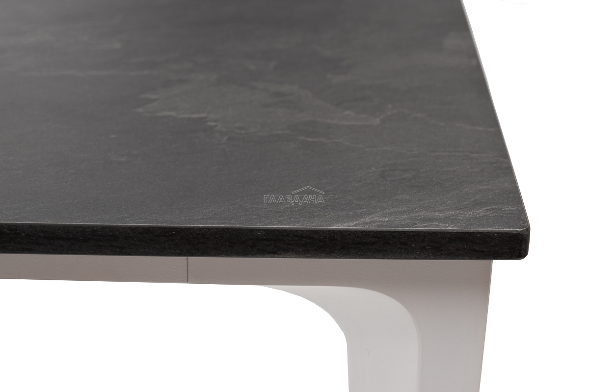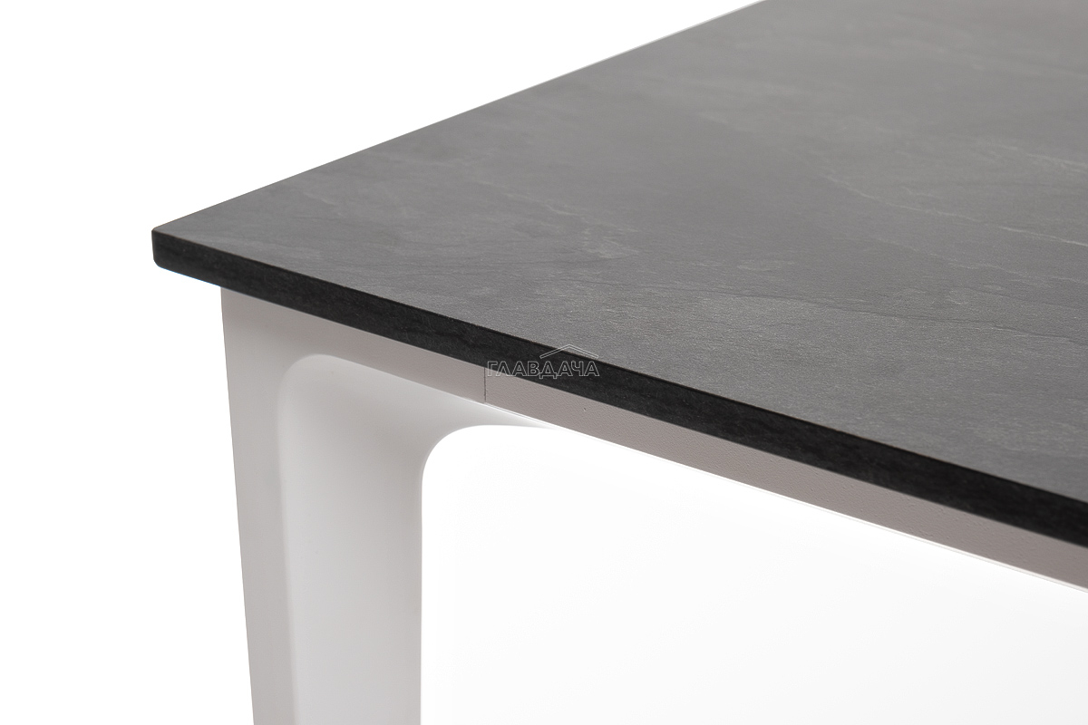 Столешница выполнена из современного высококачественного монолитного компакт-пластик HPL, толщиной 12 мм в цвете «серый гранит». Материал устойчив к высоким температурам, попаданию влаги и может использоваться при любых погодных условиях. Подстолье изготовлено из крашеного алюминия белого цвета.