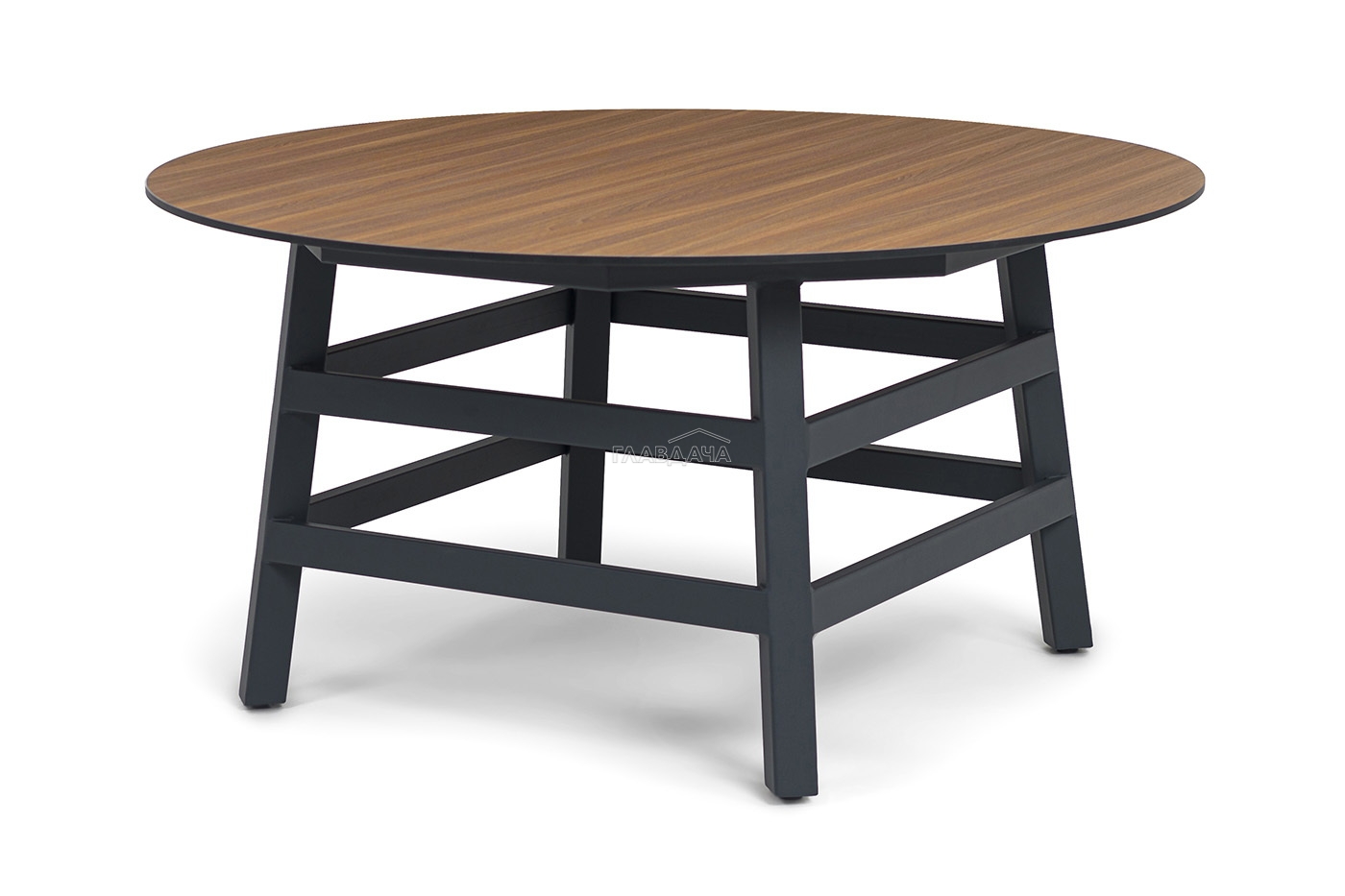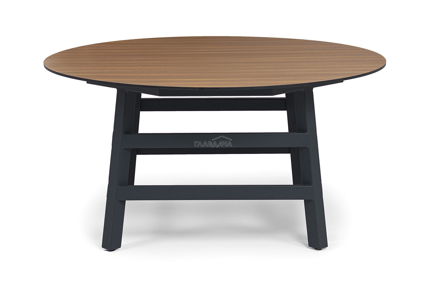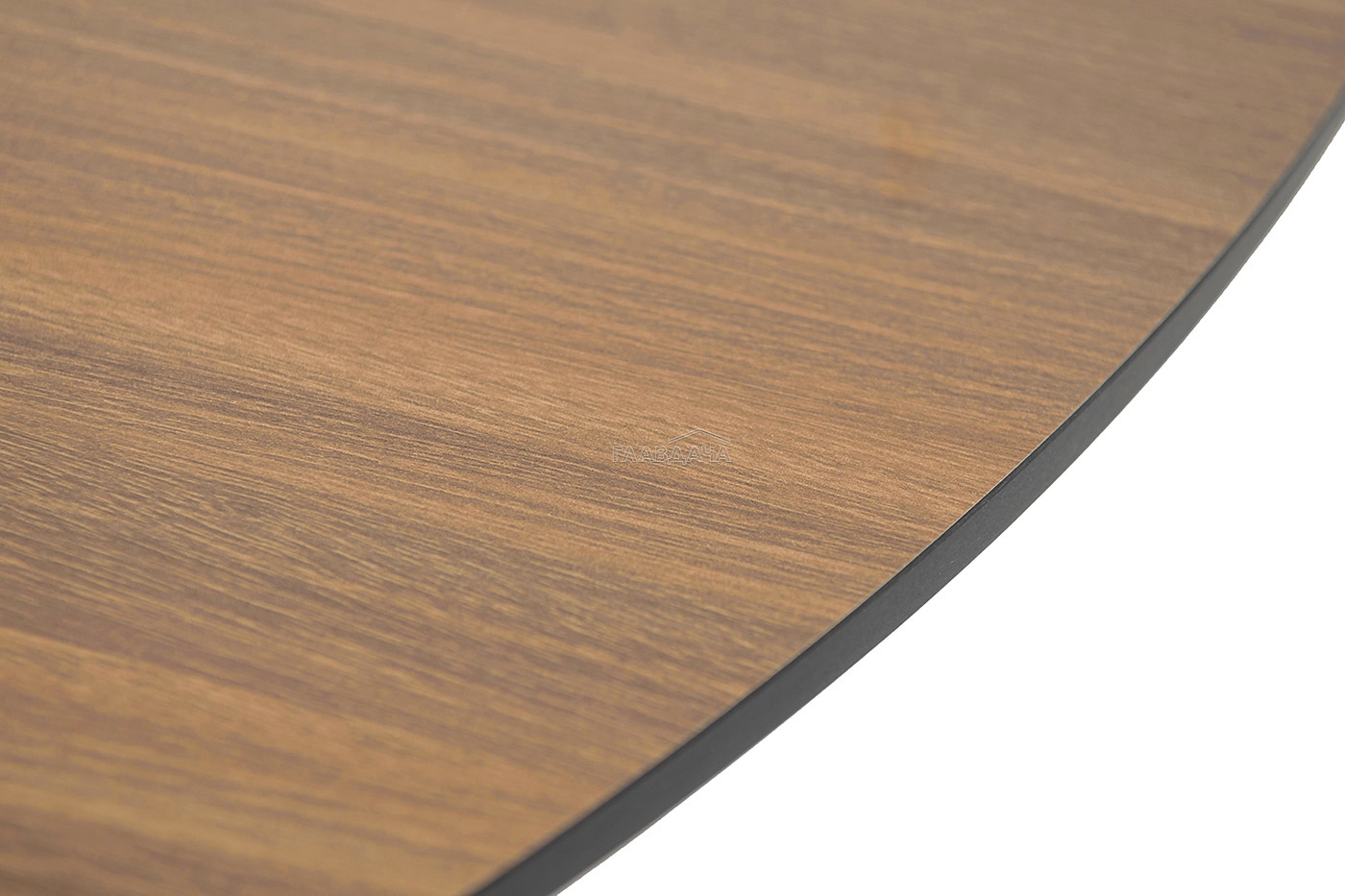 Размер стола - 1600×1600×750 мм. Столешница изготовлена из компакт-пластика HPL c рисунком цвета «дуб».