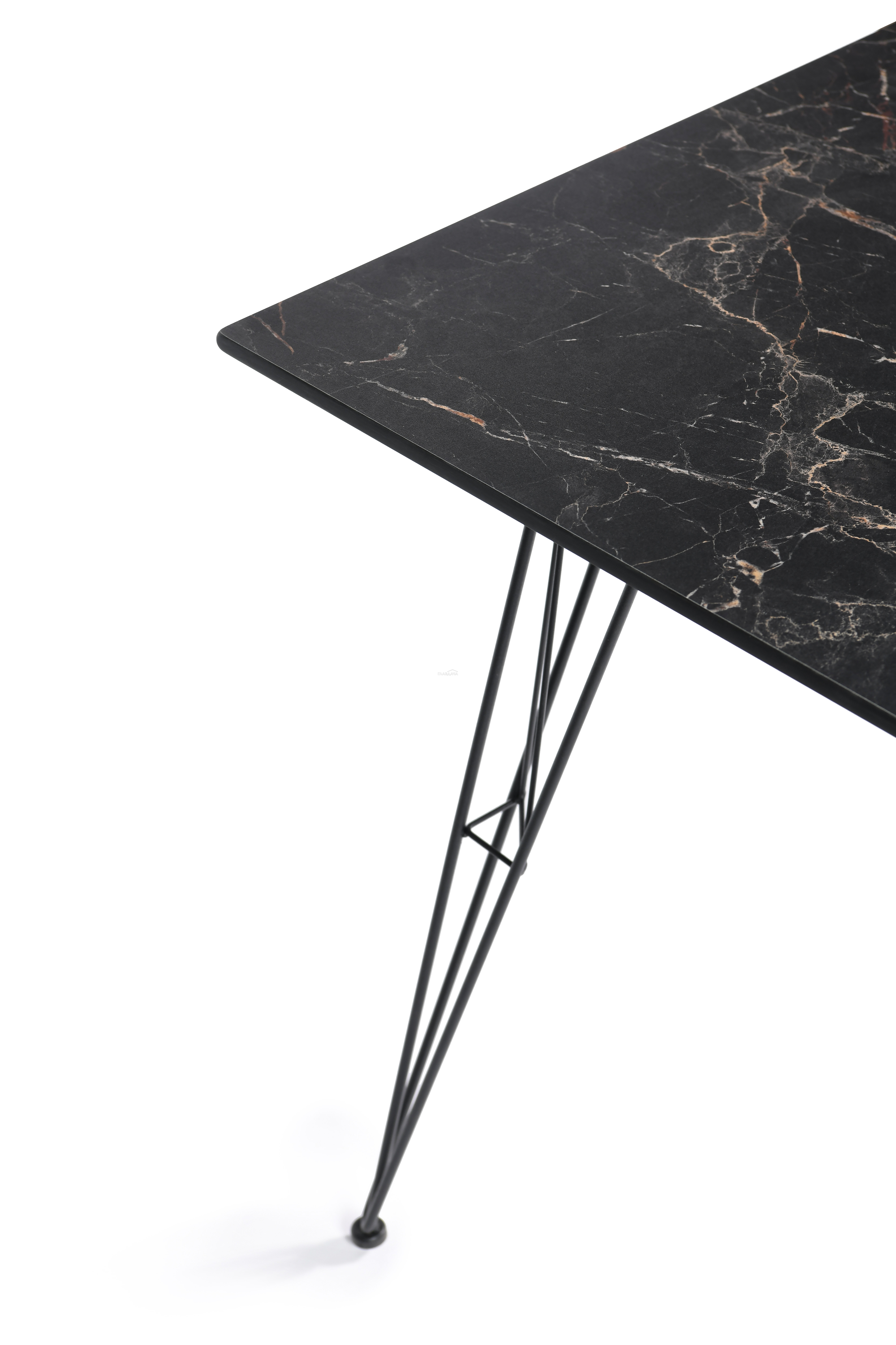 Столешница выполнена из современного высококачественного монолитного компакт-пластик HPL, толщиной 12 мм с цветом под черный мрамор. Материал устойчив к высоким температурам, попаданию влаги и может использоваться и на кухне. Подстолье изготовлено из крашеного металла в цвете «мокрый асфальт».