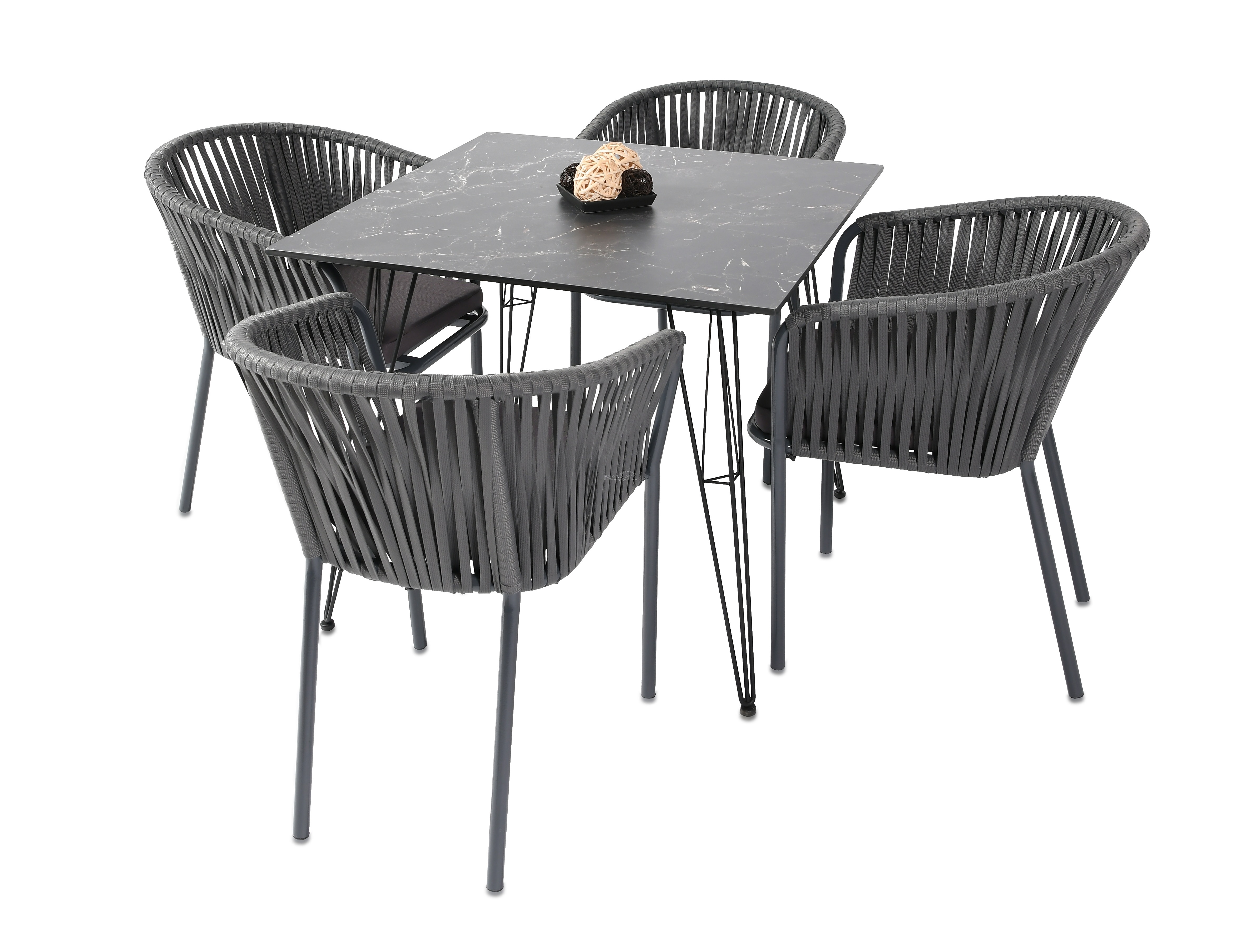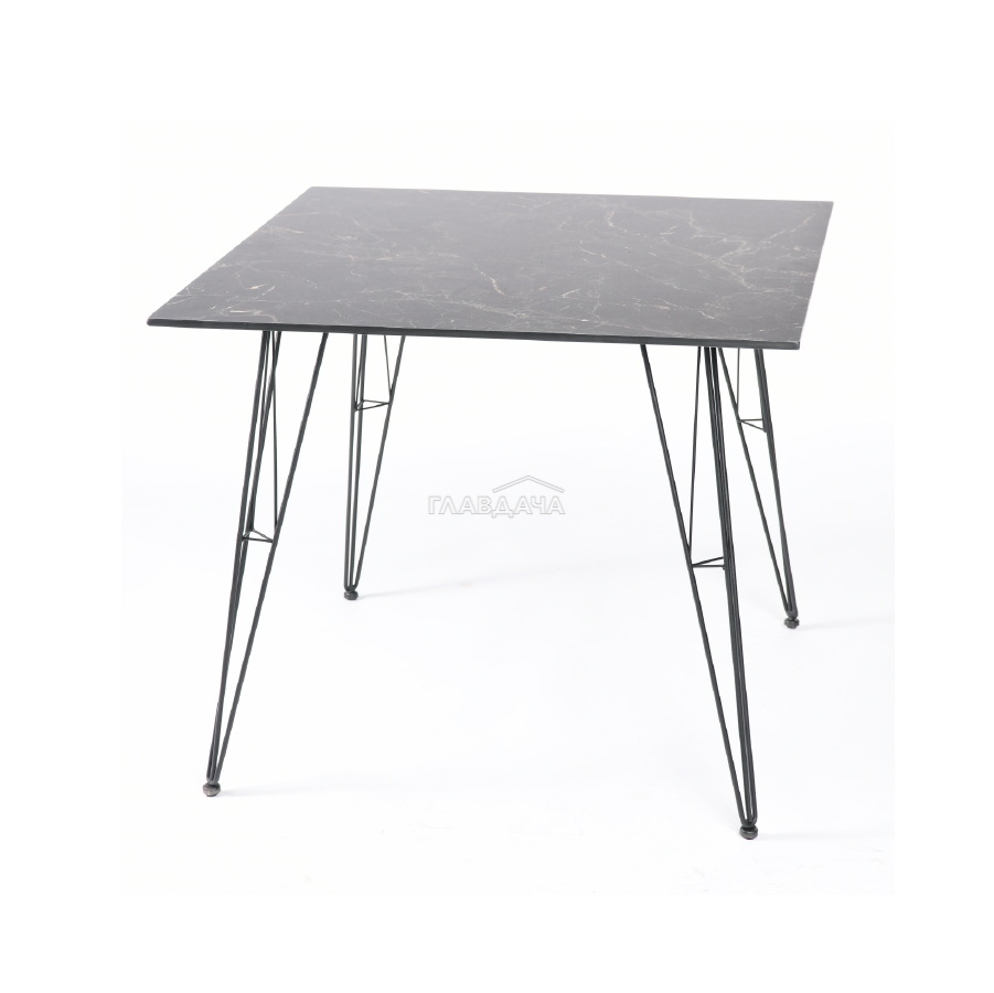 Современный обеденный стол «Руссо» в стиле лофт. Подстолье изготовлено из металла, окрашенного в темно-серый цвет. Столешница - качественный монолитный компакт-пластик HPL, толщиной 12 мм. Цвет столешницы имитирует черный мрамор.
