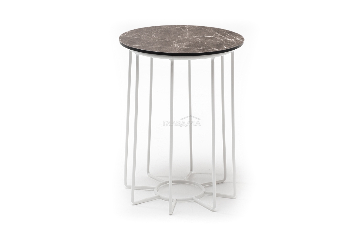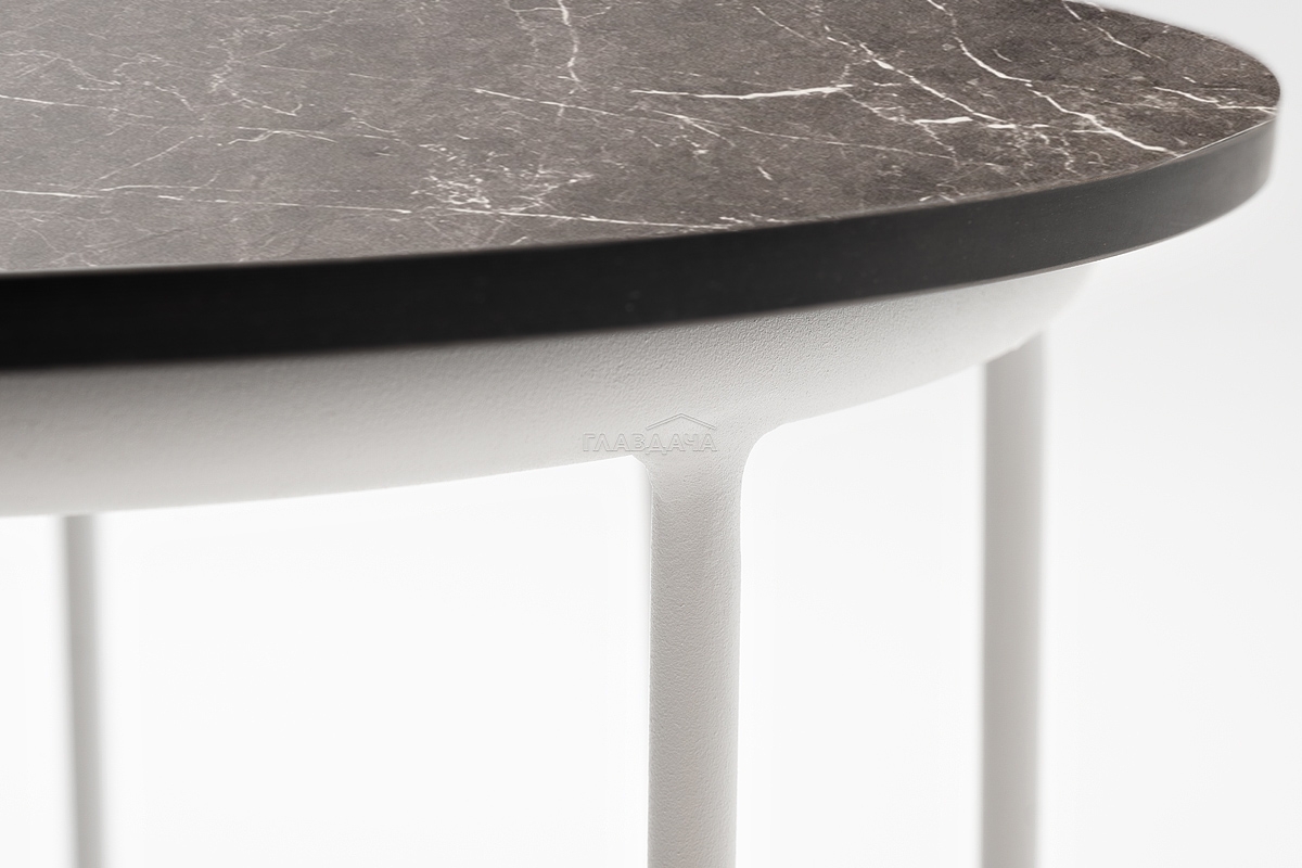 Круглый журнальный столик «Эквадор» каркас изготовлен из стали, окрашенного в белый цвет. Столешница выполнена из высококачественного монолитного компакт-пластика HPL, толщиной 12 мм. Цвет столешницы - «серый мрамор».