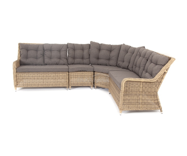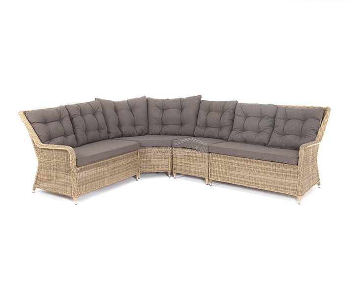 Модульный диван из искусственного ротанга «Бергамо» имеет угловую форму. Модель произведена из круглого искусственного ротанга соломенного цвета и укомплектована мягкими подушками из полиэстера с влагоотталкивающей тканью. В основе дивана - прочный алюминиевый каркас.