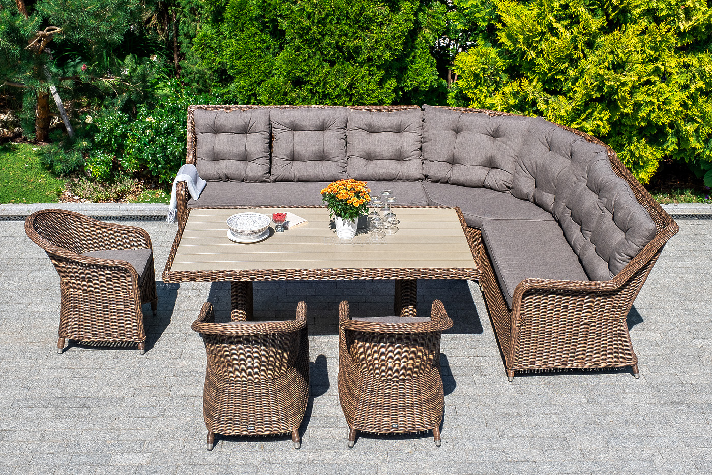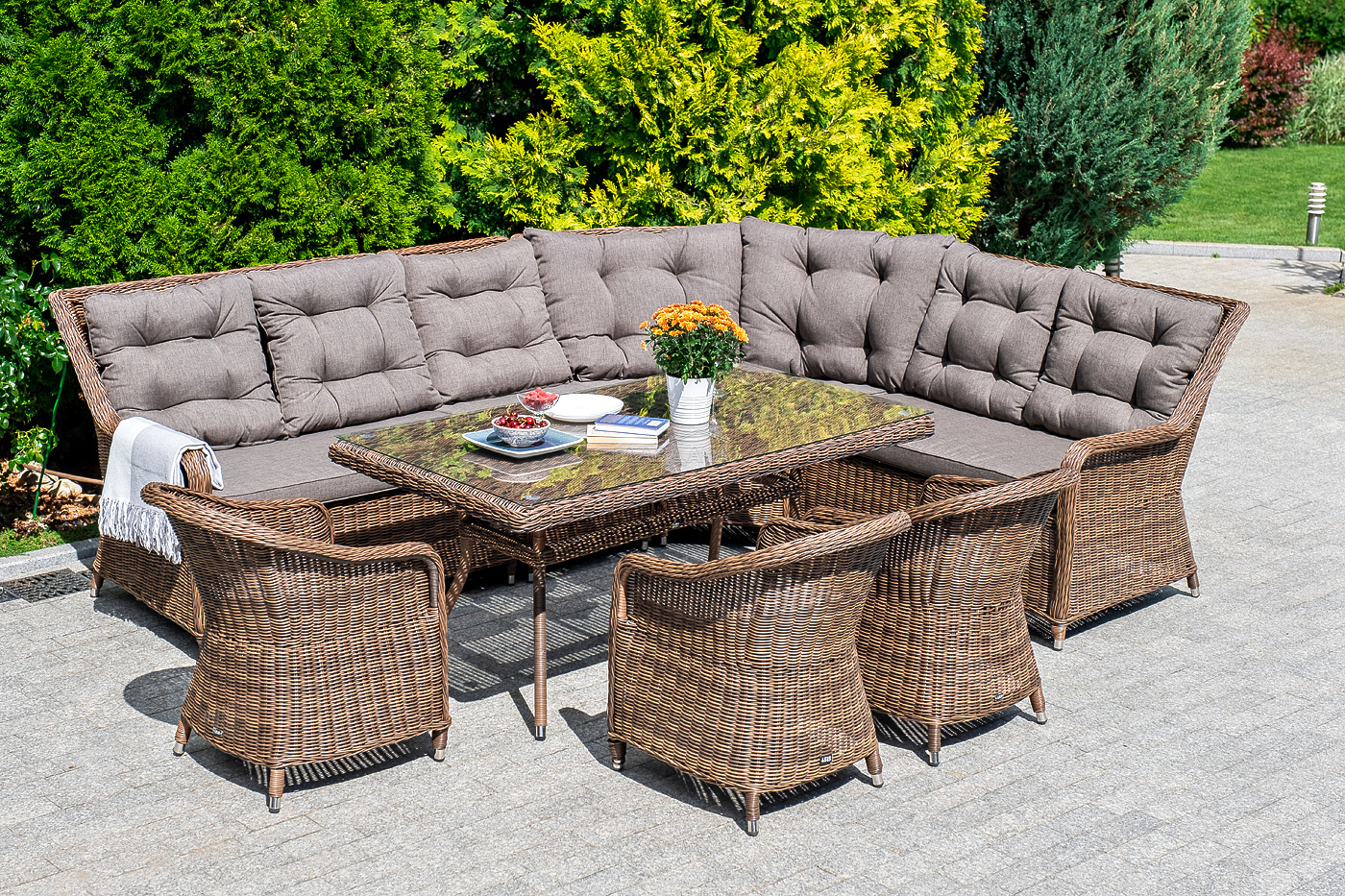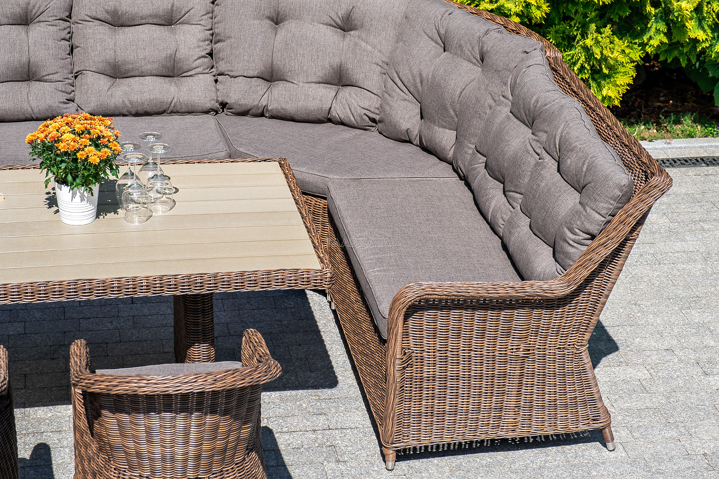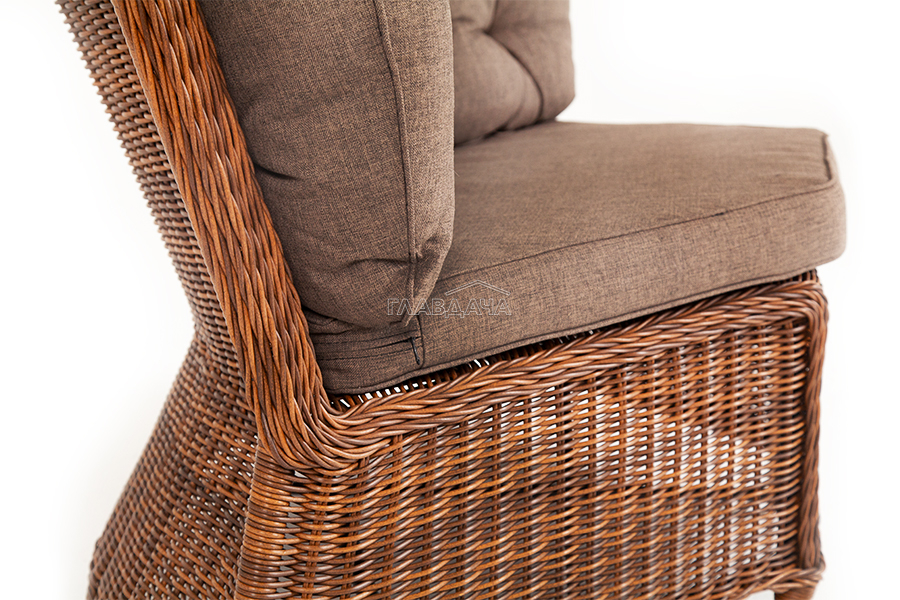 Плетеный угловой диванный модуль «Бергамо» изготовлен из алюминиевого каркаса, вручную оплетенного круглым искусственным ротангом коричневого цвета.