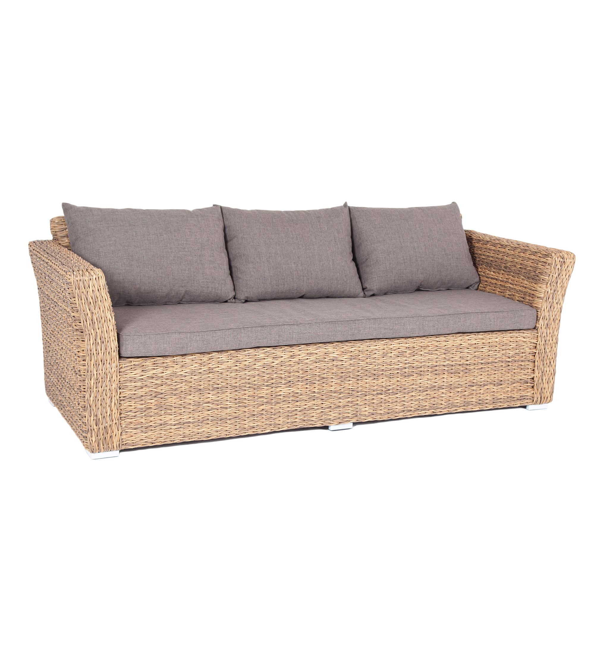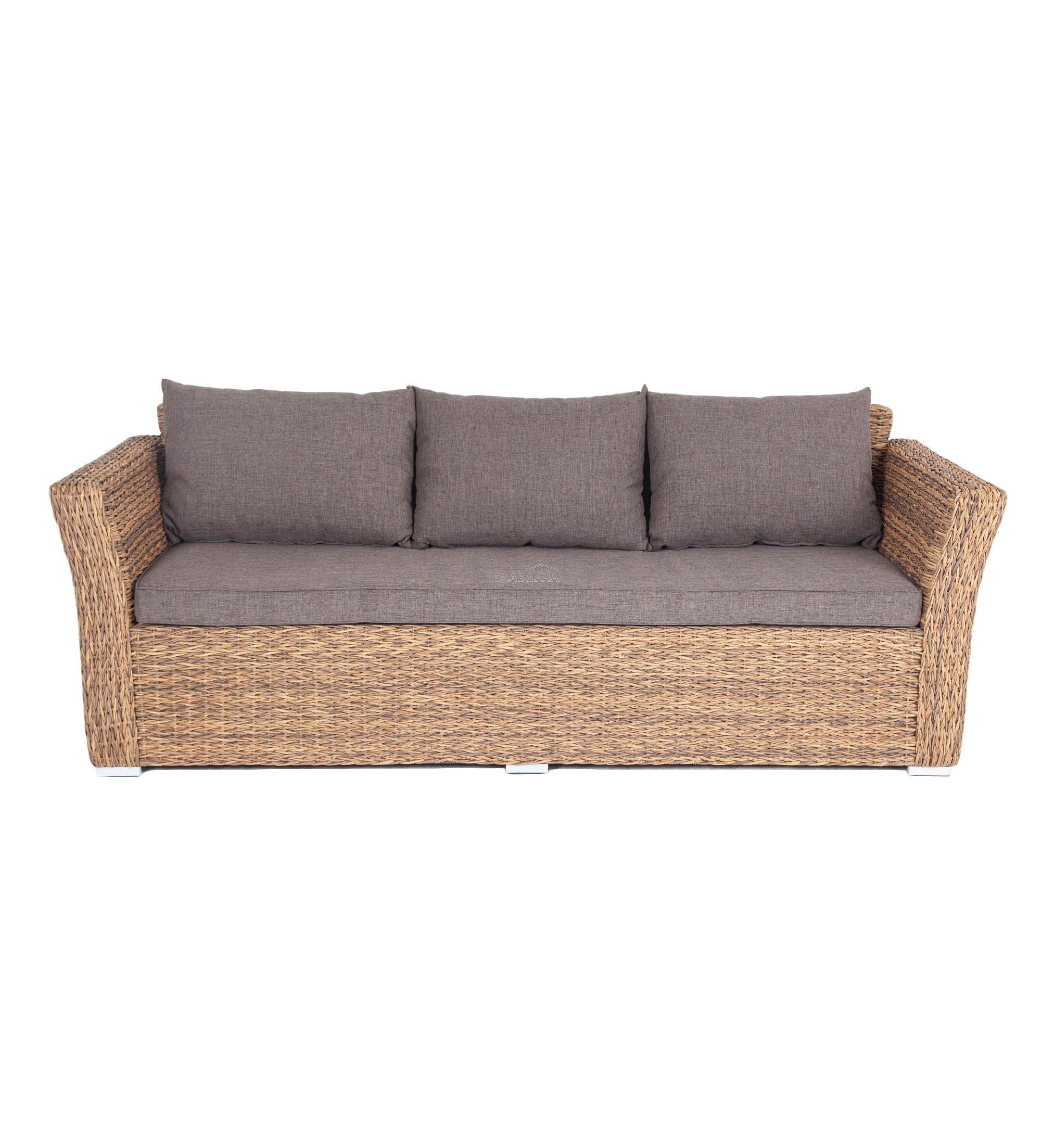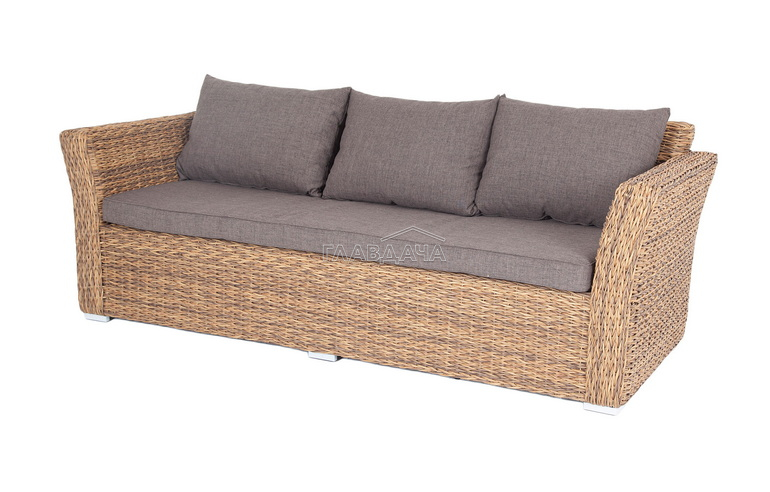 Трехместный диван укомплектован мягкими подушками, которые защищены съёмными чехлами в сером оттенке. При их пошиве используется износостойкий полиэстер, плотность которого достигает 300гр/м2. Предусмотрена влагоотталкивающая пропитка.