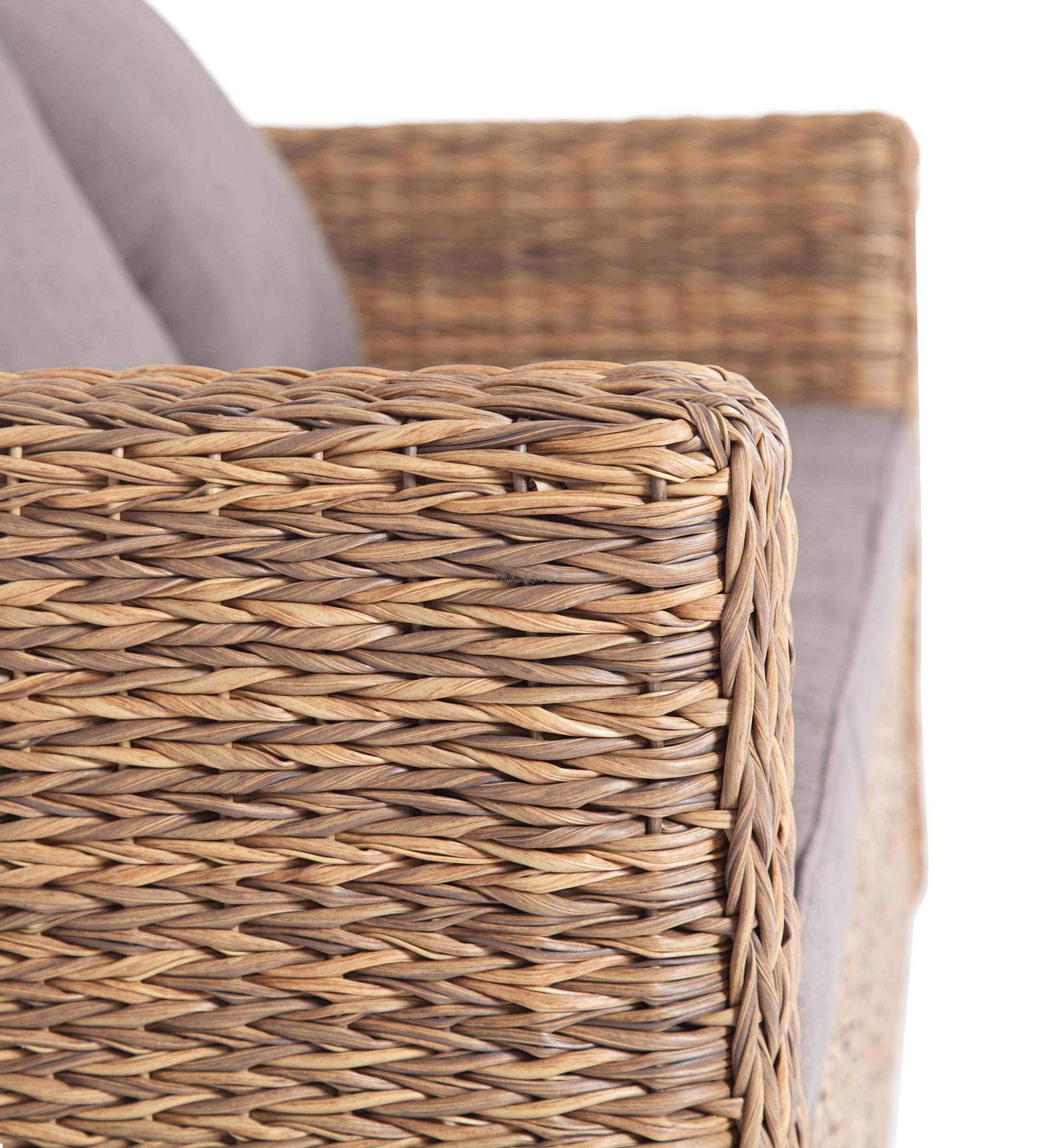Мебель декорирована ручным плетением, выполненным из искусственного ротанга вида «гиацинт» соломенного цвета.