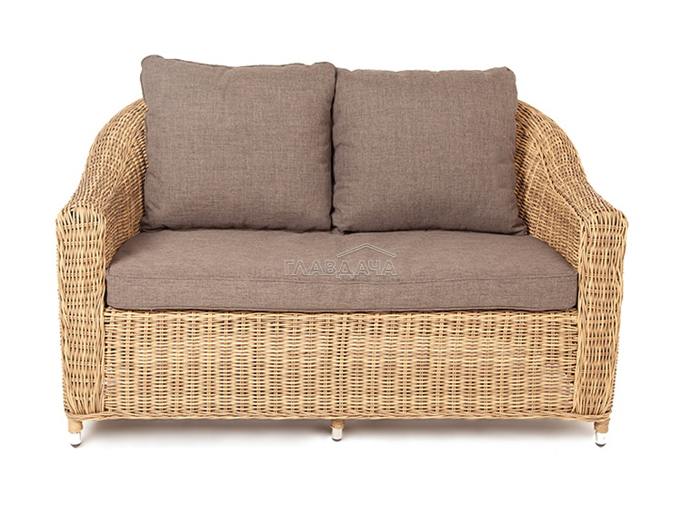 Диван из искусственного ротанга соломенного цвета «Кон Панна» дает возможность комфортно расположить две персоны благодаря комплектным подушкам из полиэстера с влагоотталкивающей пропиткой.