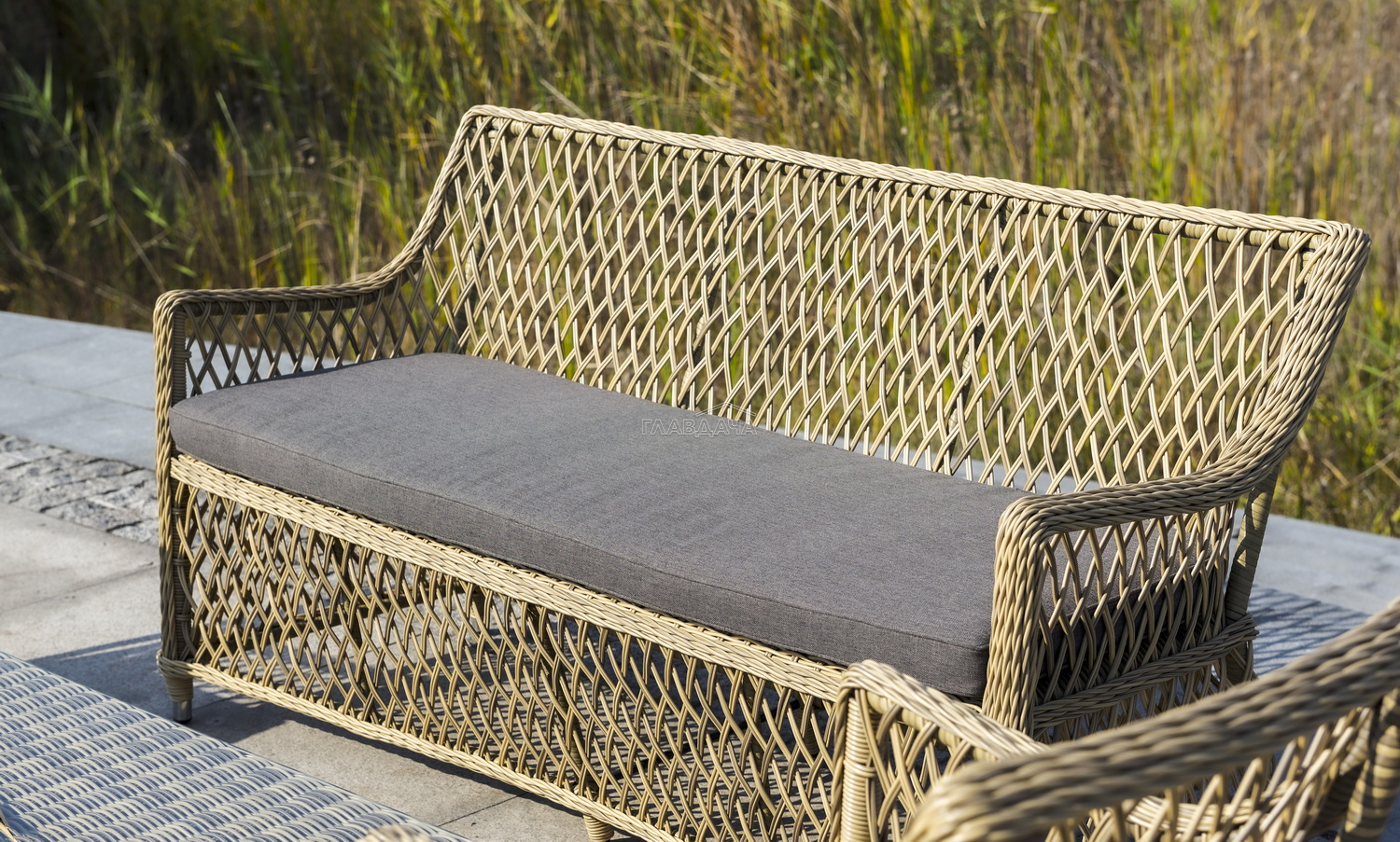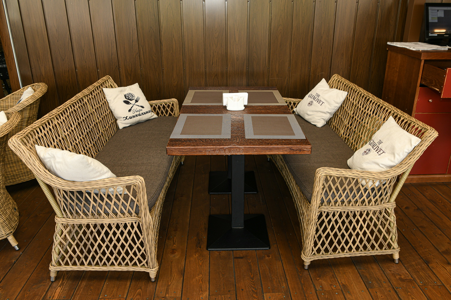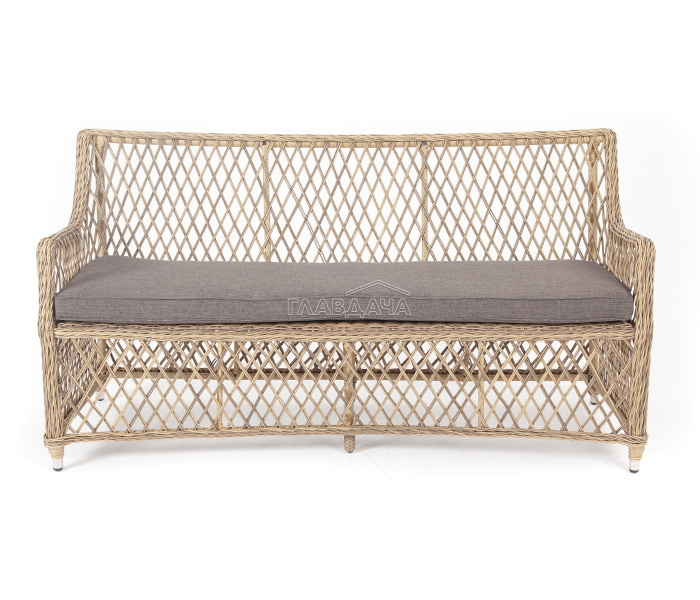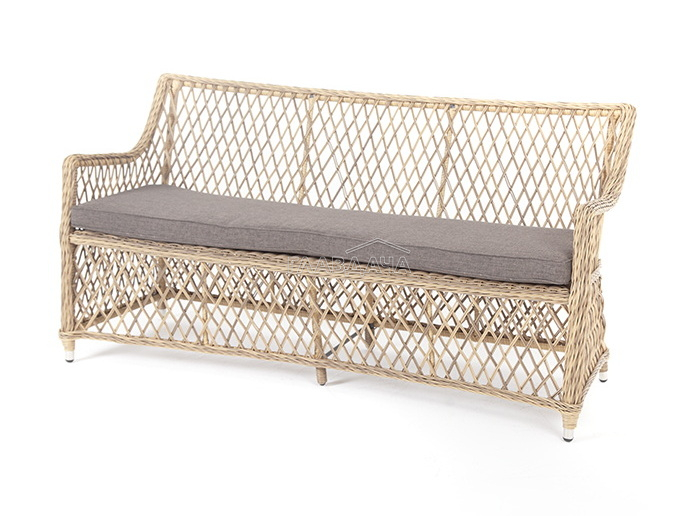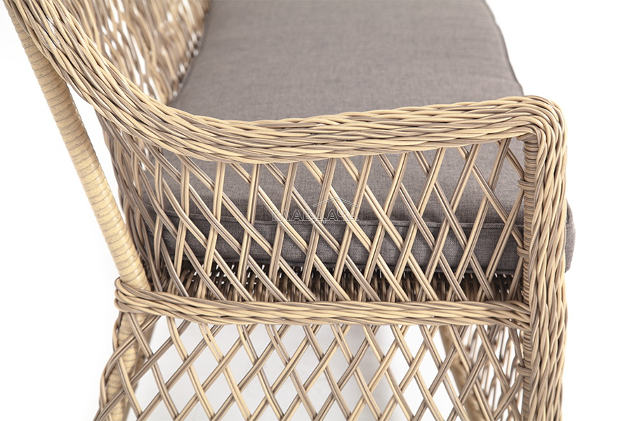 Мебель ручного плетения, которое выполнено из круглого искусственного ротанга. Представлена в соломенном цвете.