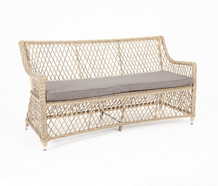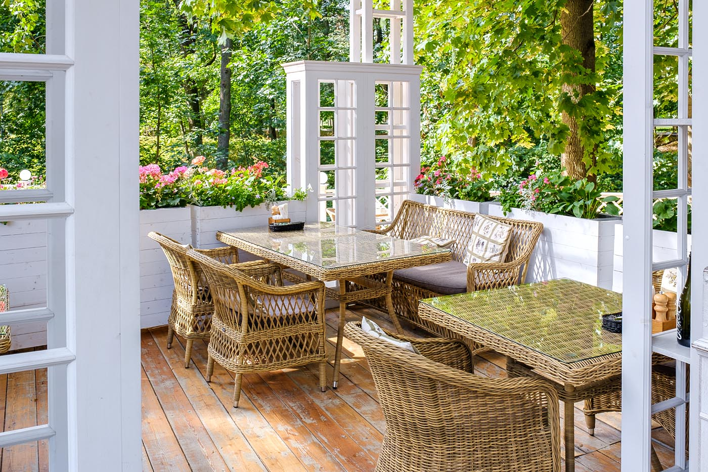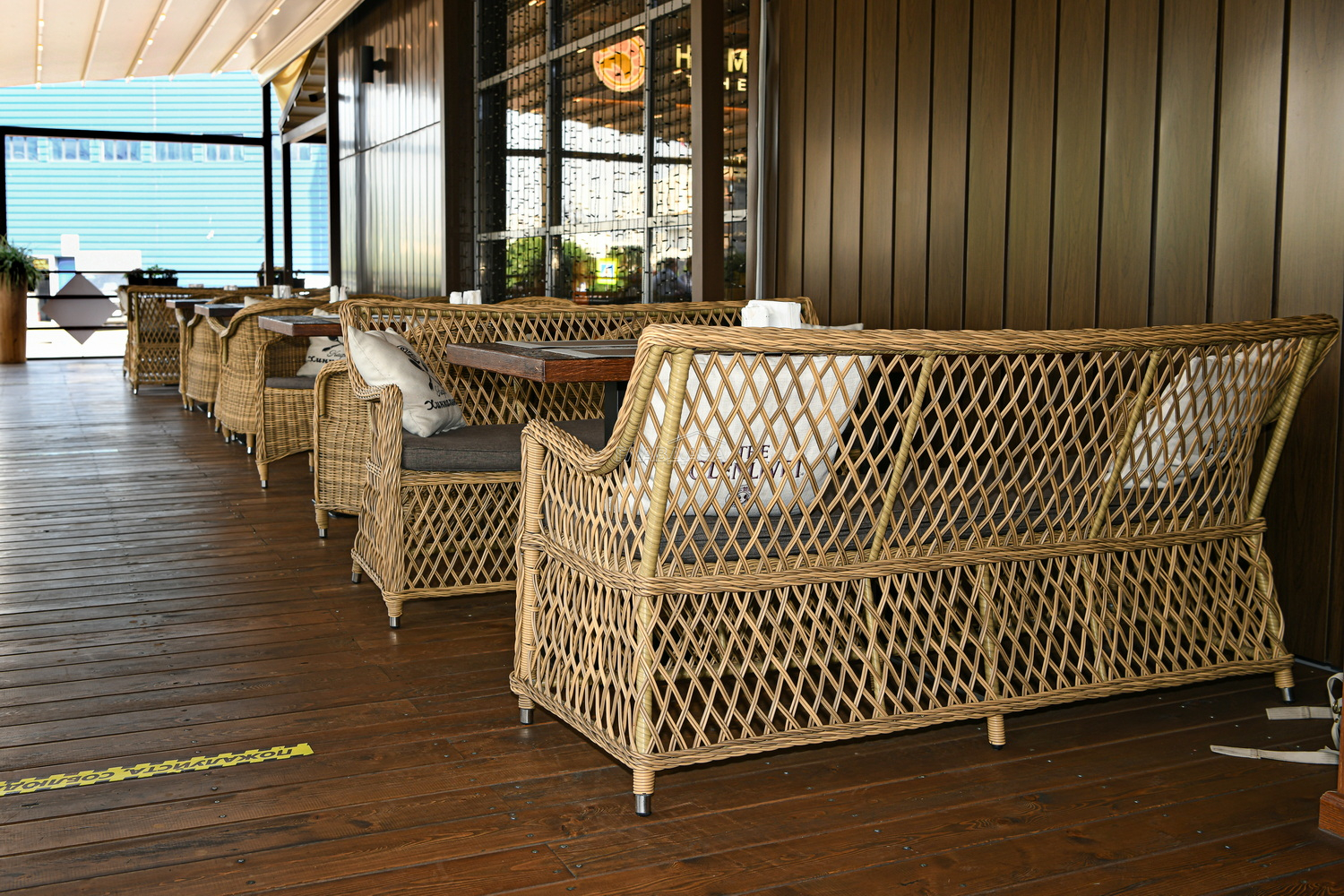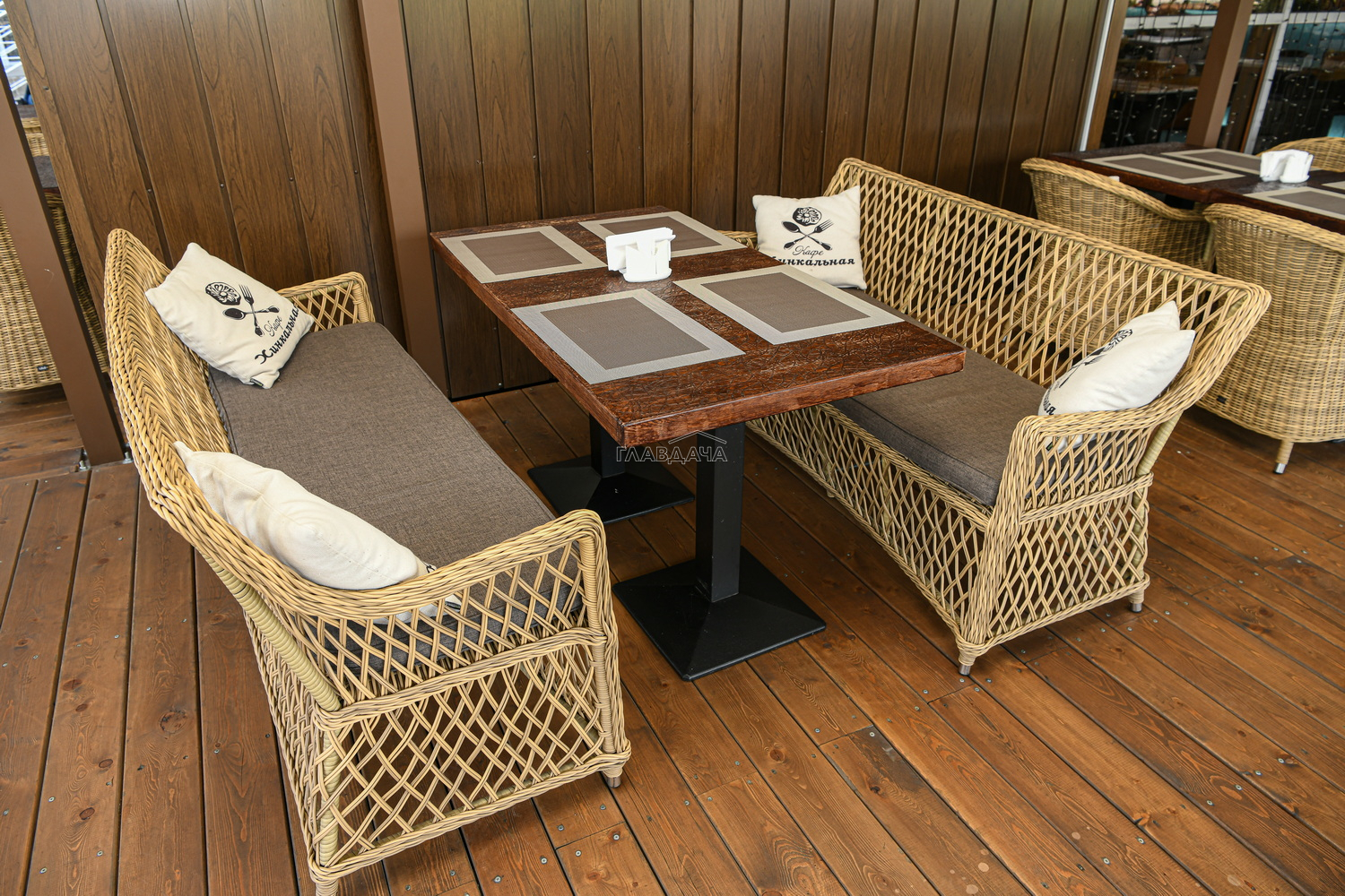Мебель ручного плетения, которое выполнено из круглого искусственного ротанга. Представлена в соломенном цвете.