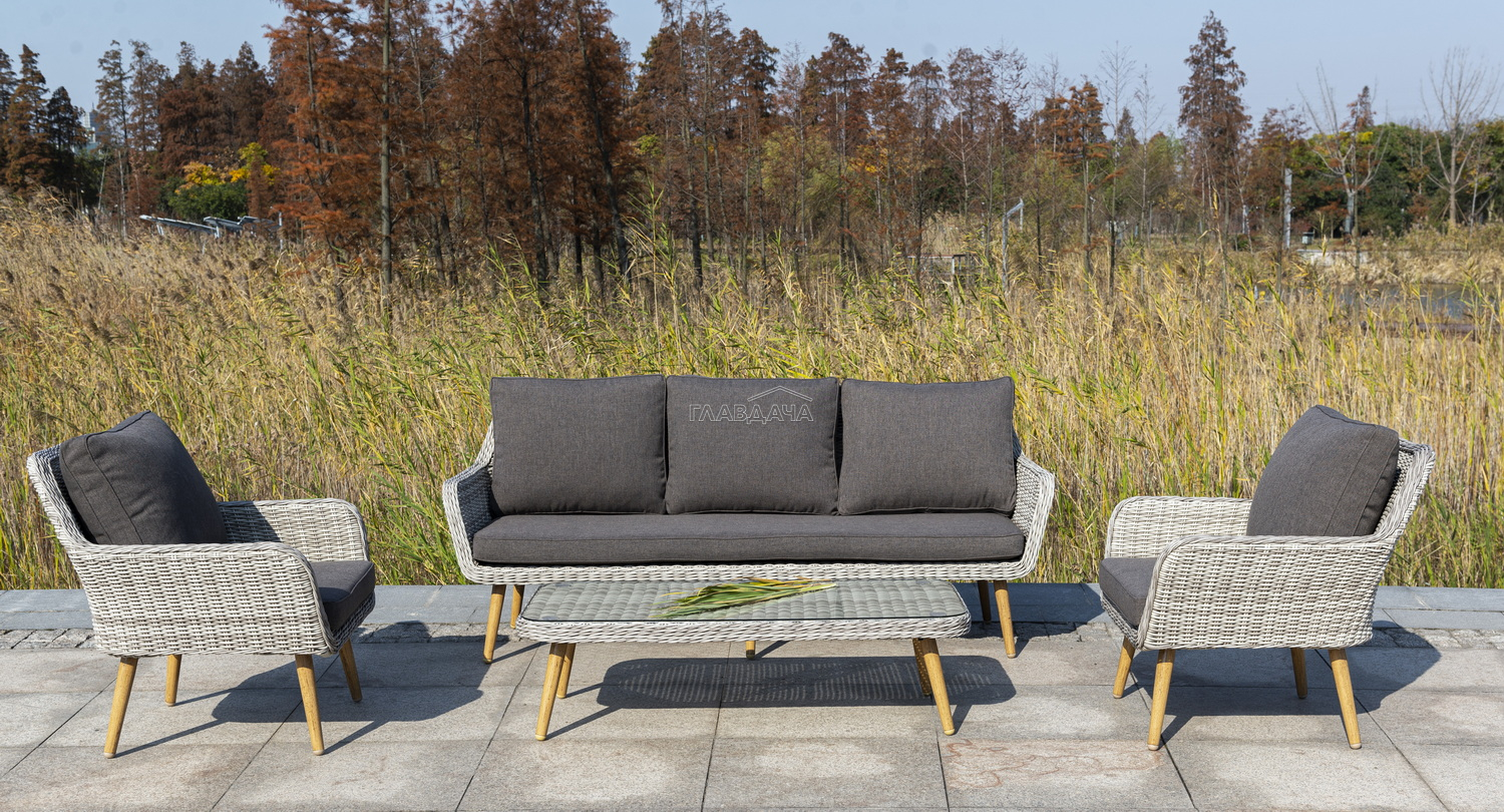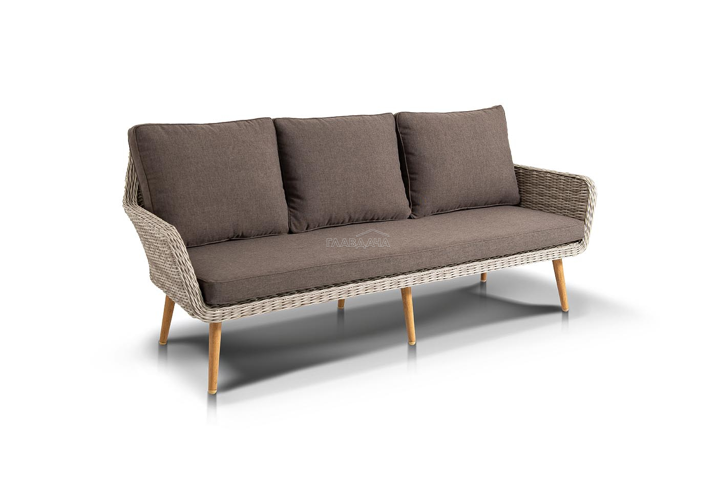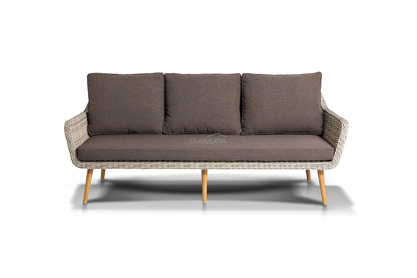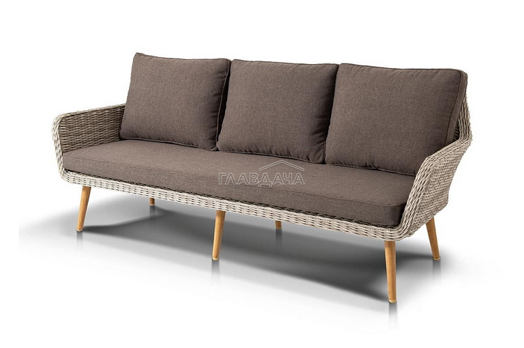 Трехместный диван дополняют мягкие подушки в сером цвете со съёмными чехлами. Тканевые изделия выполнены из прочного полиэстера плотностью 300гр/м2. Материал имеет влагоотталкивающую пропитку.