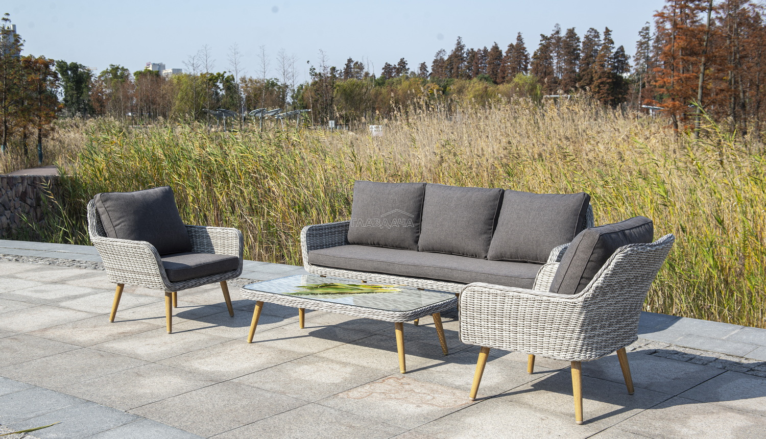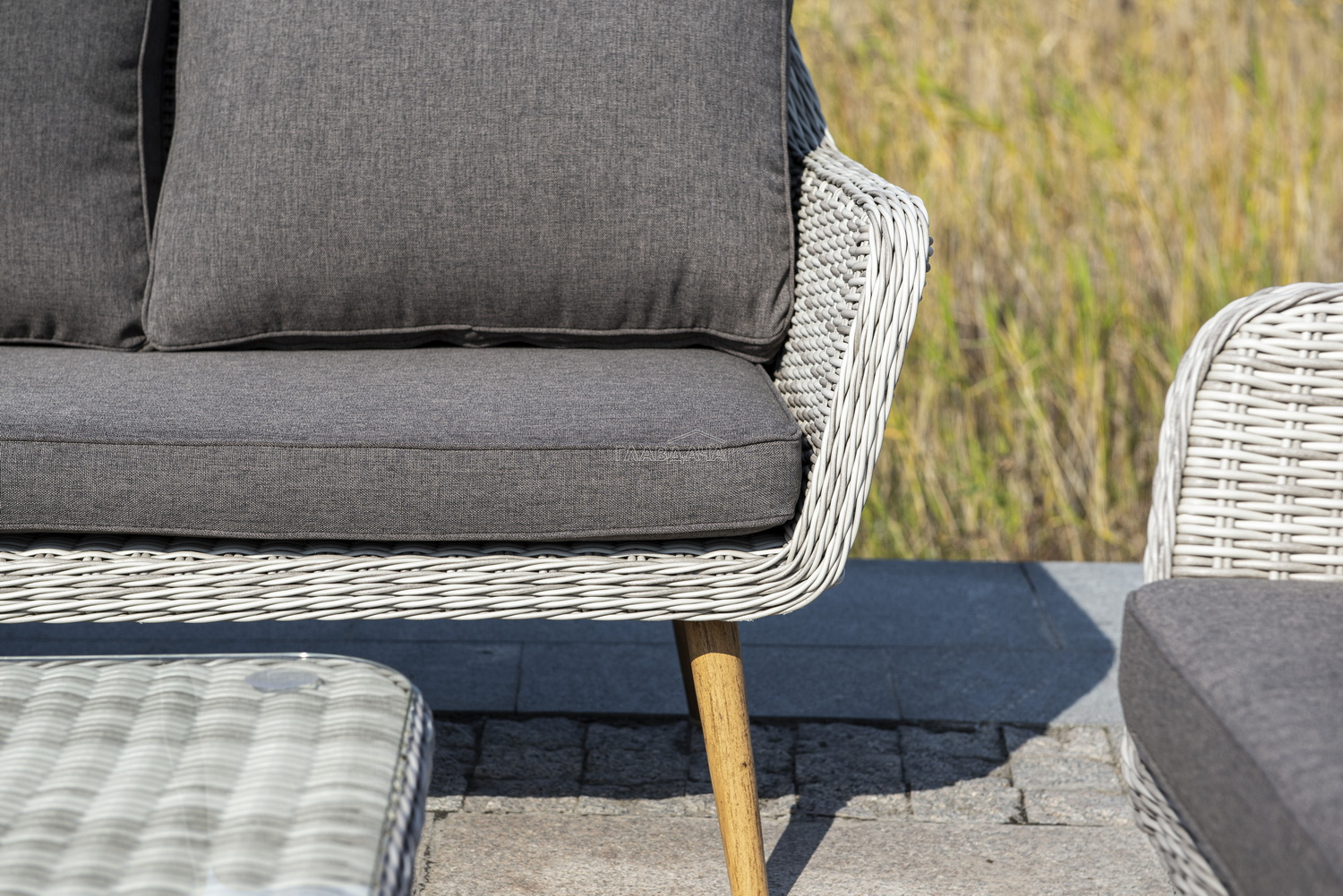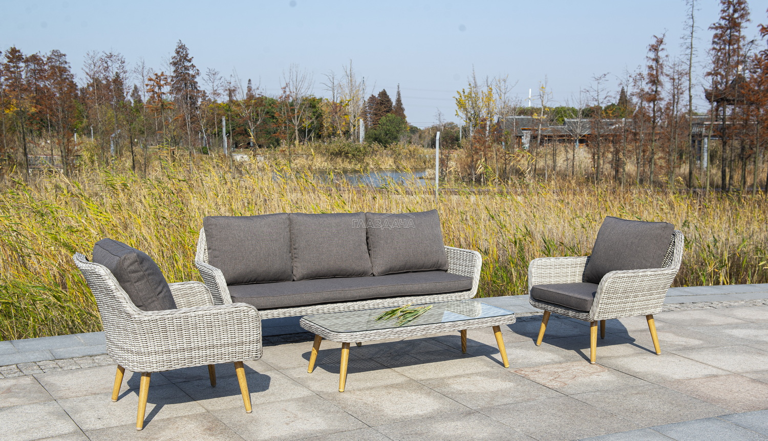 Трехместный диван дополняют мягкие подушки в сером цвете со съёмными чехлами. Тканевые изделия выполнены из прочного полиэстера плотностью 300гр/м2. Материал имеет влагоотталкивающую пропитку.