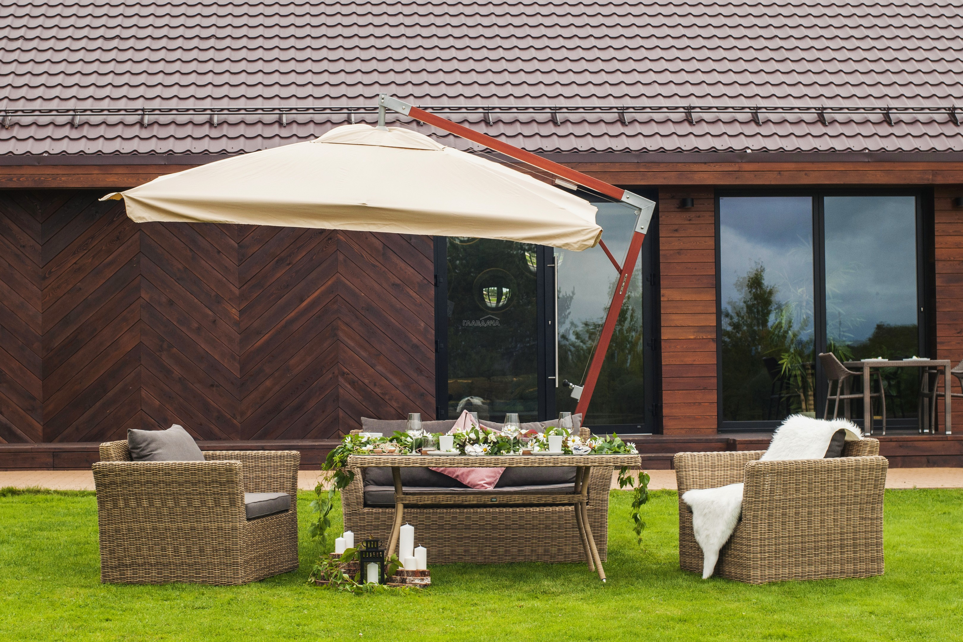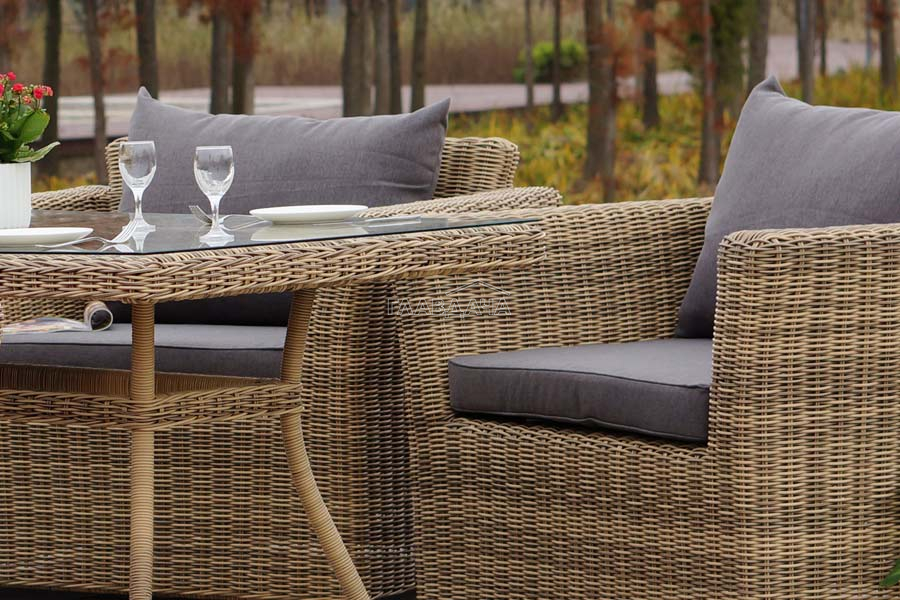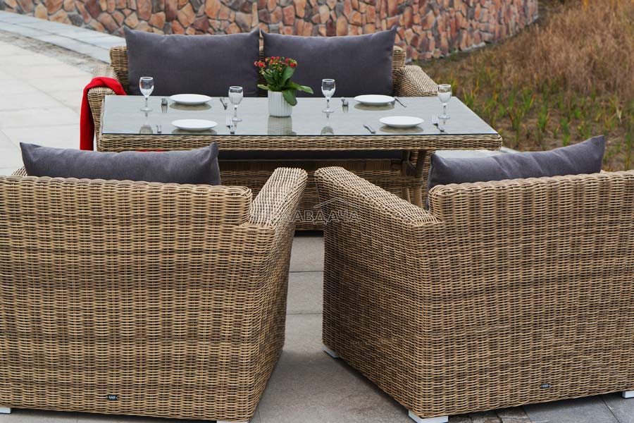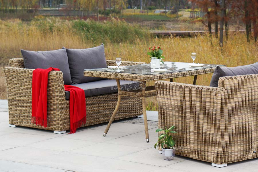Мебель изготовлена из легкого, но прочного алюминия, оплетенного долговечным искусственным ротангом природного соломенного оттенка. На диване и креслах предусмотрены подушки с чехлами из полиэстера серого цвета. Съёмные чехлы пропитаны специальными влагоотталкивающими средствами, которые способы защитить от намокания.
