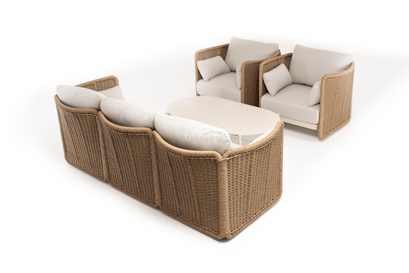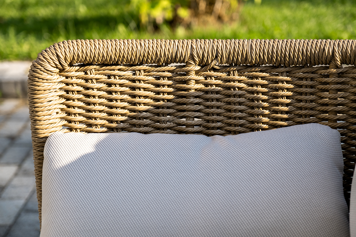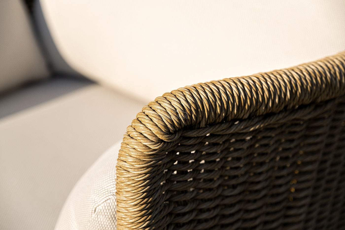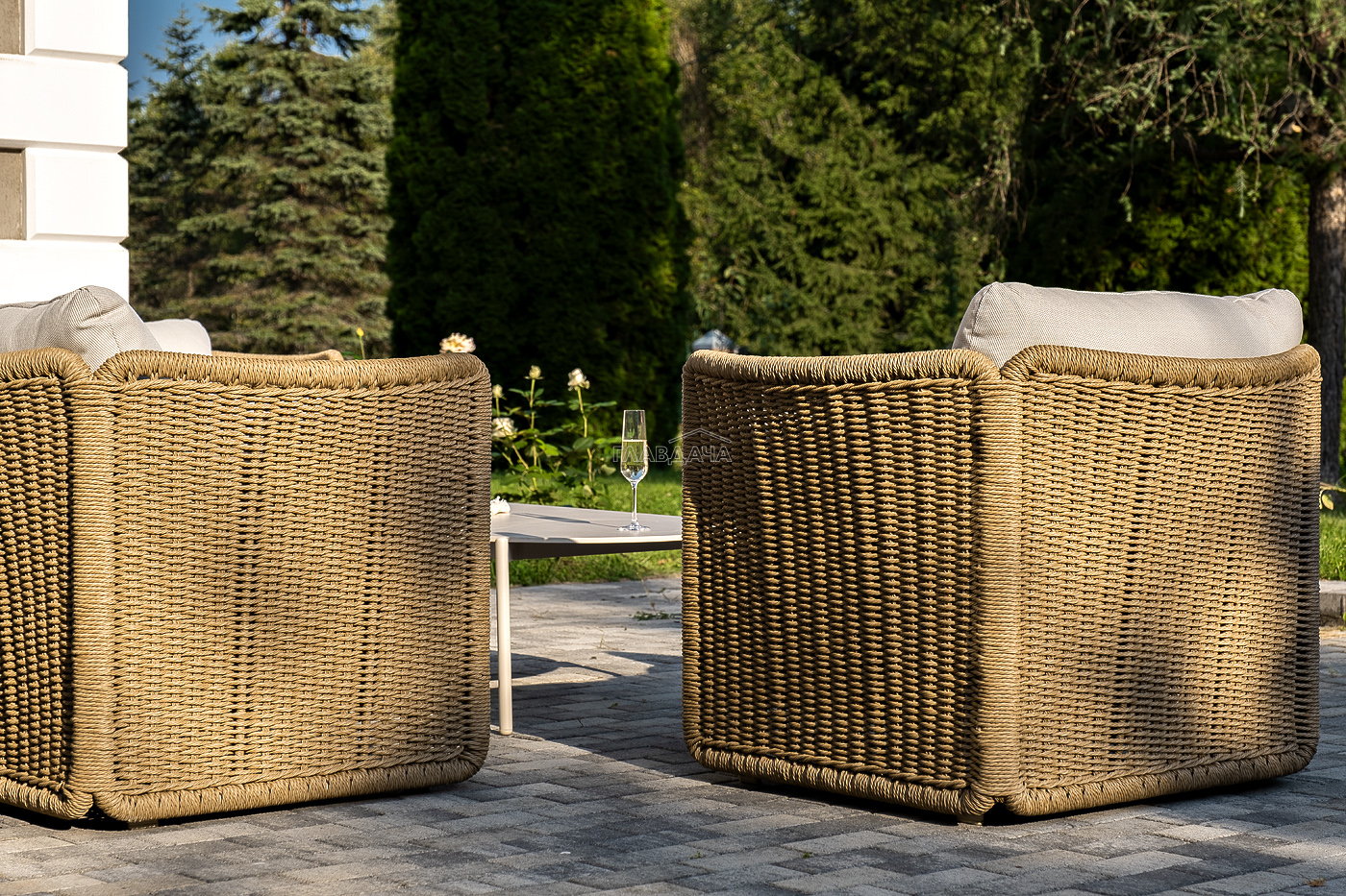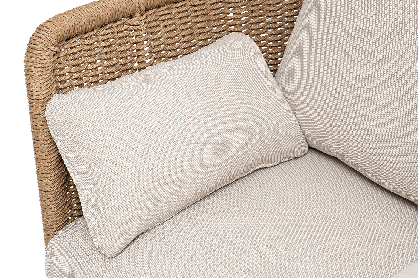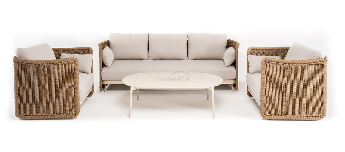 Плетеная мебель дополнена удобными подушками в бежевых чехлах. При их изготовлении используют полиэстер, плотность – 300гр/м2. Он обрабатывается влагоотталкивающей пропиткой для повышения защитных свойств материала.