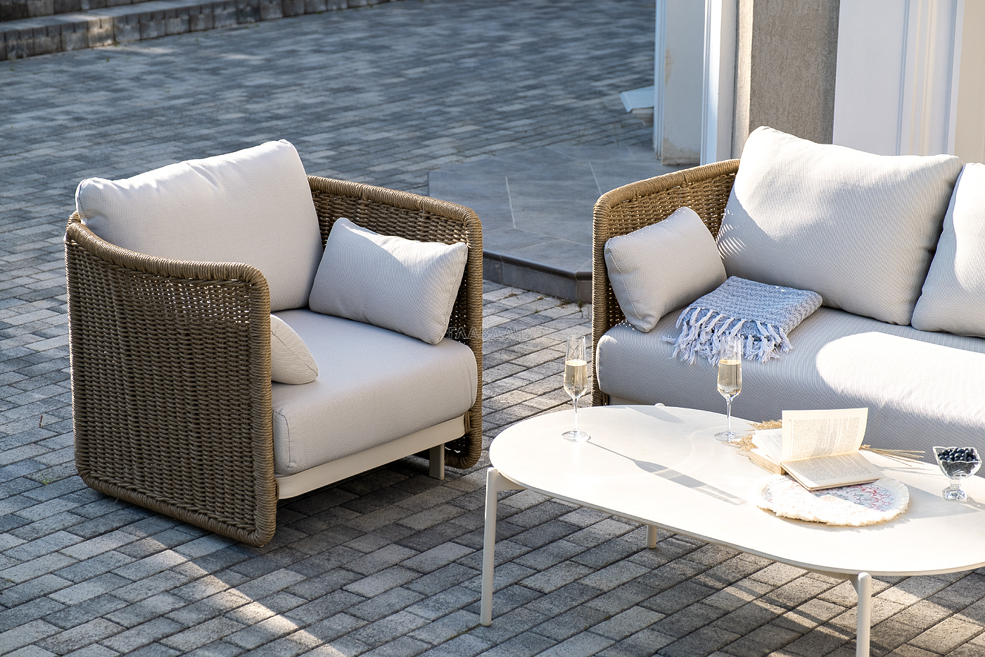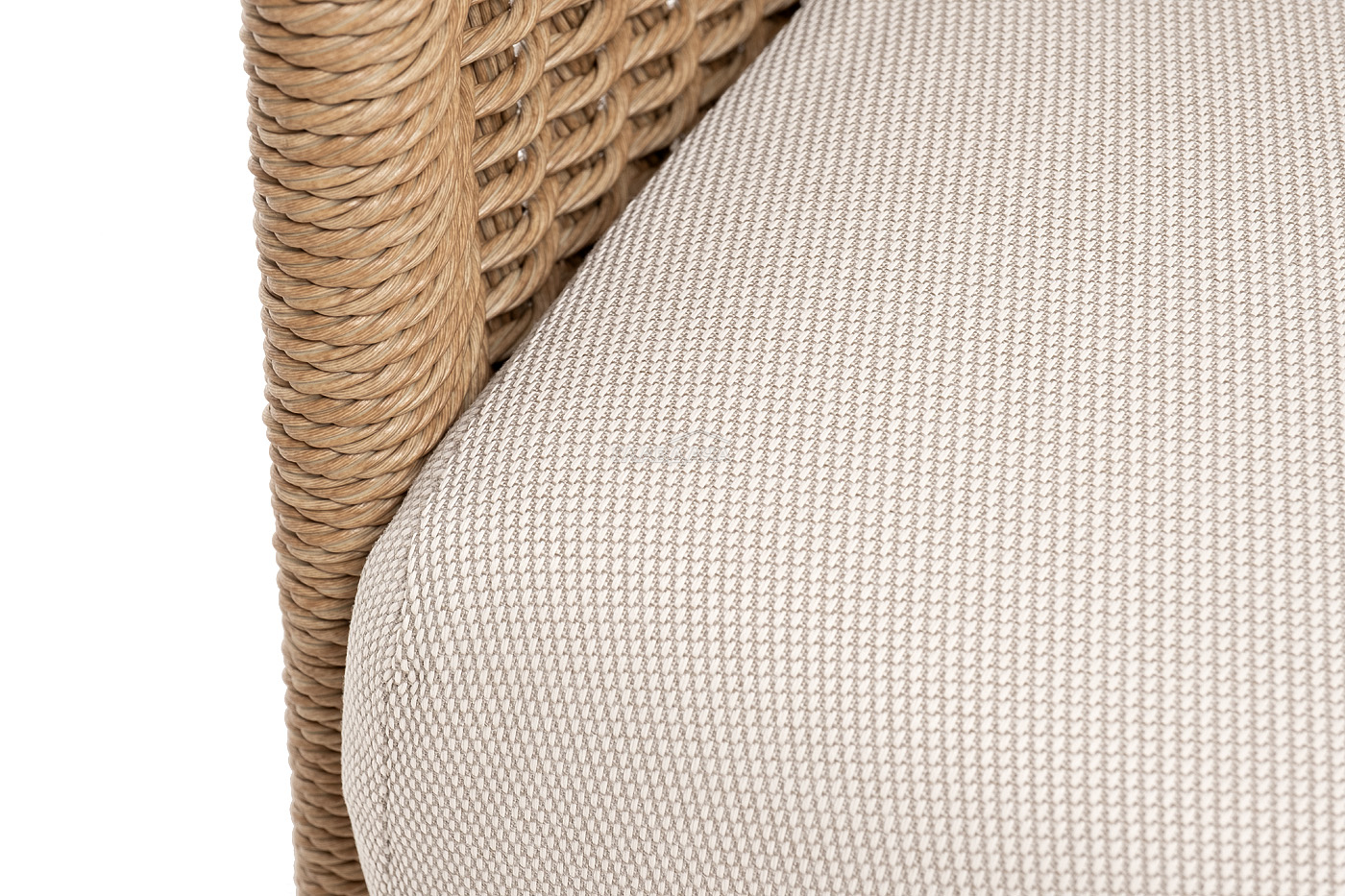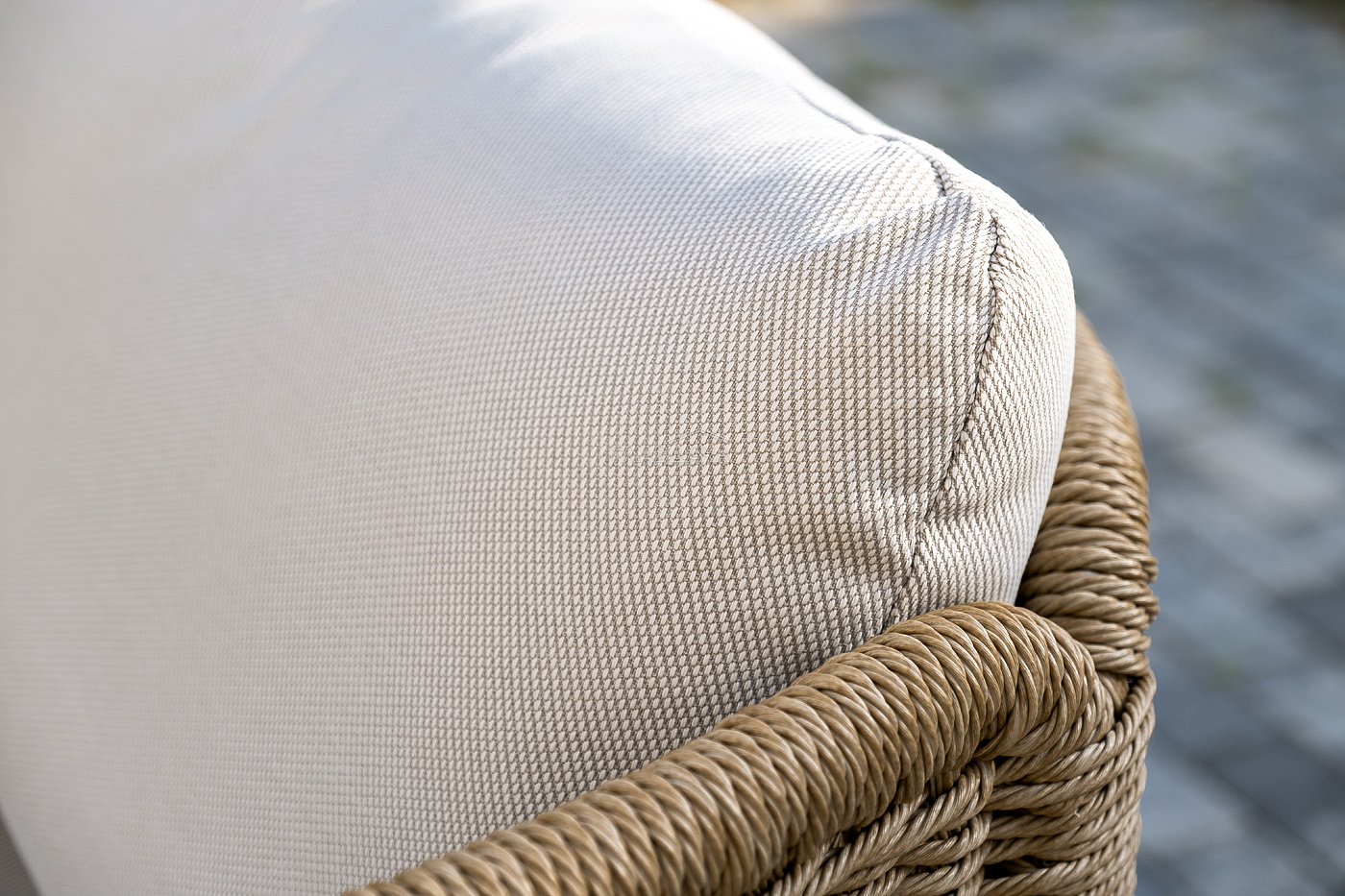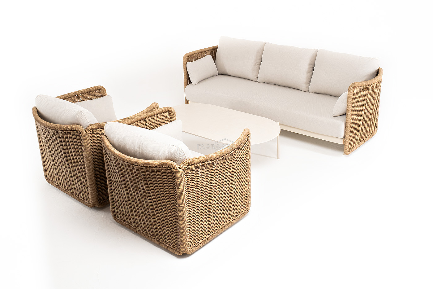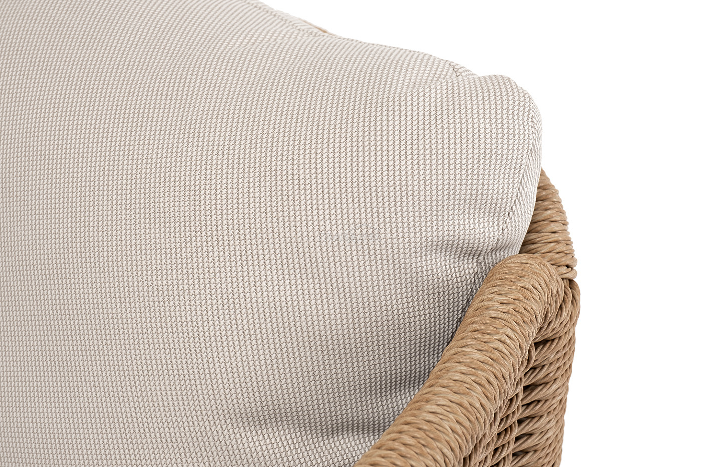 Плетеная мебель дополнена удобными подушками в бежевых чехлах. При их изготовлении используют полиэстер, плотность – 300гр/м2. Он обрабатывается влагоотталкивающей пропиткой для повышения защитных свойств материала.