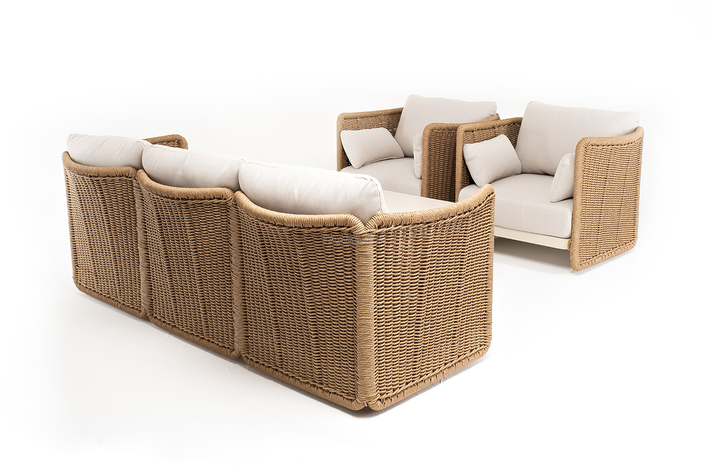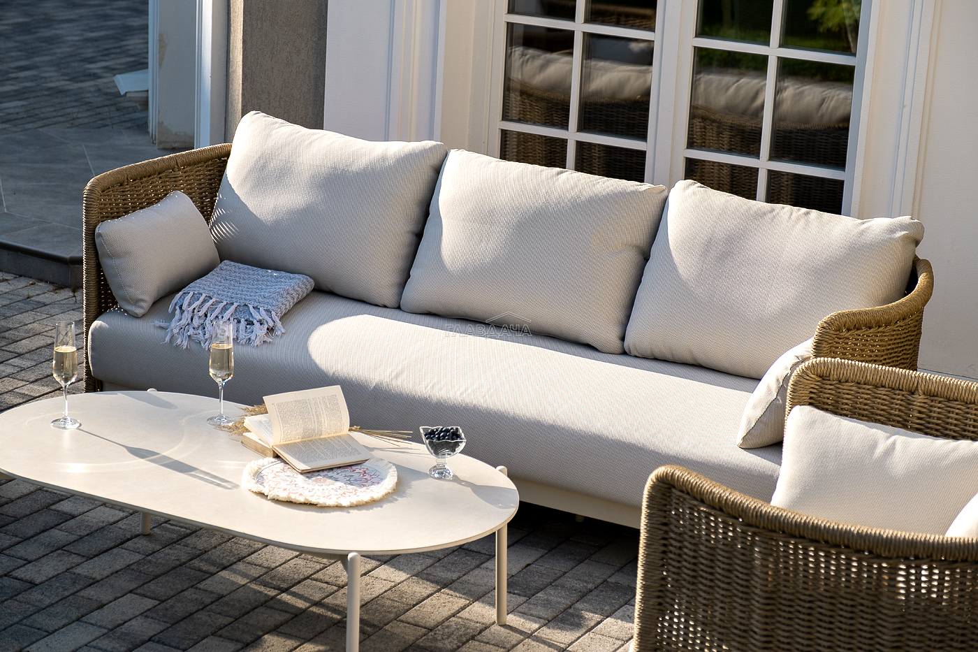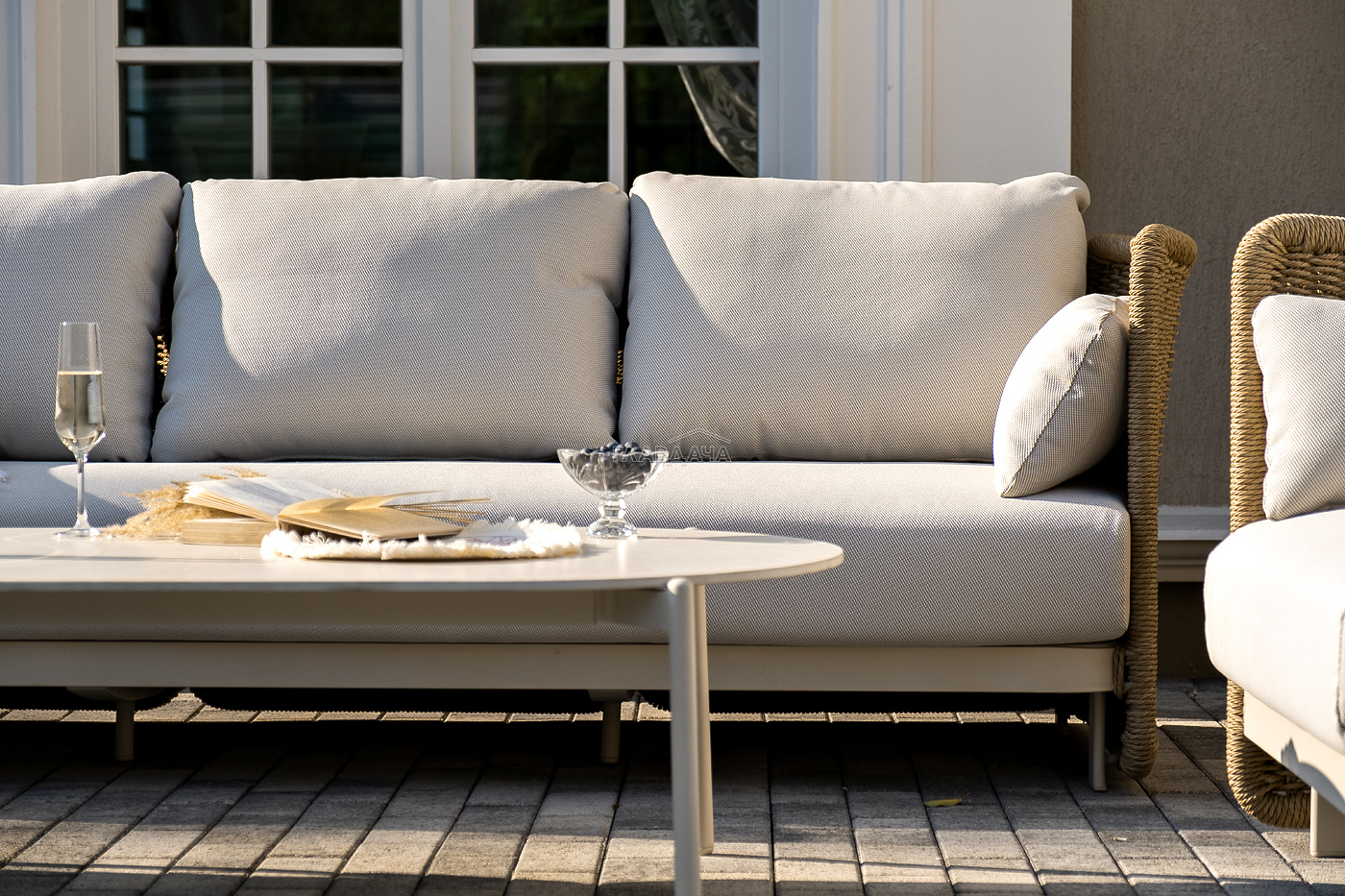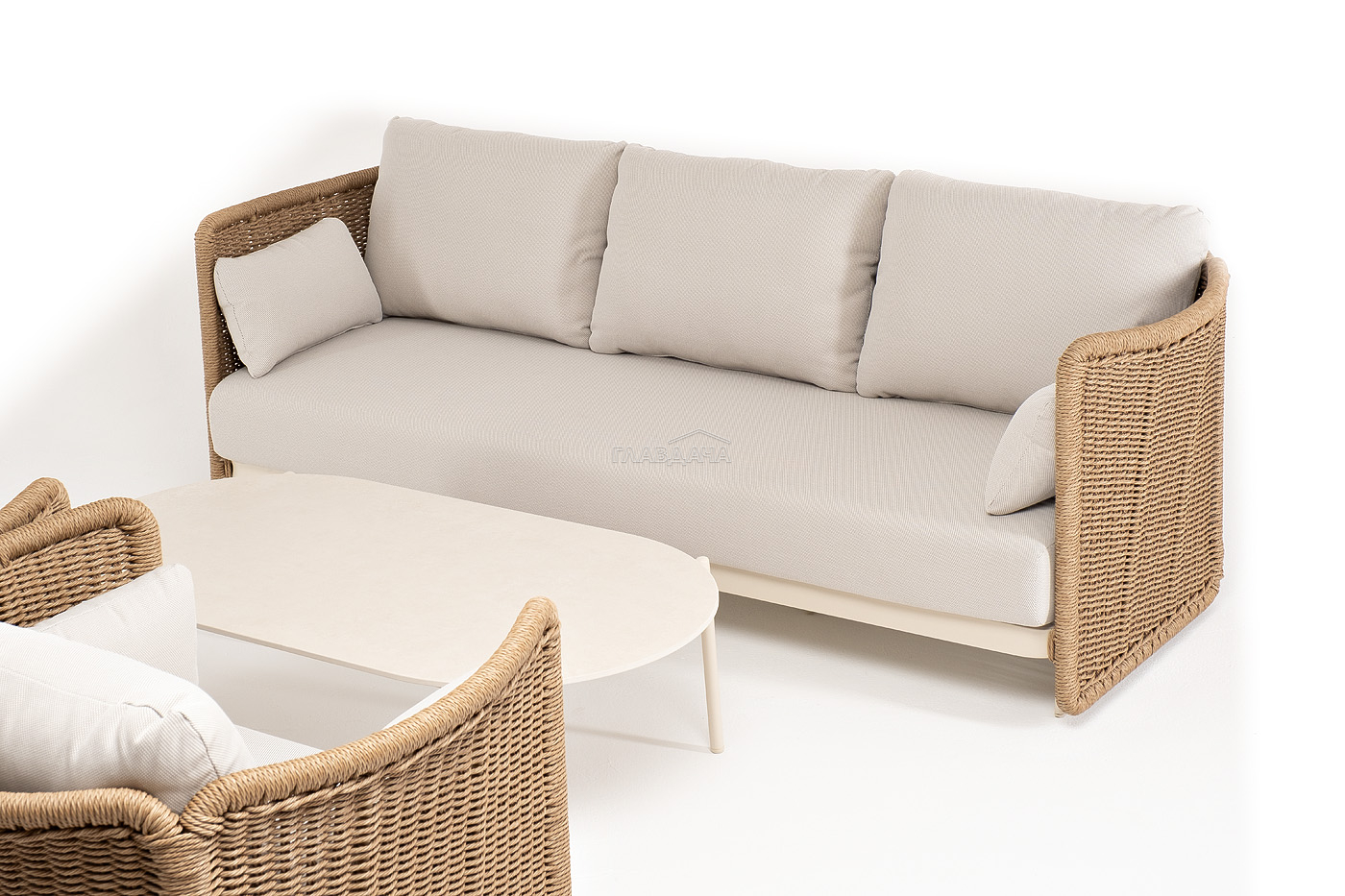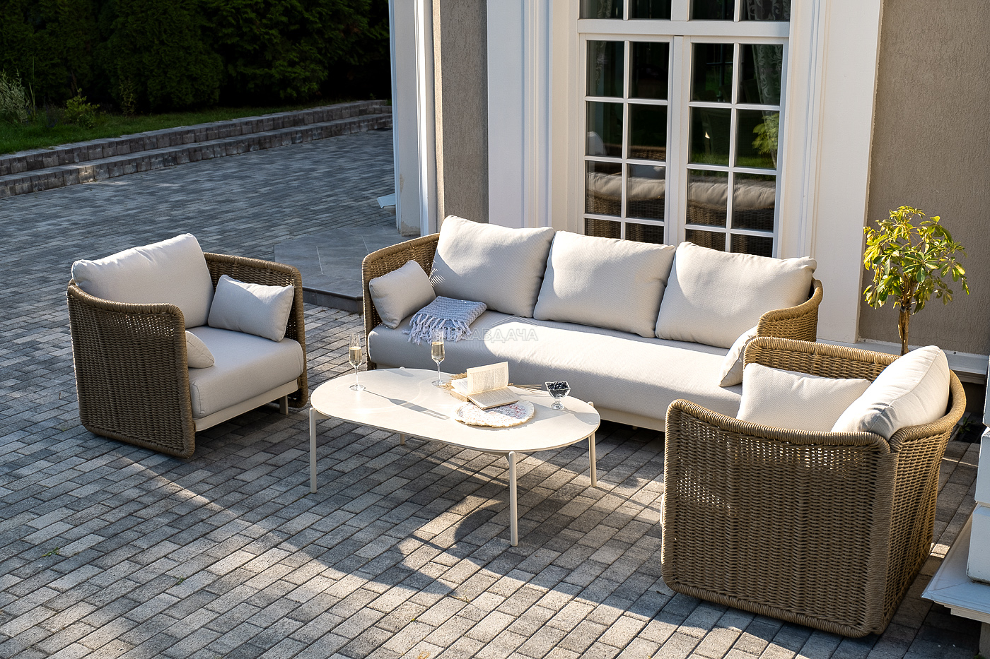 Плетеная мебель дополнена удобными подушками в бежевых чехлах. При их изготовлении используют полиэстер, плотность – 300гр/м2. Он обрабатывается влагоотталкивающей пропиткой для повышения защитных свойств материала.