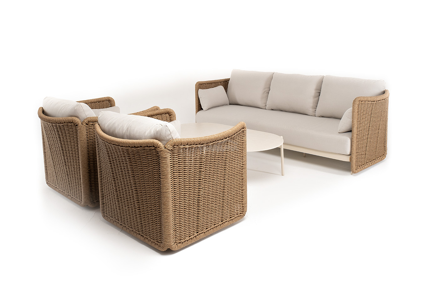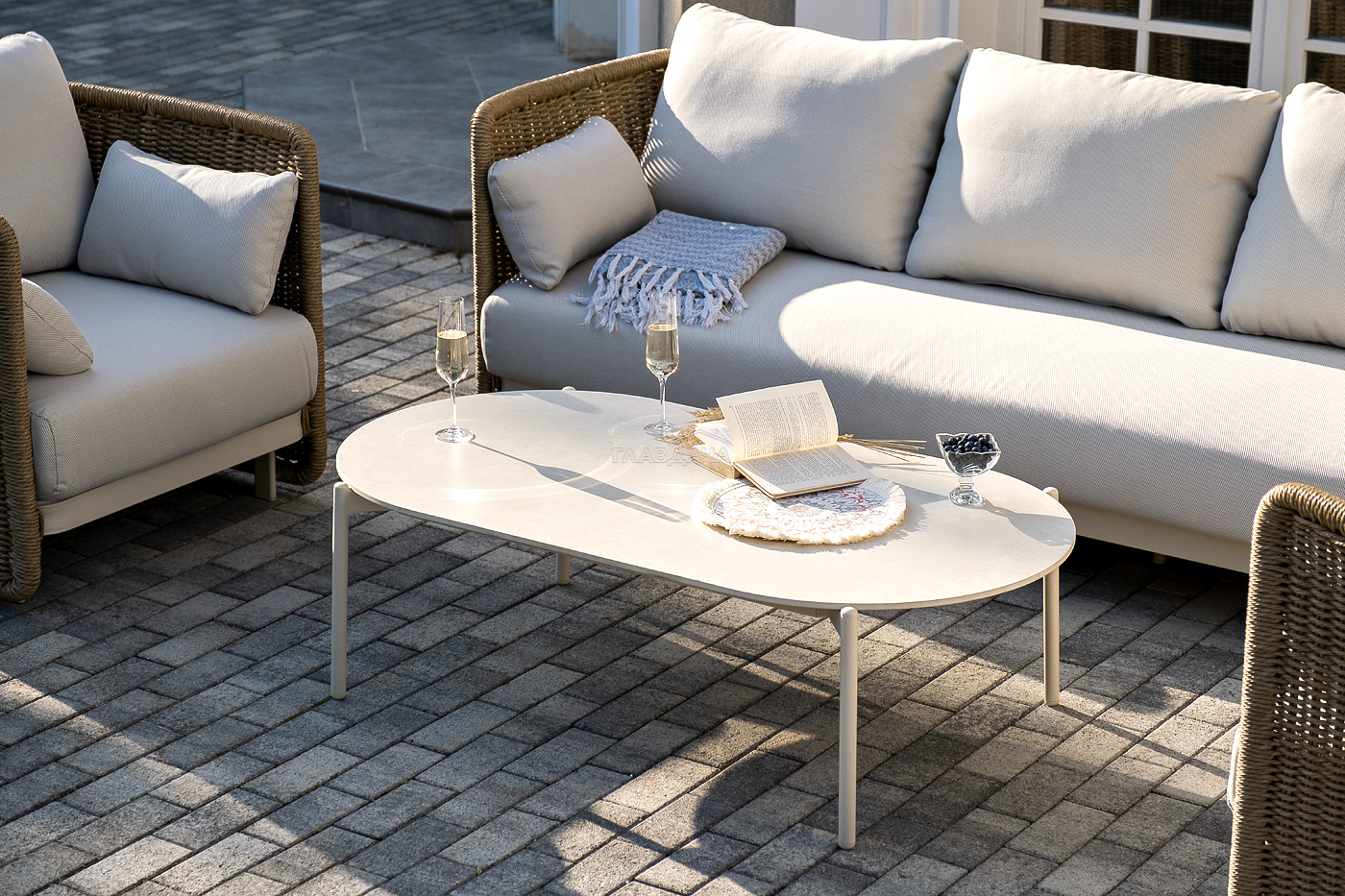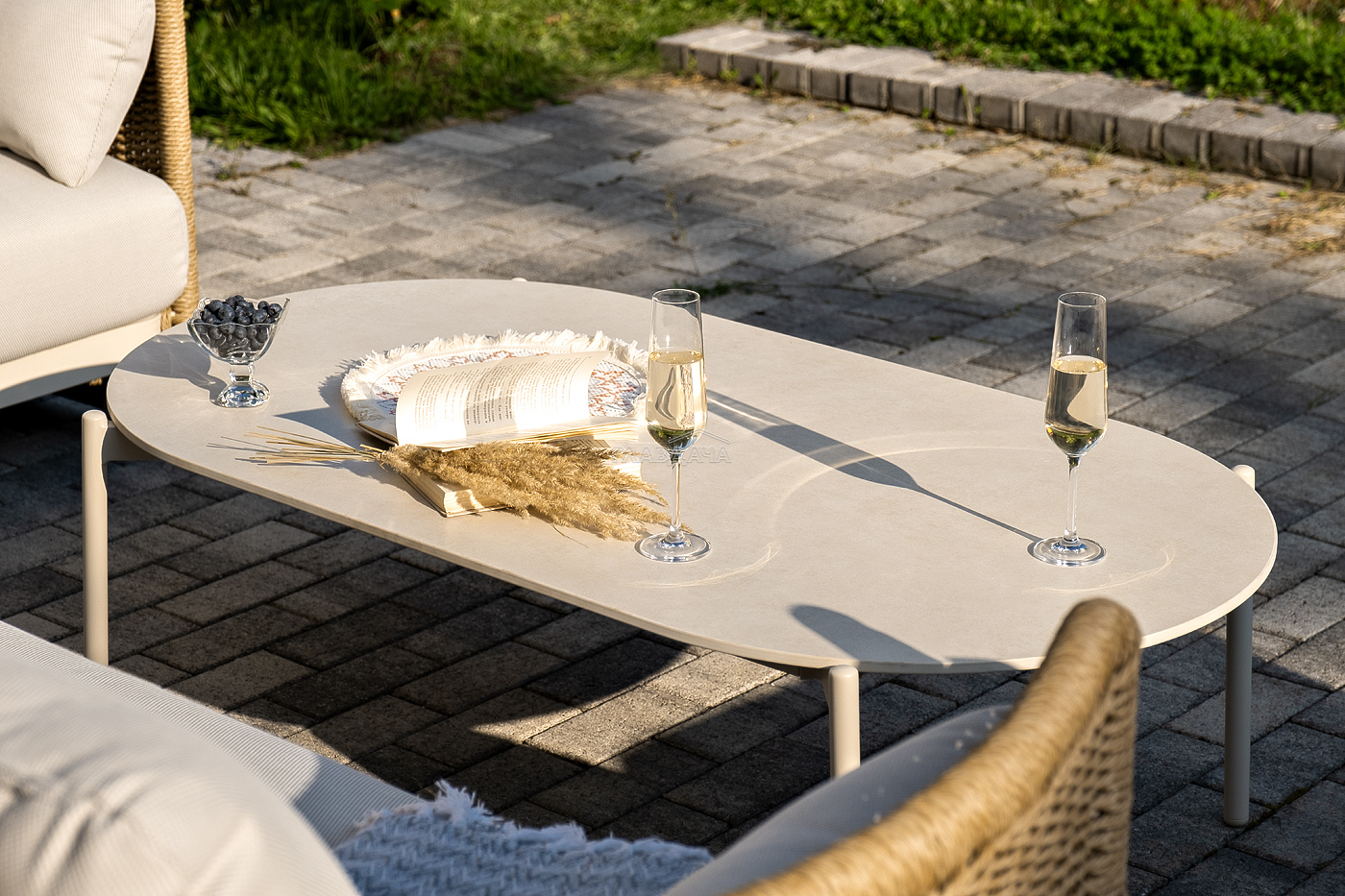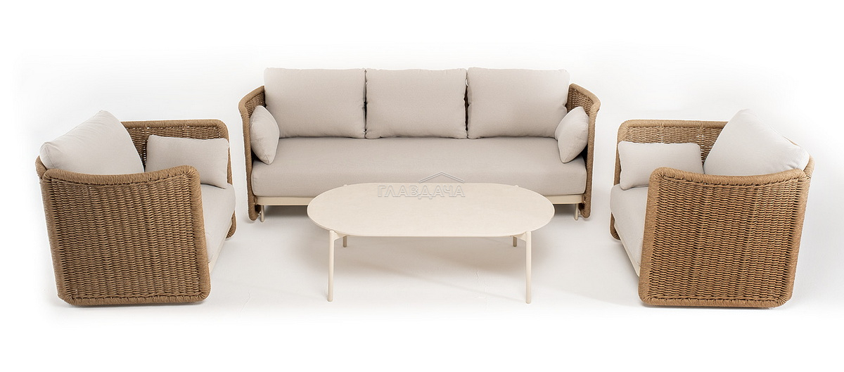 Журнальный столик выполнен из алюминия, окрашенного износостойкой краской, а его оплетка выполнена из круглого искусственного ротанга ручного плетения - 7 мм соломенного цвета. Столешница - овальная, выполнена из искусственного камня белового цвета.