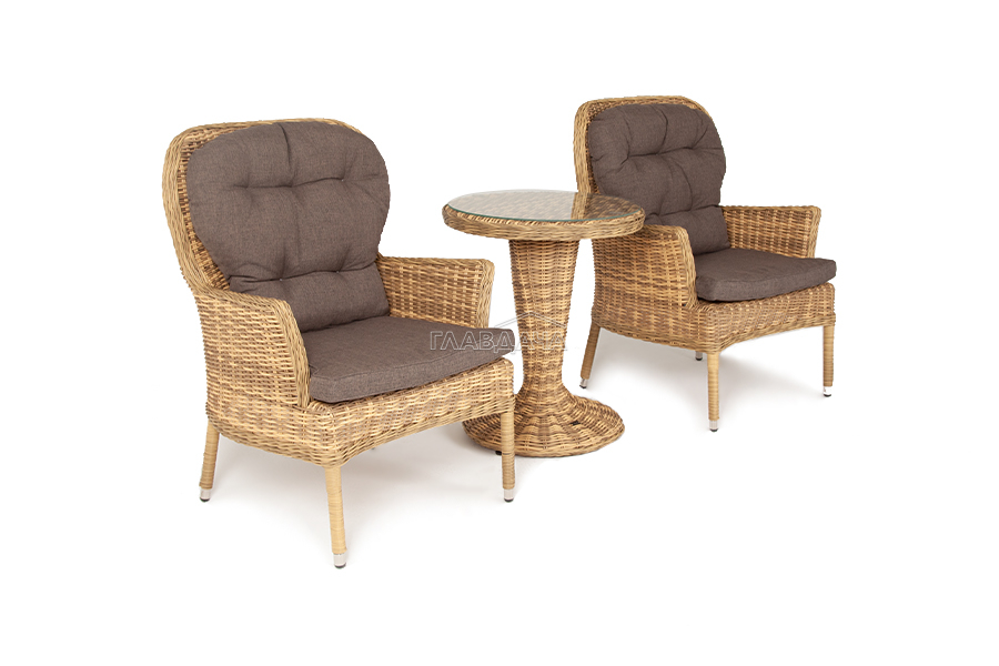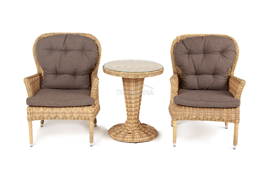 Плетение выполнено вручную искусственным ротангом соломенного цвета, кресло укомплектовано подушками из 100% полиэстера, которые пропитаны специальным составом, обладающим влагоотталкивающим свойством.
