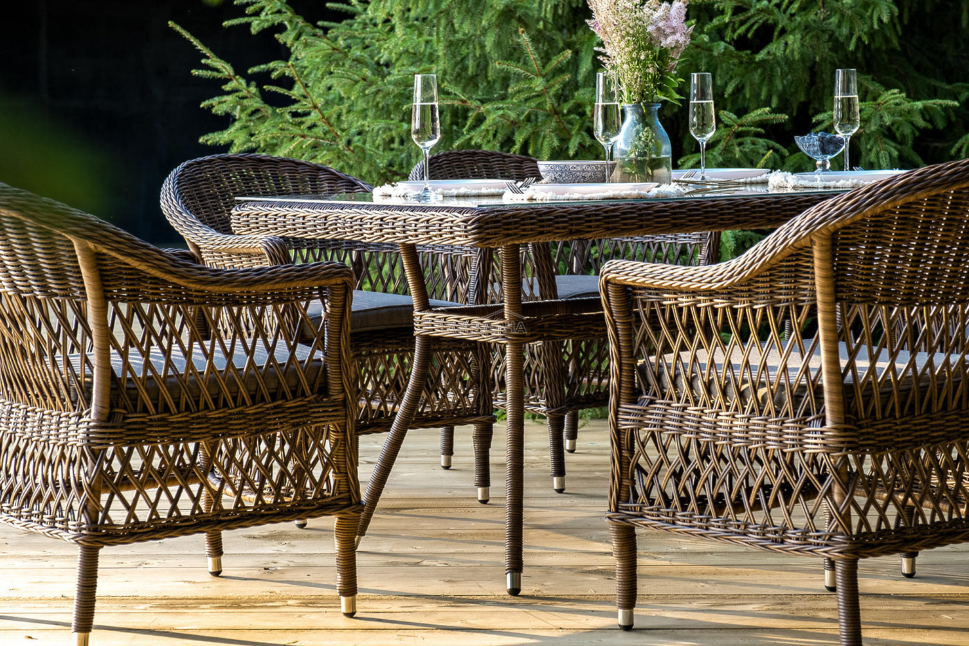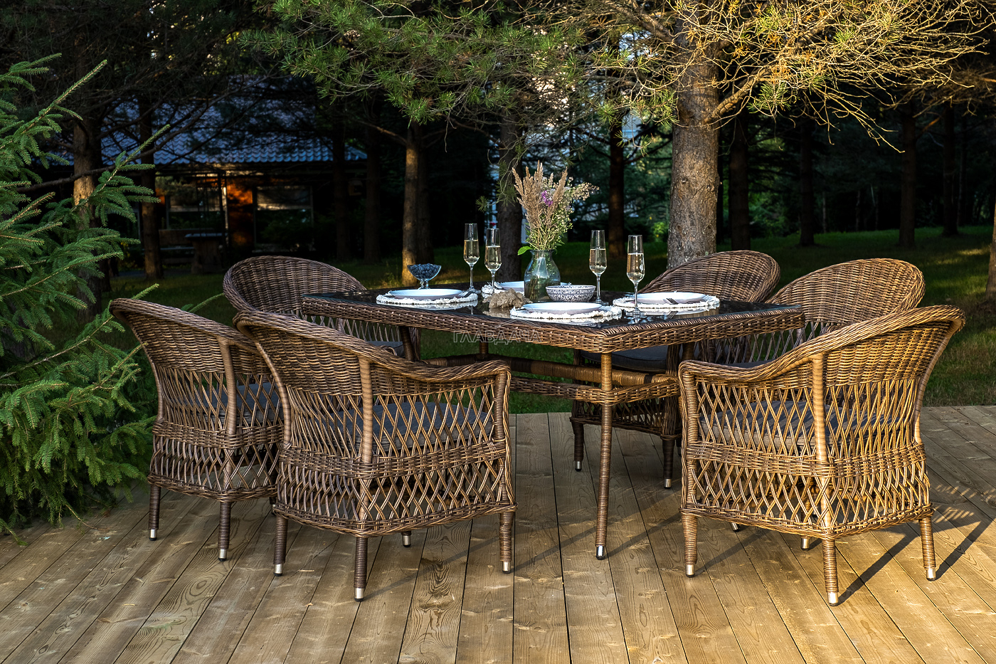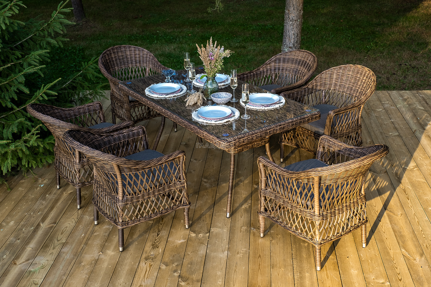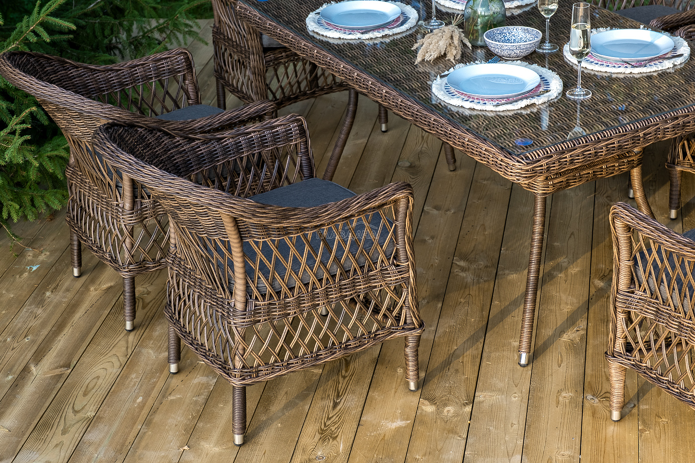 Обеденная группа «Амароне» относится к числу садовой мебели для обустройства открытых террас и веранд.