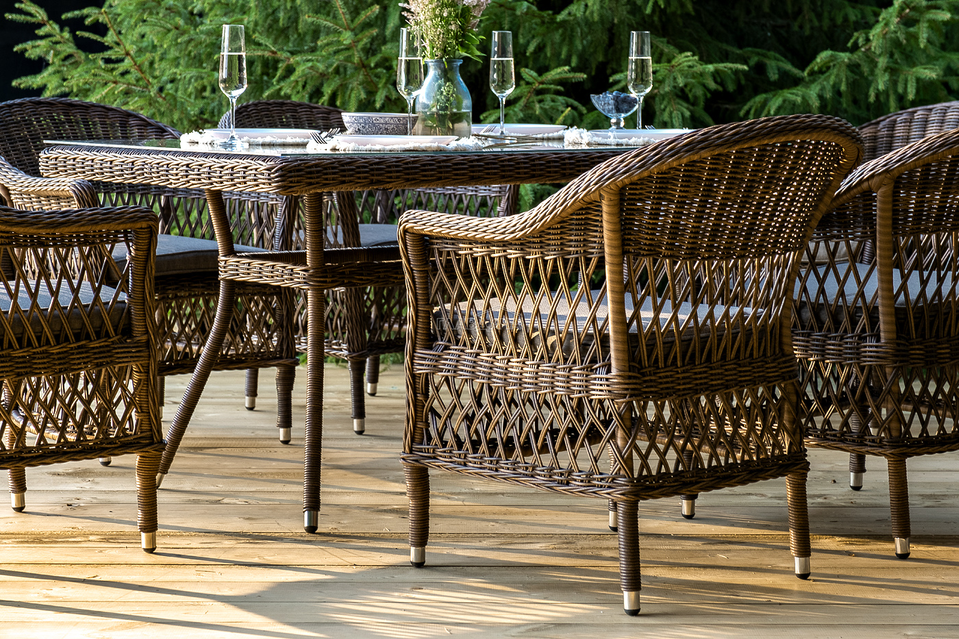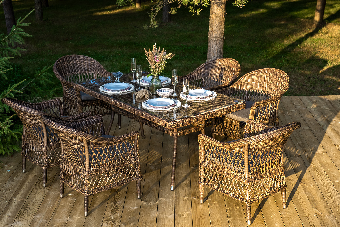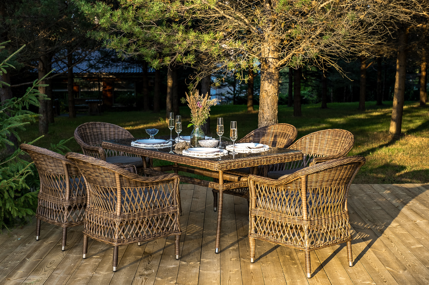 Обеденная группа «Амароне» относится к числу садовой мебели для обустройства открытых террас и веранд.