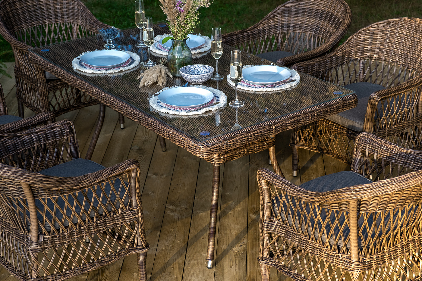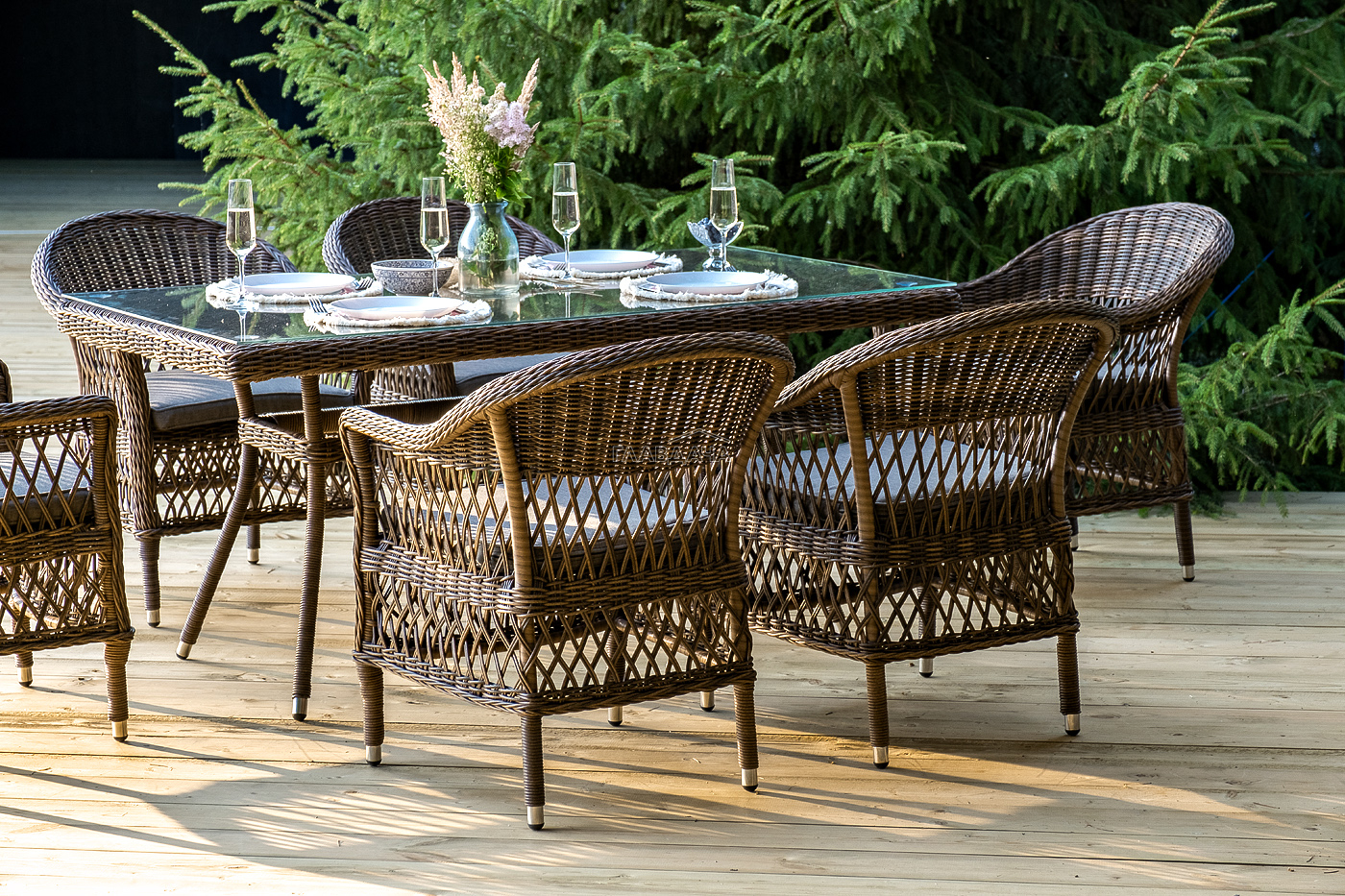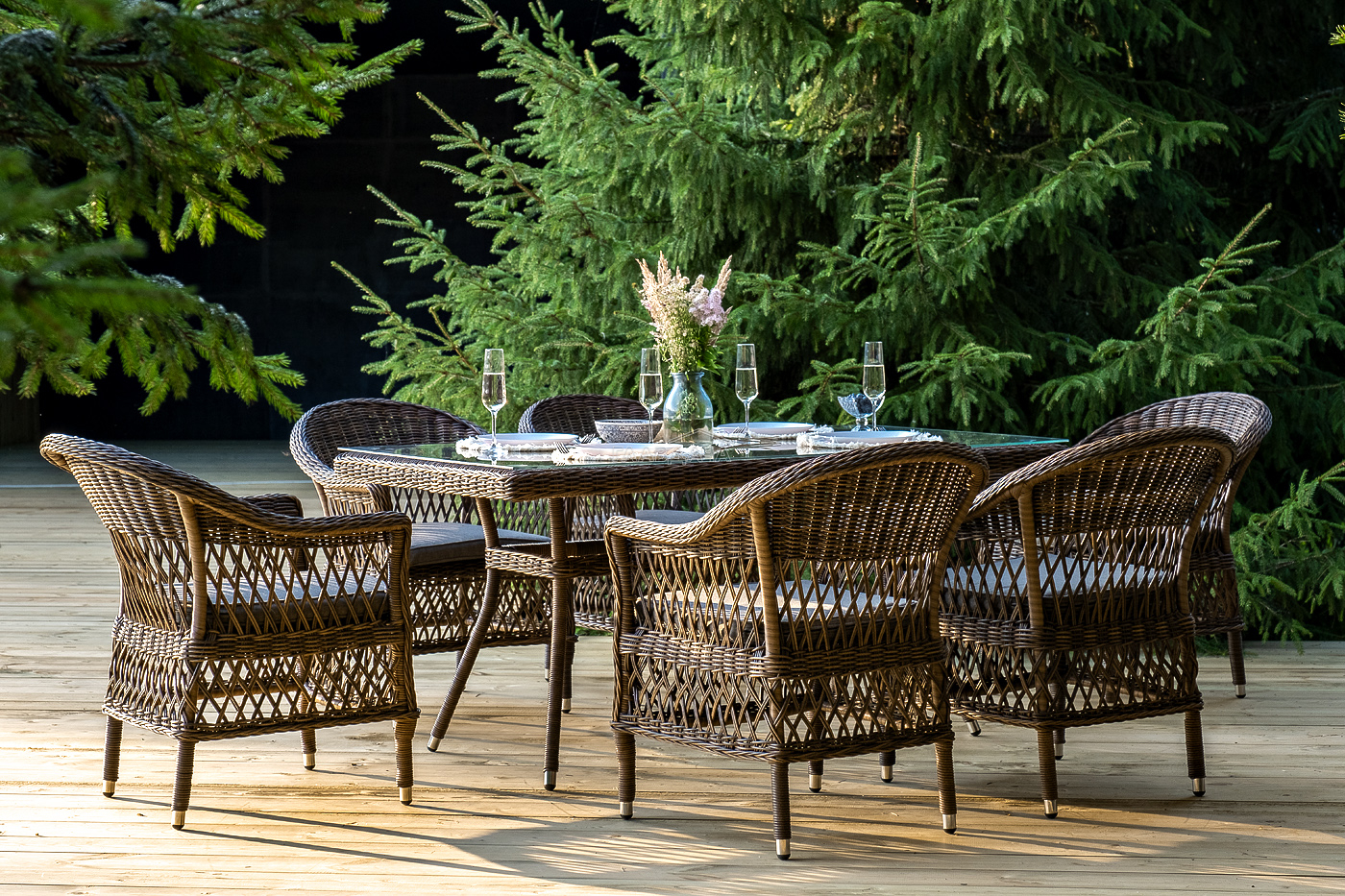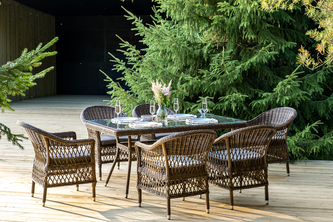 Обеденная группа «Амароне» относится к числу садовой мебели для обустройства открытых террас и веранд.