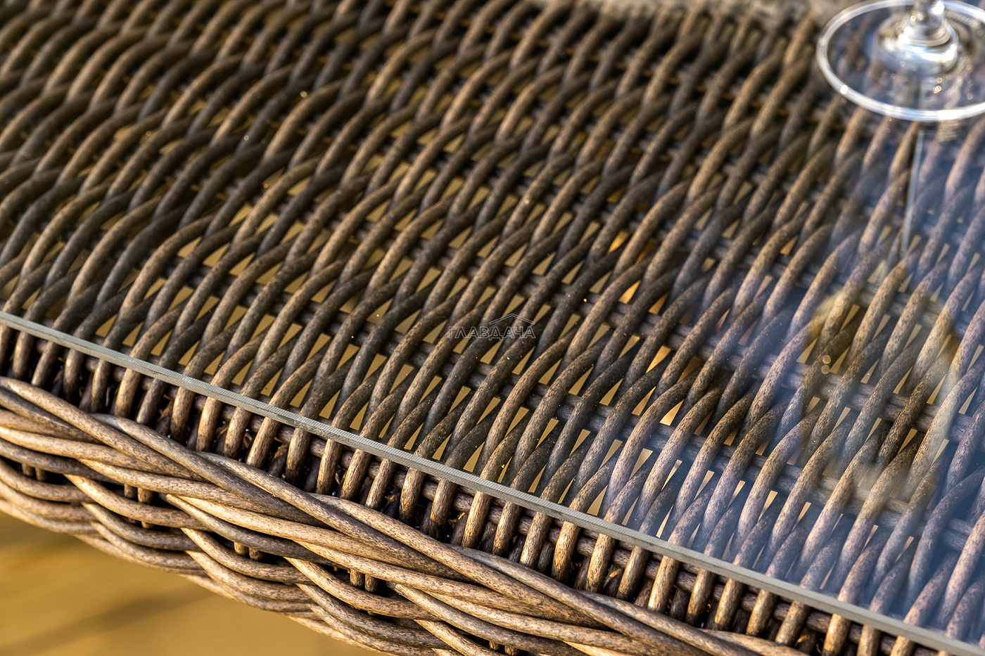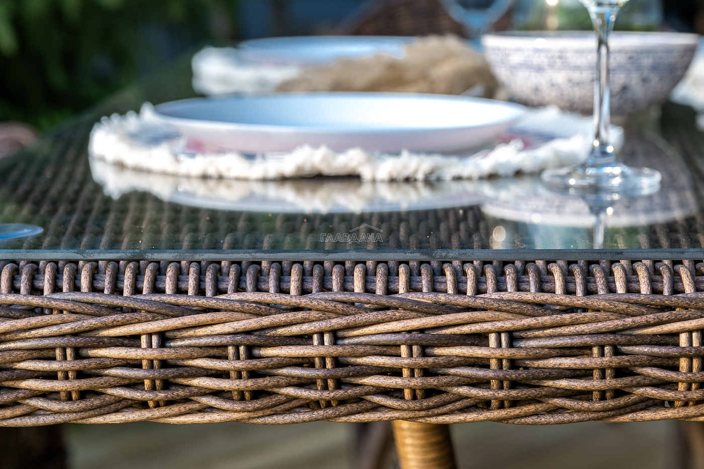 В качестве рабочей поверхности плетеного обеденного стола выступает стеклянная столешница, которая крепится при помощи вакуумных силиконовых держателей и поставляется в собранном виде.