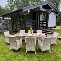Включает в себя шесть кресел из искусственного ротанга на стальном каркасе и прочный стол.
