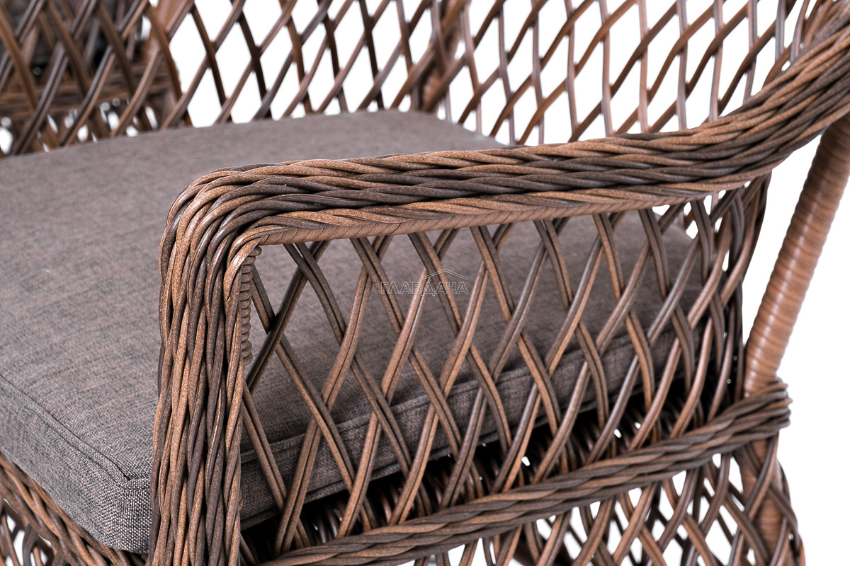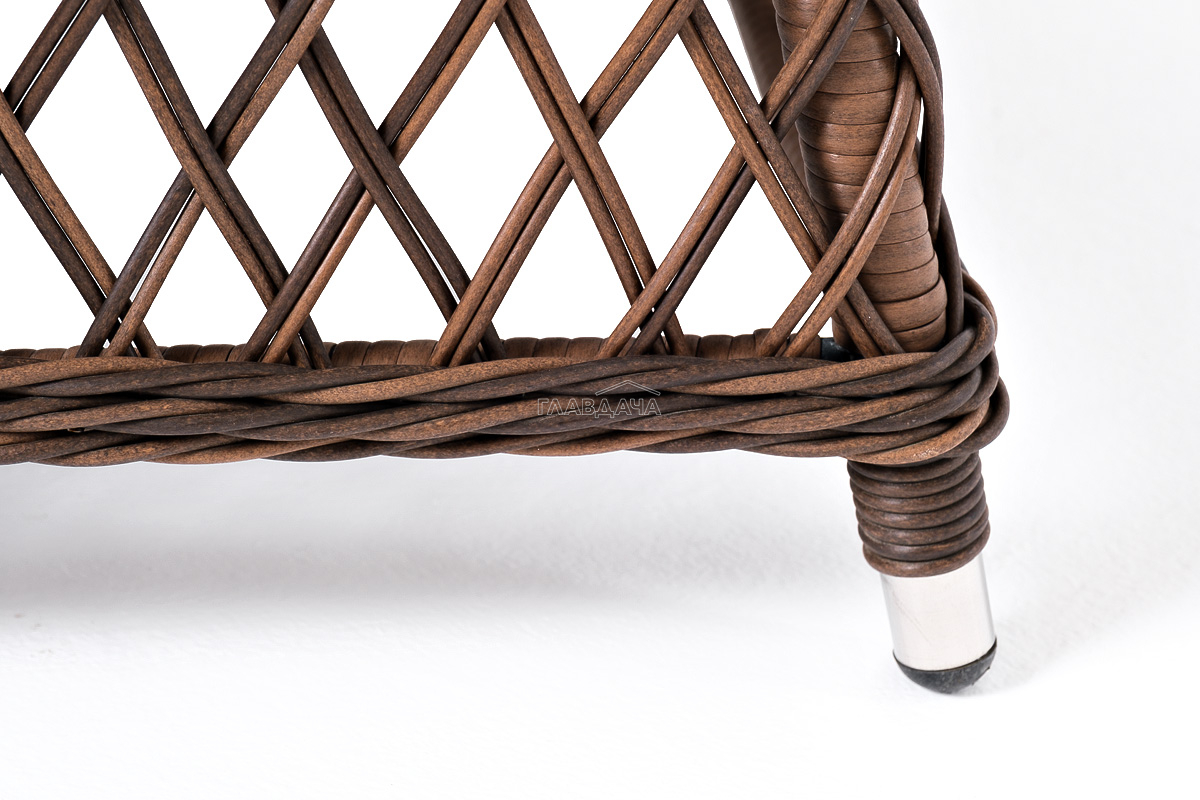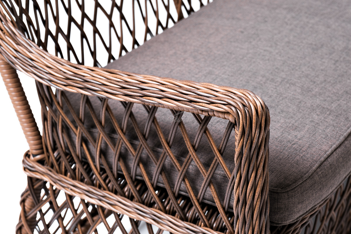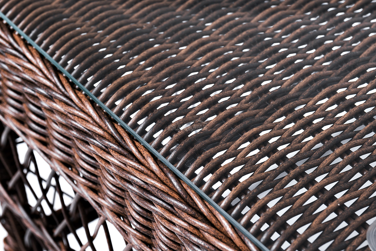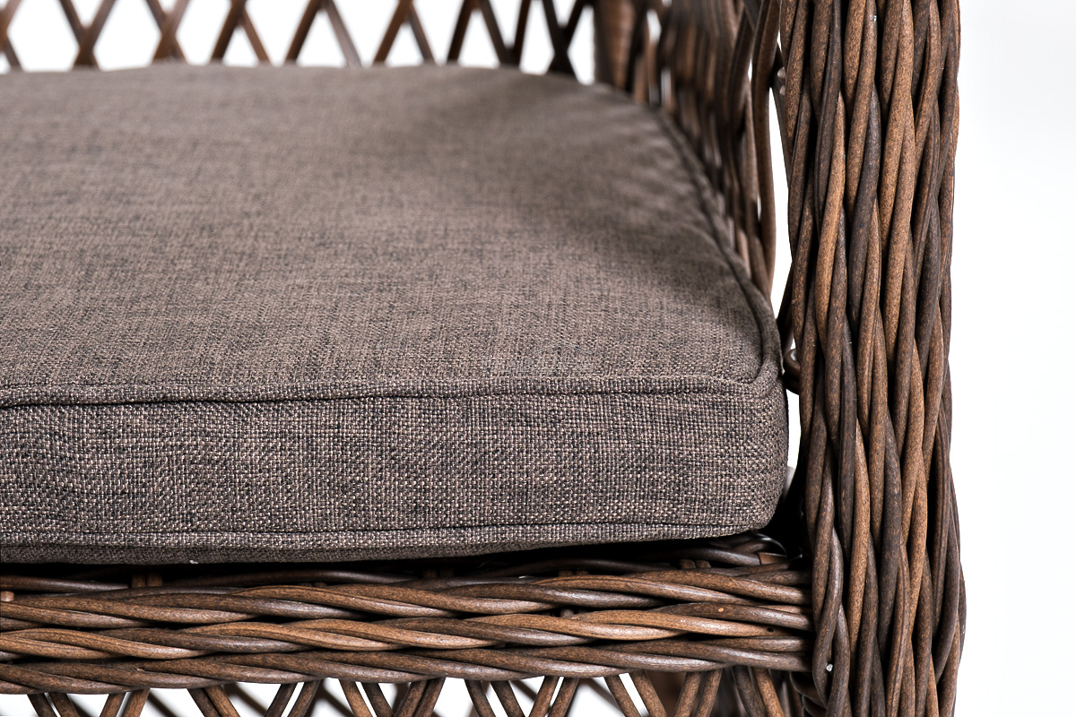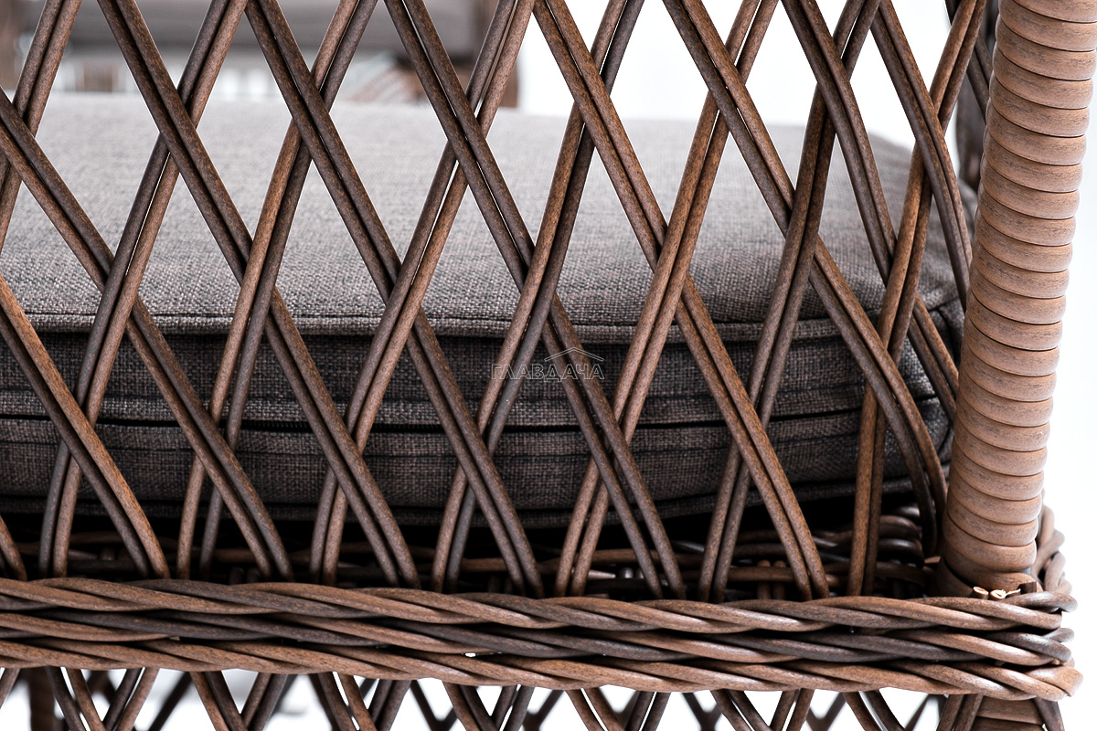 Оплетка выполнена вручную искусственным ротангом коричневого цвета, диван и кресло укомплектованы подушками из 100% полиэстера, которые пропитаны специальным составом, обладающим влагоотталкивающим свойством.