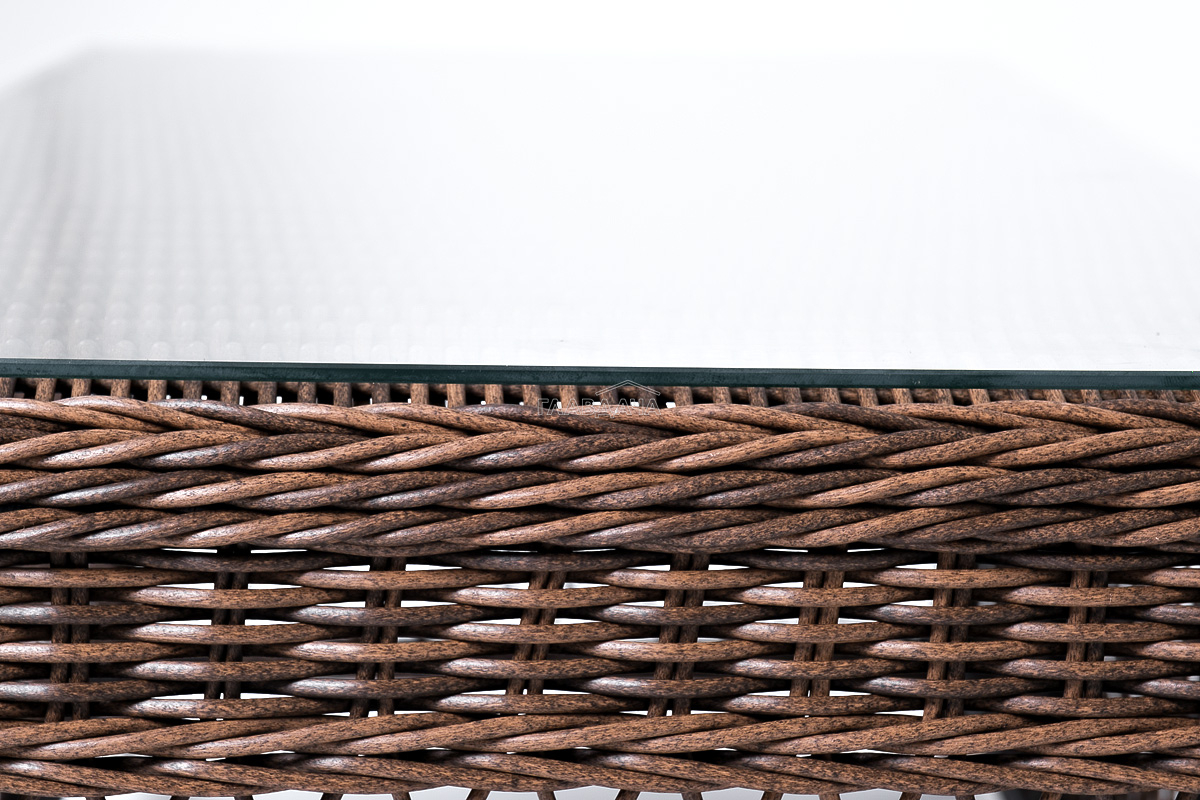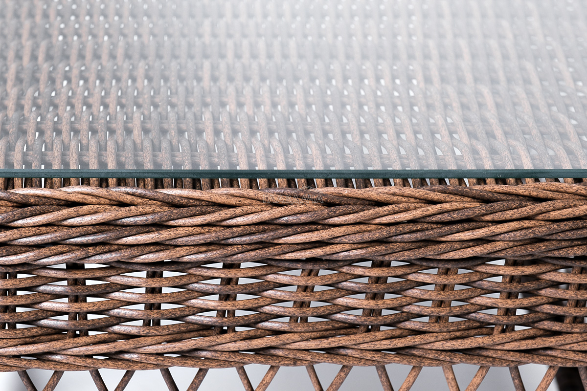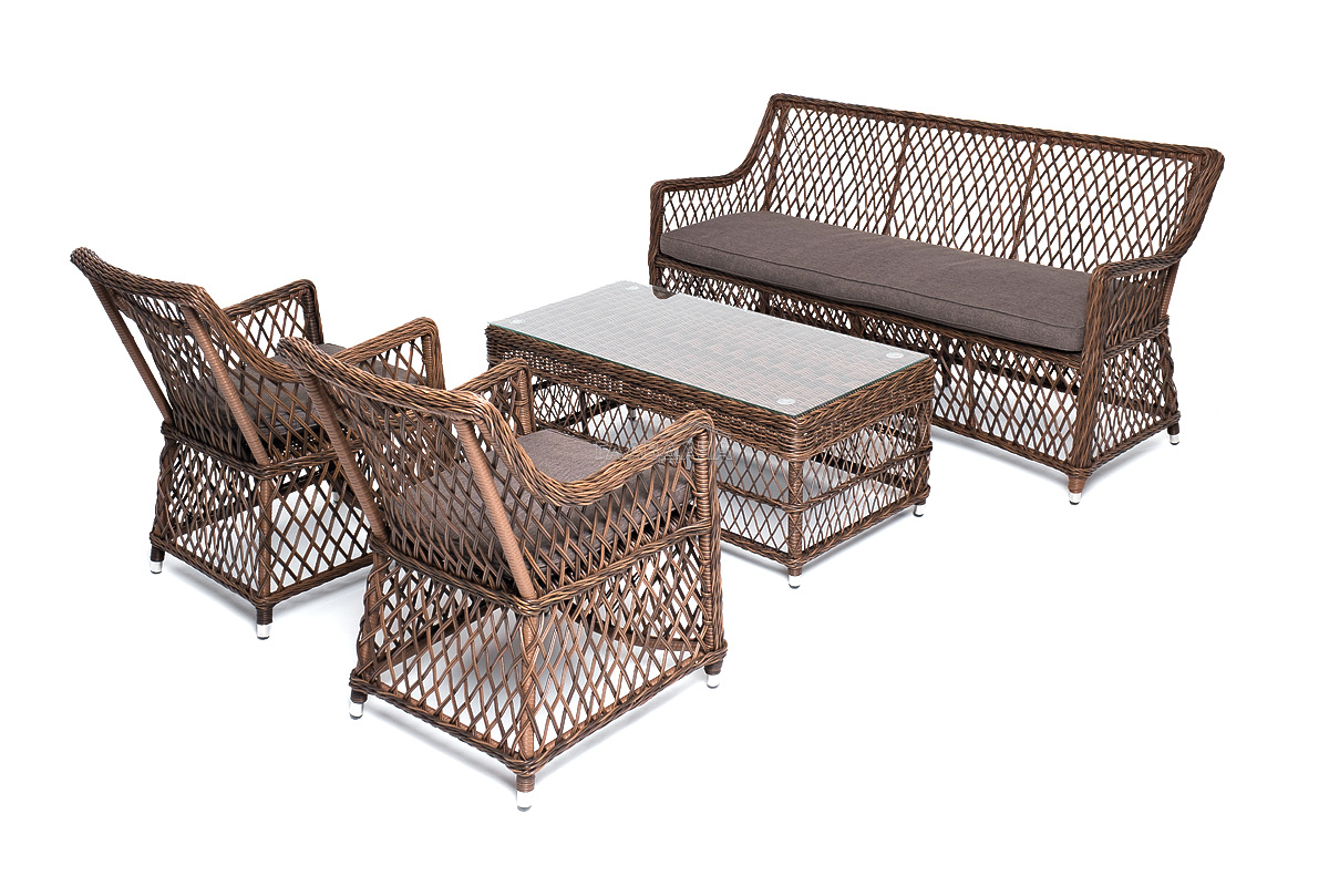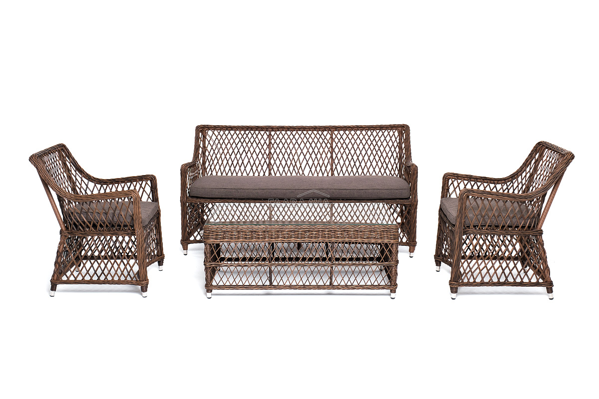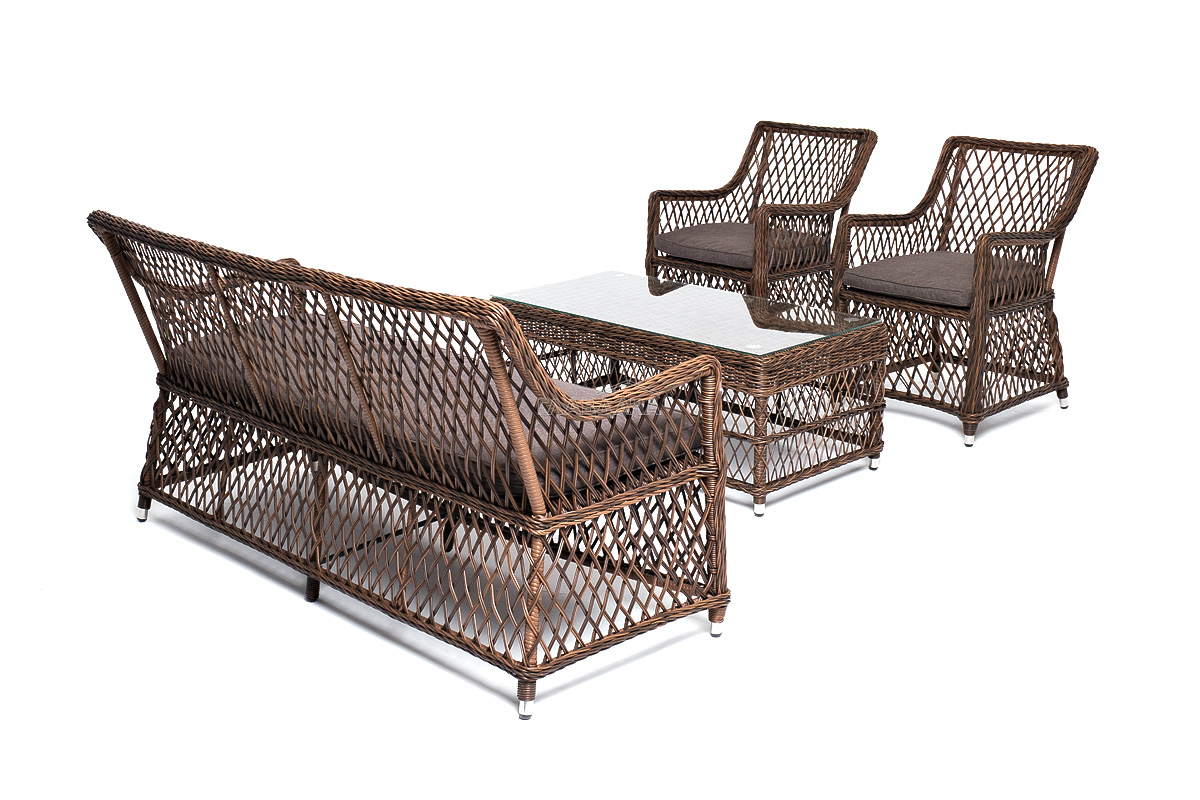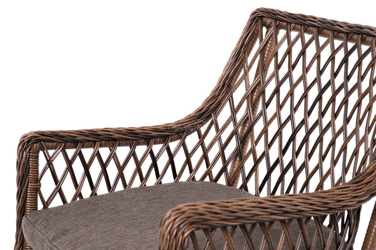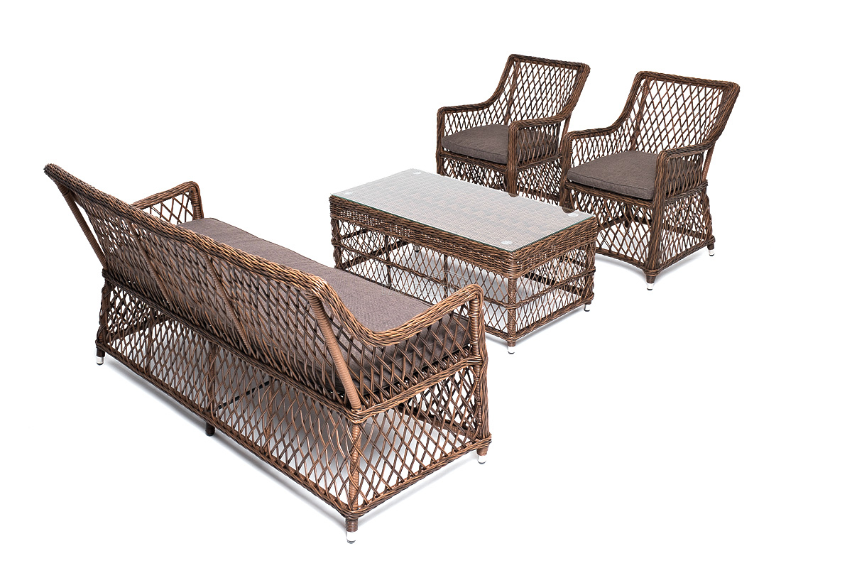 Оплетка выполнена вручную искусственным ротангом коричневого цвета, диван и кресло укомплектованы подушками из 100% полиэстера, которые пропитаны специальным составом, обладающим влагоотталкивающим свойством.