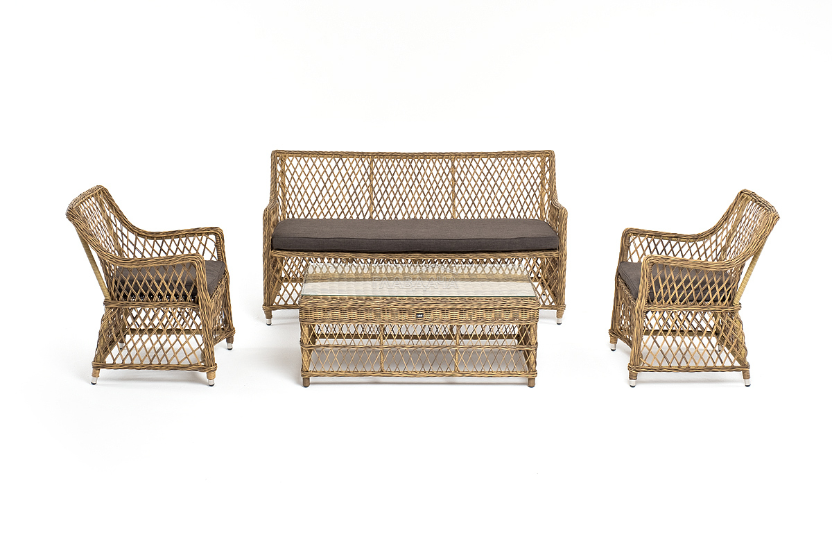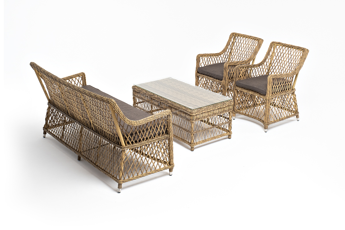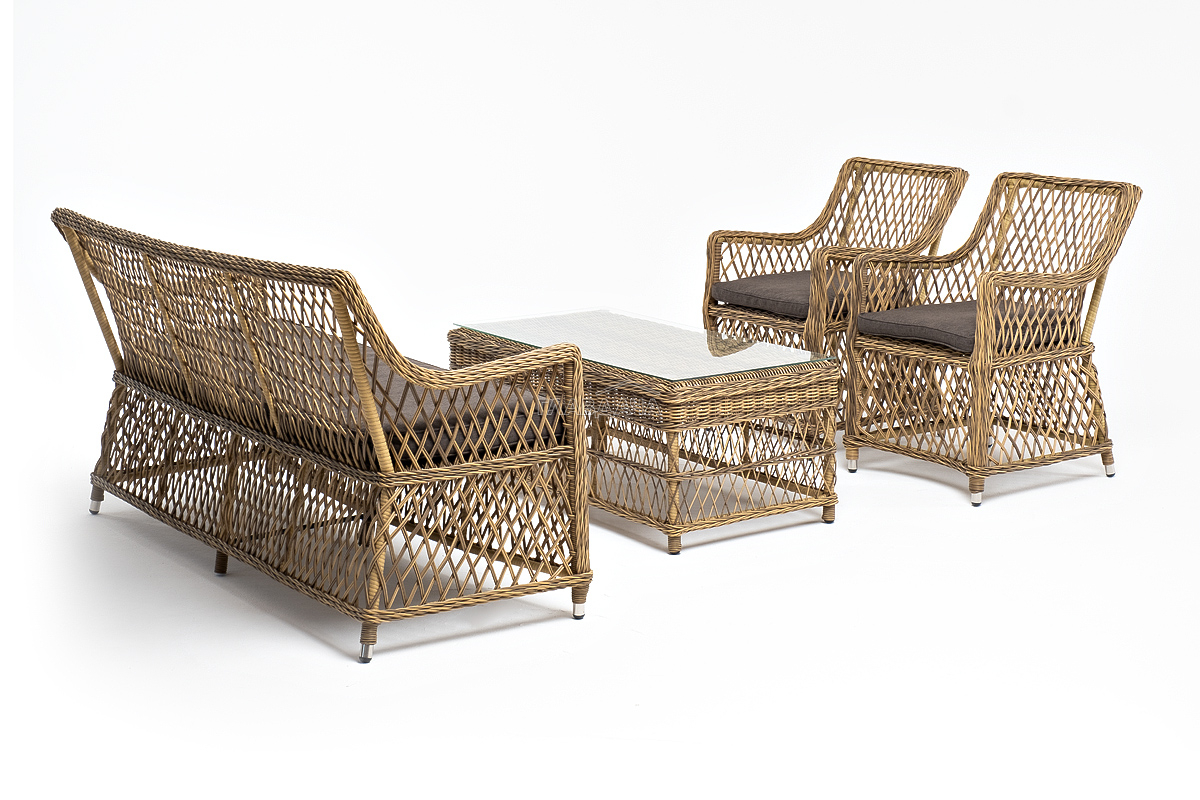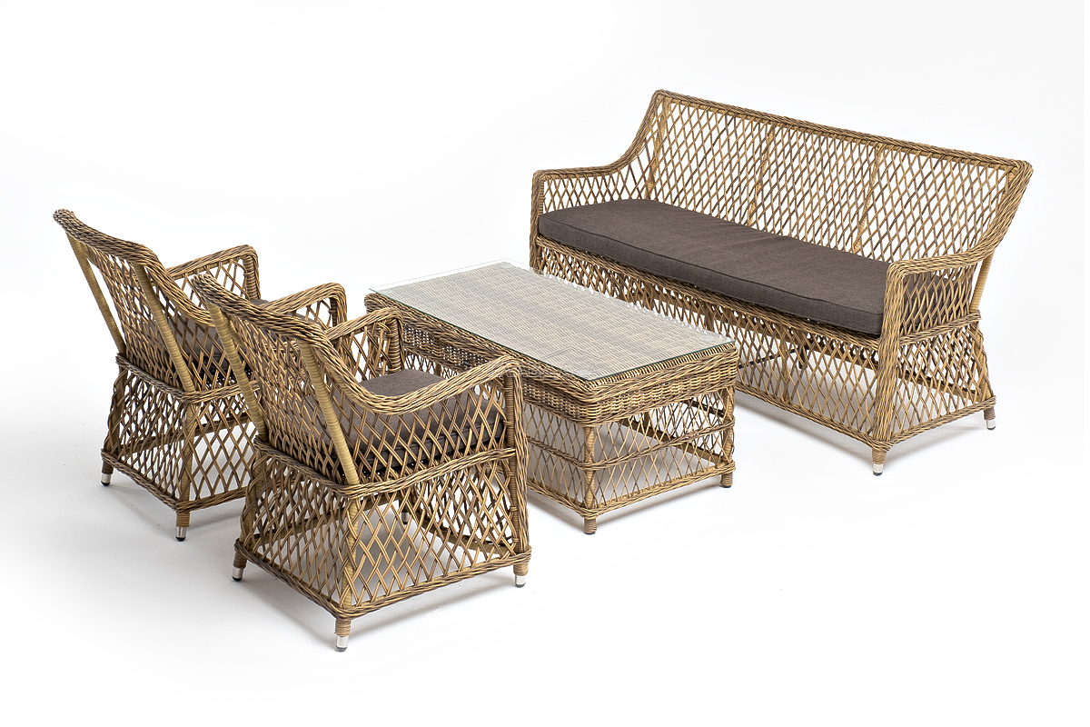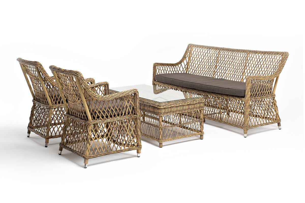 Оплетка выполнена вручную искусственным ротангом соломенного цвета, диван и кресло укомплектованы подушками из 100% полиэстера, которые пропитаны специальным составом, обладающим влагоотталкивающим свойством.
