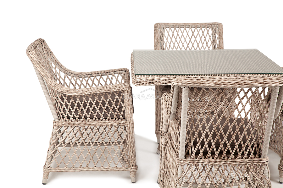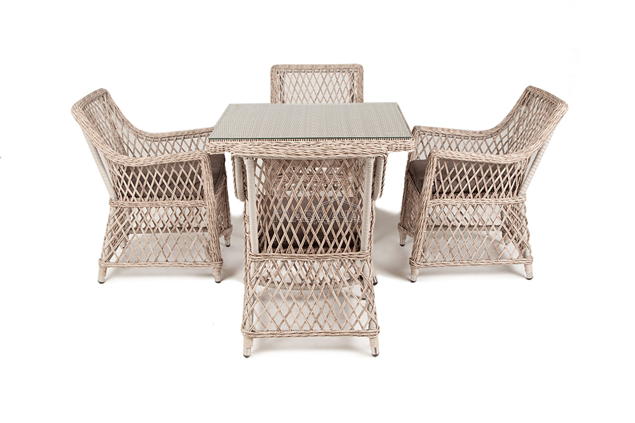 Каркас мебели выполнен из прочного и легкого алюминия, оплетенного вручную искусственным ротангом бежевого цвета, столешница – закаленное стекло.