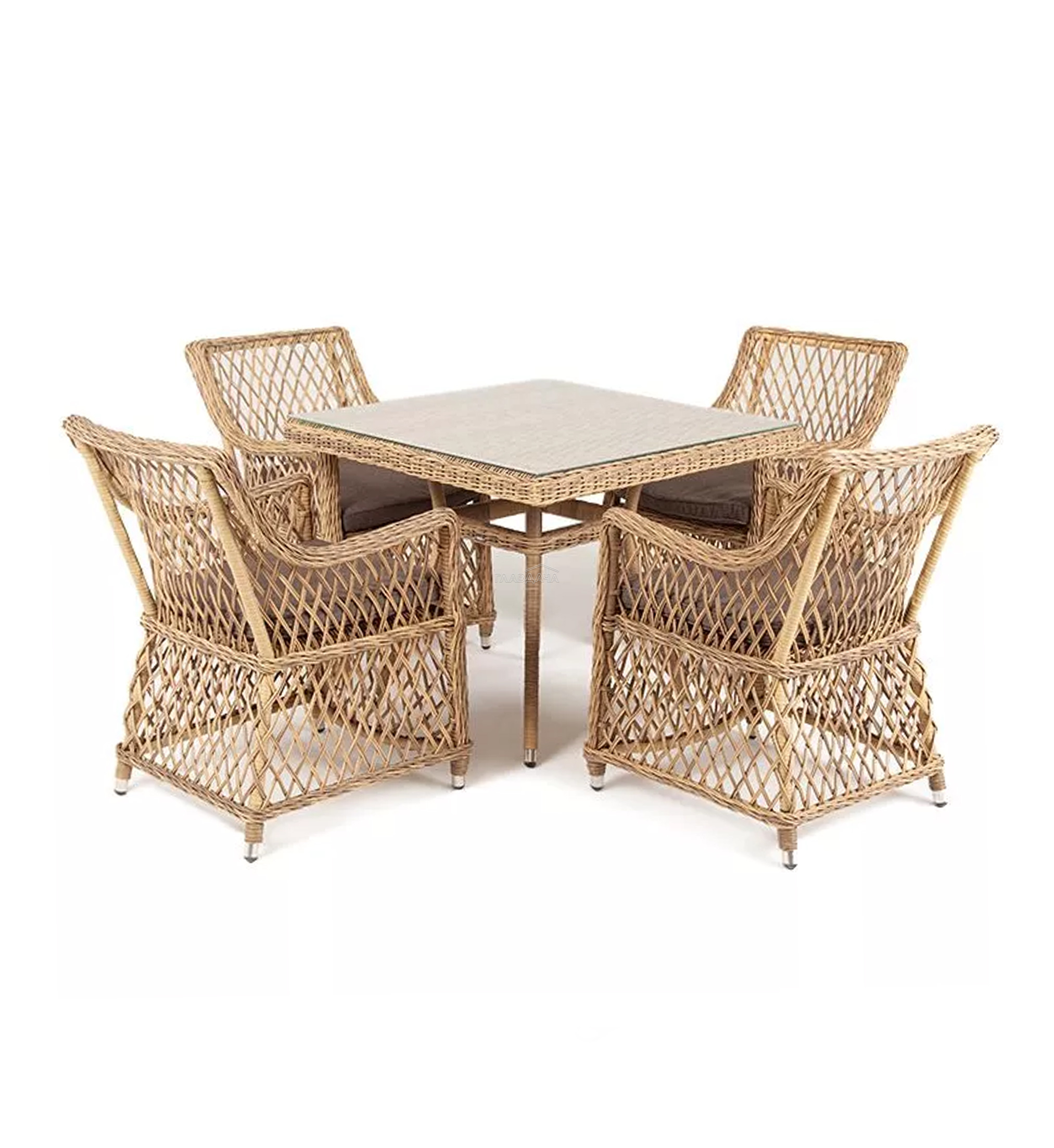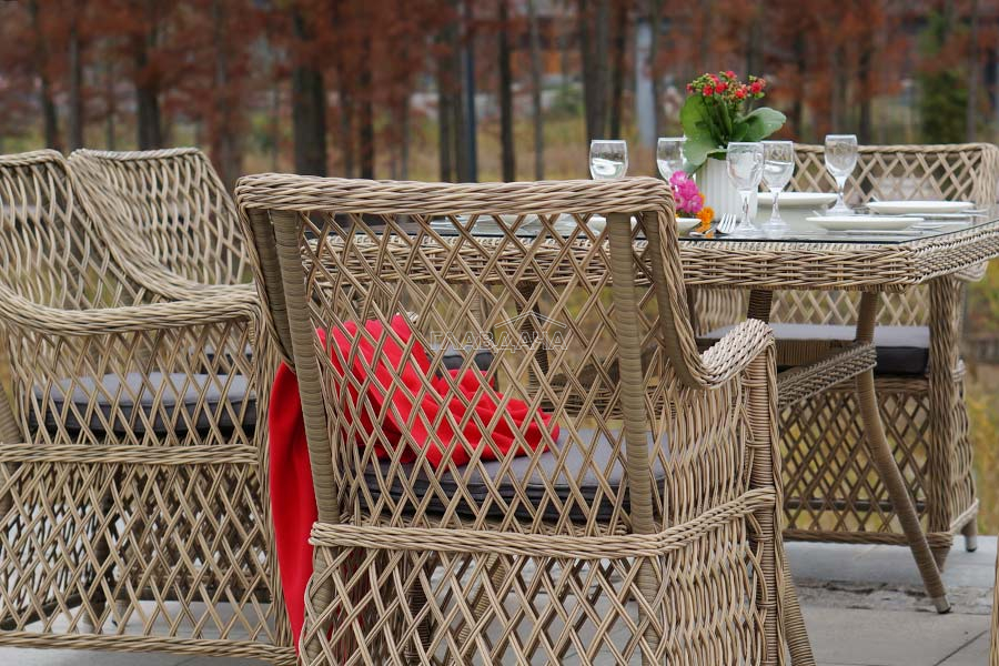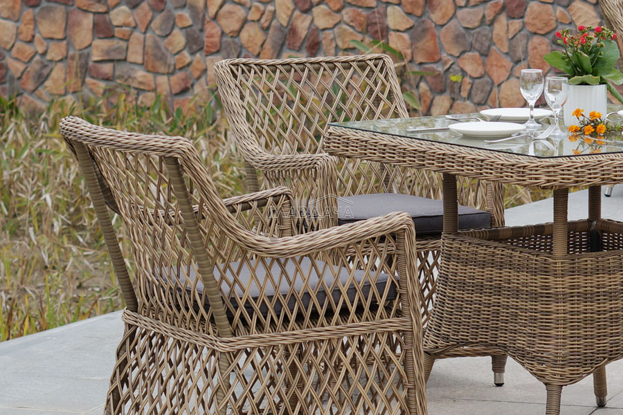 Каркас мебели выполнен из прочного и легкого алюминия, оплетенного вручную долговечным искусственным ротангом натурального соломенного цвета, столешница – прочное стекло.