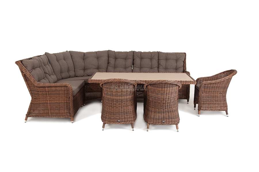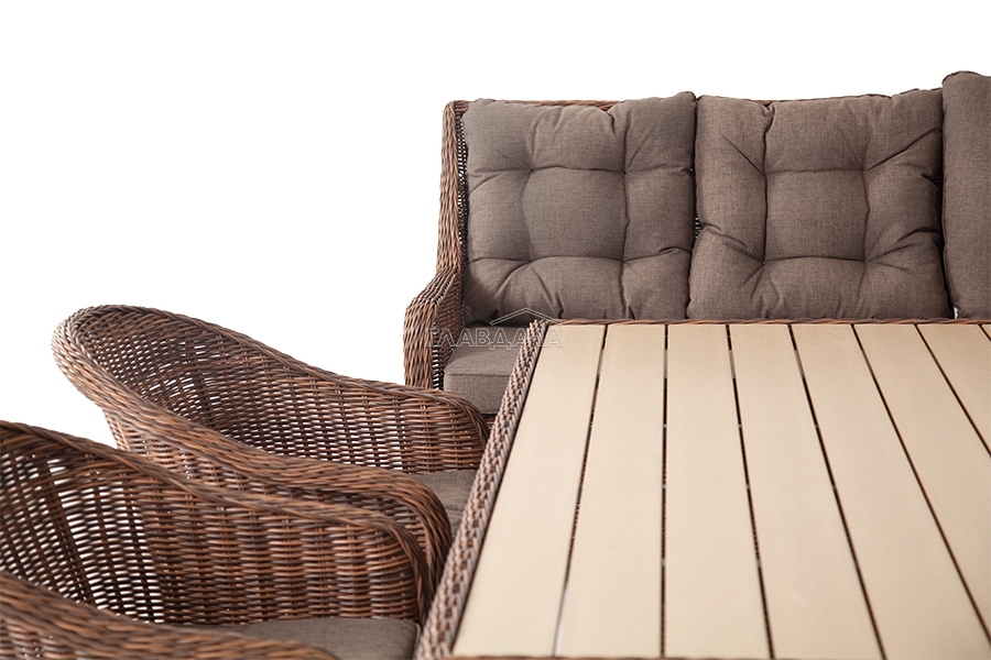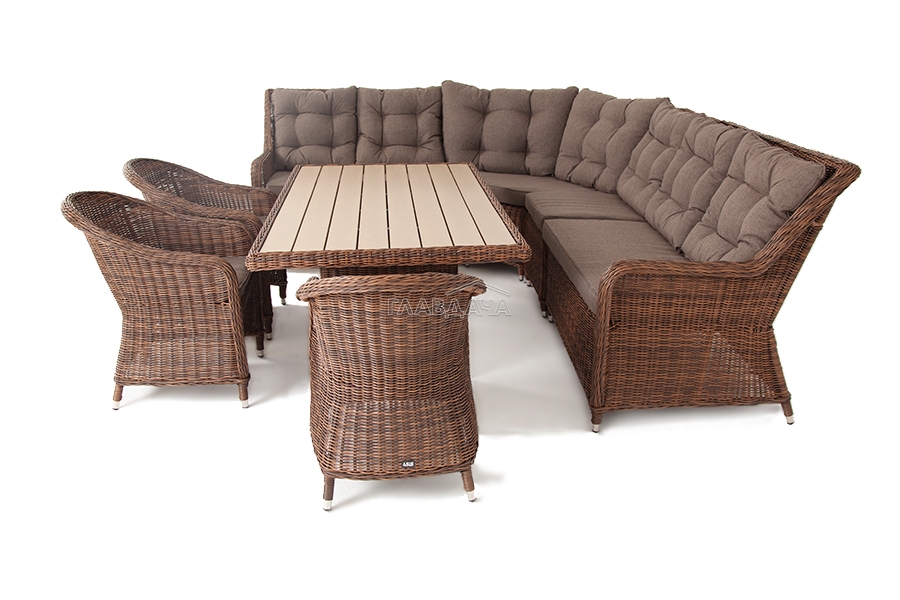 Модульный диван и кресла изготовлены посредством ручного плетения из искусственного ротанга коричневого цвета. Для укрепления конструкции использован алюминиевый каркас.