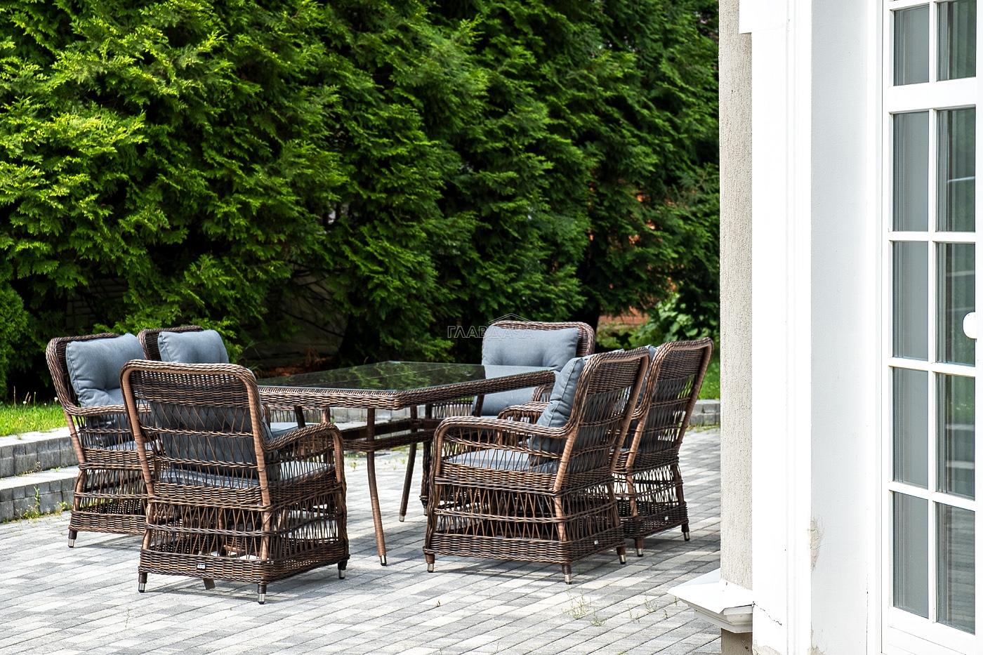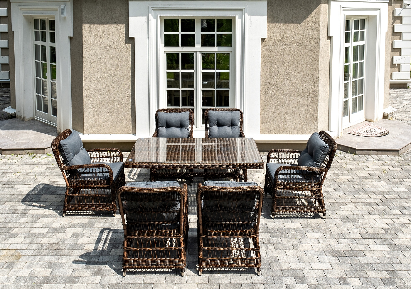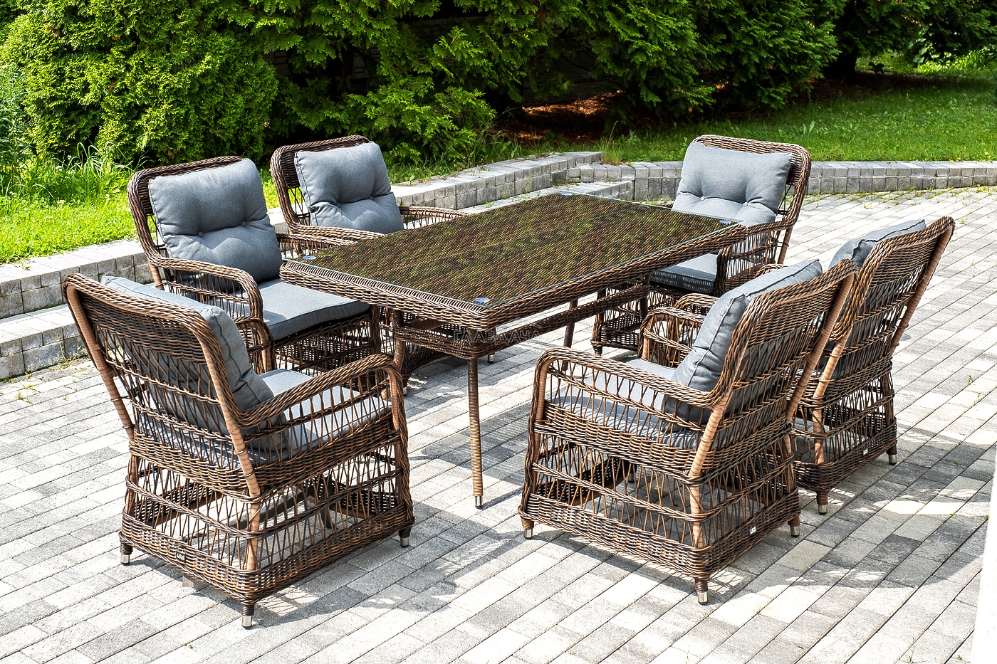 Садовая обеденная группа на 6 персон «Цесена» из ротанга. В комплекте: большой прямоугольный обеденный стол (1600×900×750 мм) и 6 кресел (600×800×910 мм).