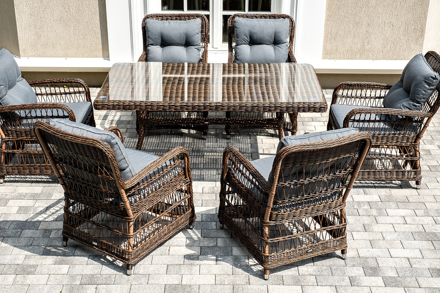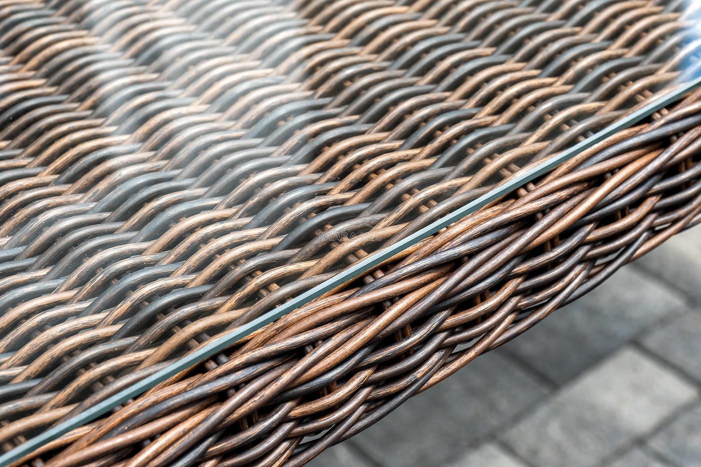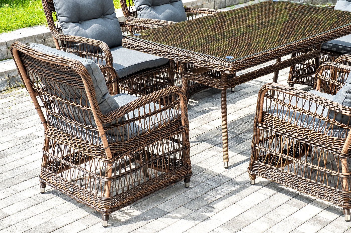Вся мебель изготовлена из алюминия, вручную оплетенного круглым искусственным ротангом коричневого оттенка. Столешница укомплектована ударопрочным стеклом, толщиной 5 мм. Данное стекло крепится к столу при помощи четырех вакуумных силиконовых присосок и поставляется в собранном виде.