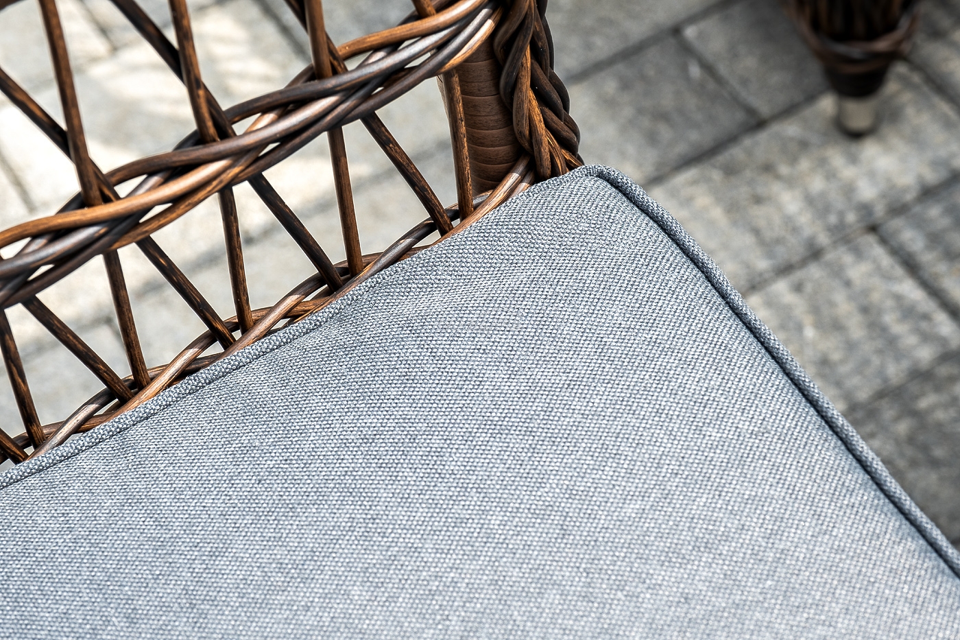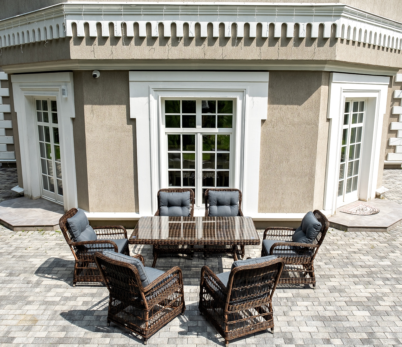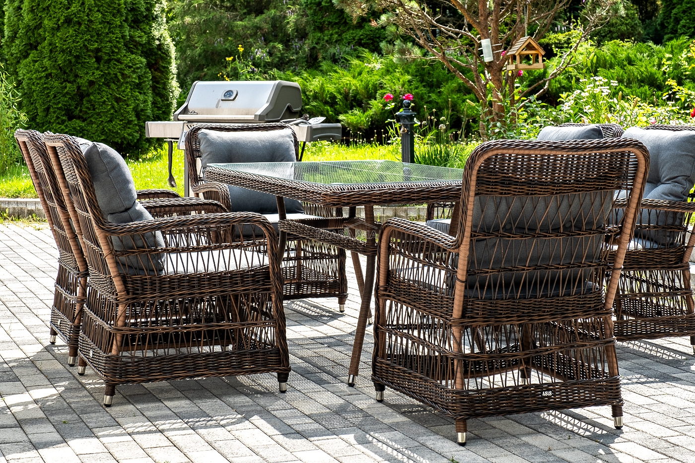 Вся мебель изготовлена из алюминия, вручную оплетенного круглым искусственным ротангом коричневого оттенка. Столешница укомплектована ударопрочным стеклом, толщиной 5 мм. Данное стекло крепится к столу при помощи четырех вакуумных силиконовых присосок и поставляется в собранном виде.
