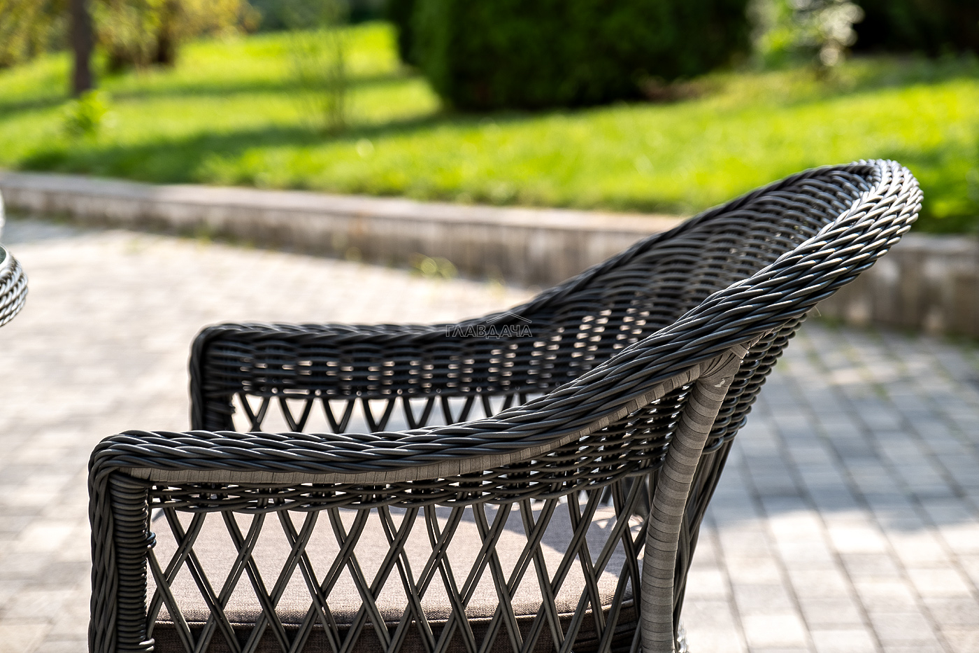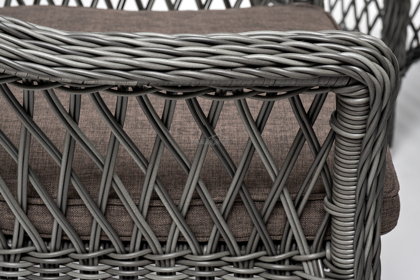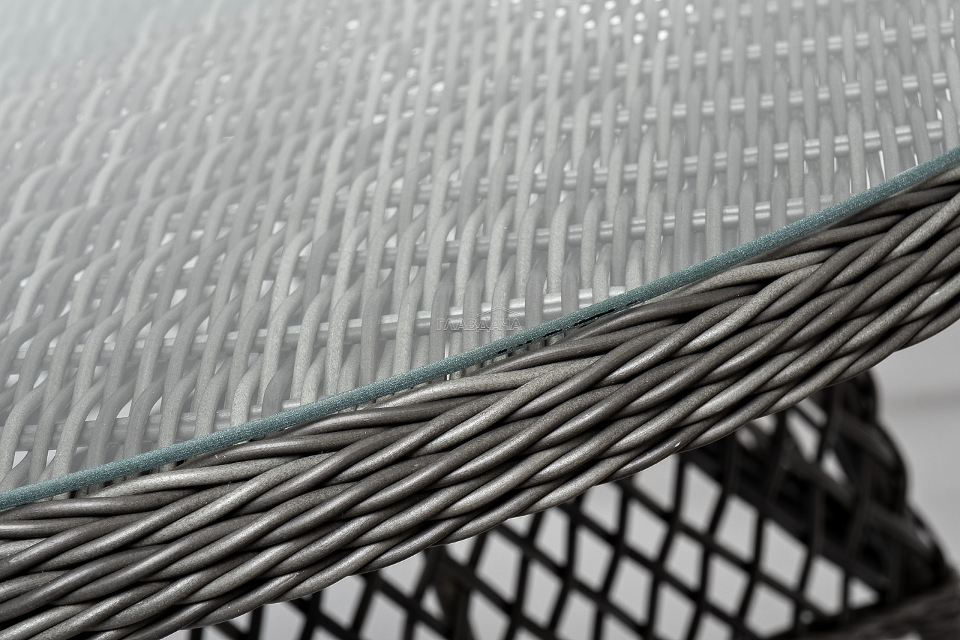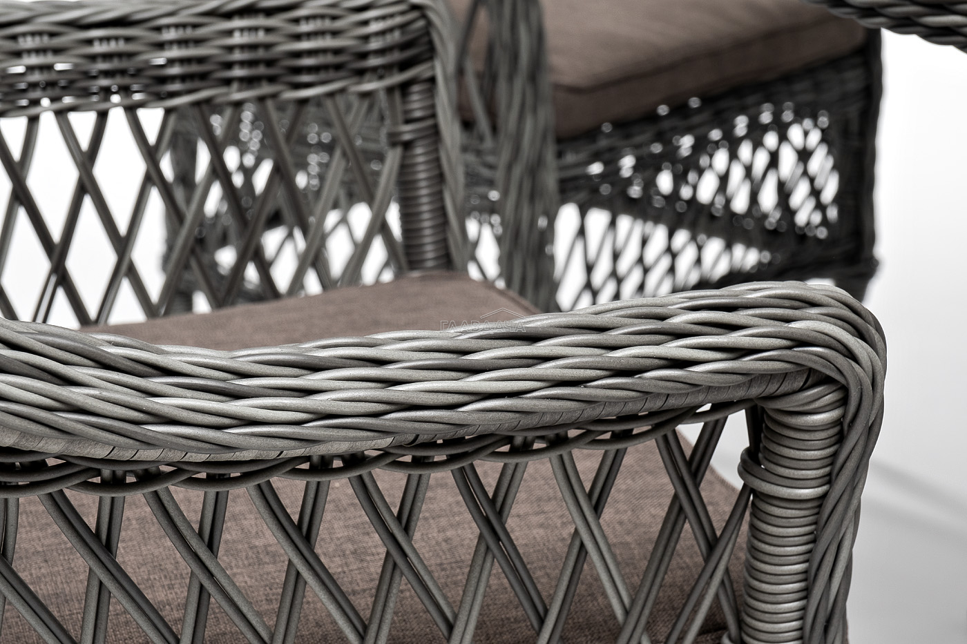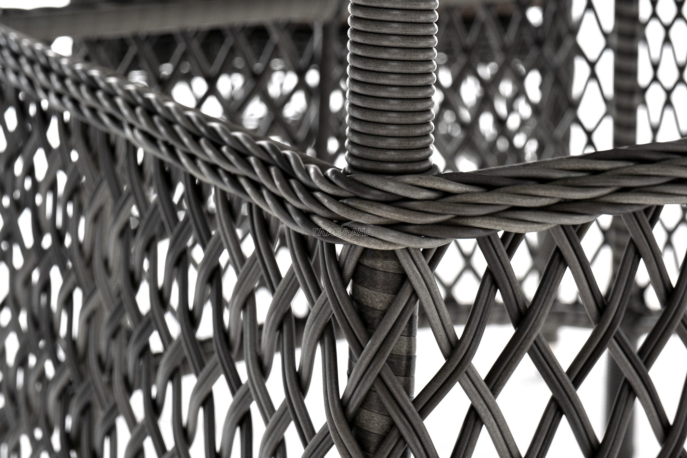 Вся мебель изготовлена из алюминия, поэтому ее очень легко перемещать. Декоративное покрытие выполнено из долговечного искусственного ротанга, устойчивого к перепадам температур и переменам погоды. Столешница изготовлена из прочного закаленного стекла 5 мм, кресла укомплектованы подушками серого цвета со съёмными чехлами.