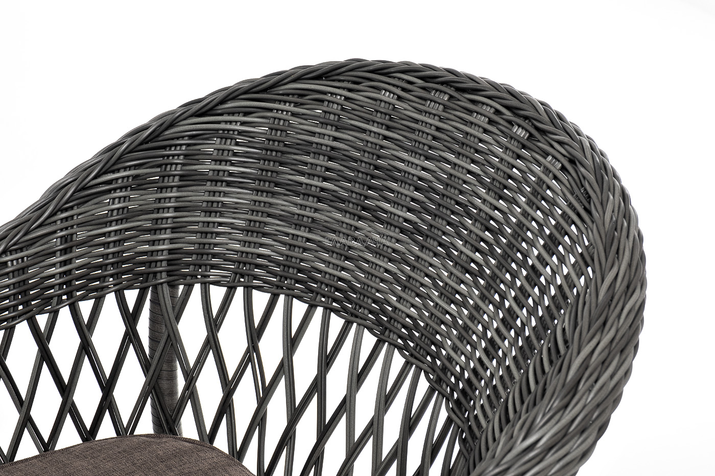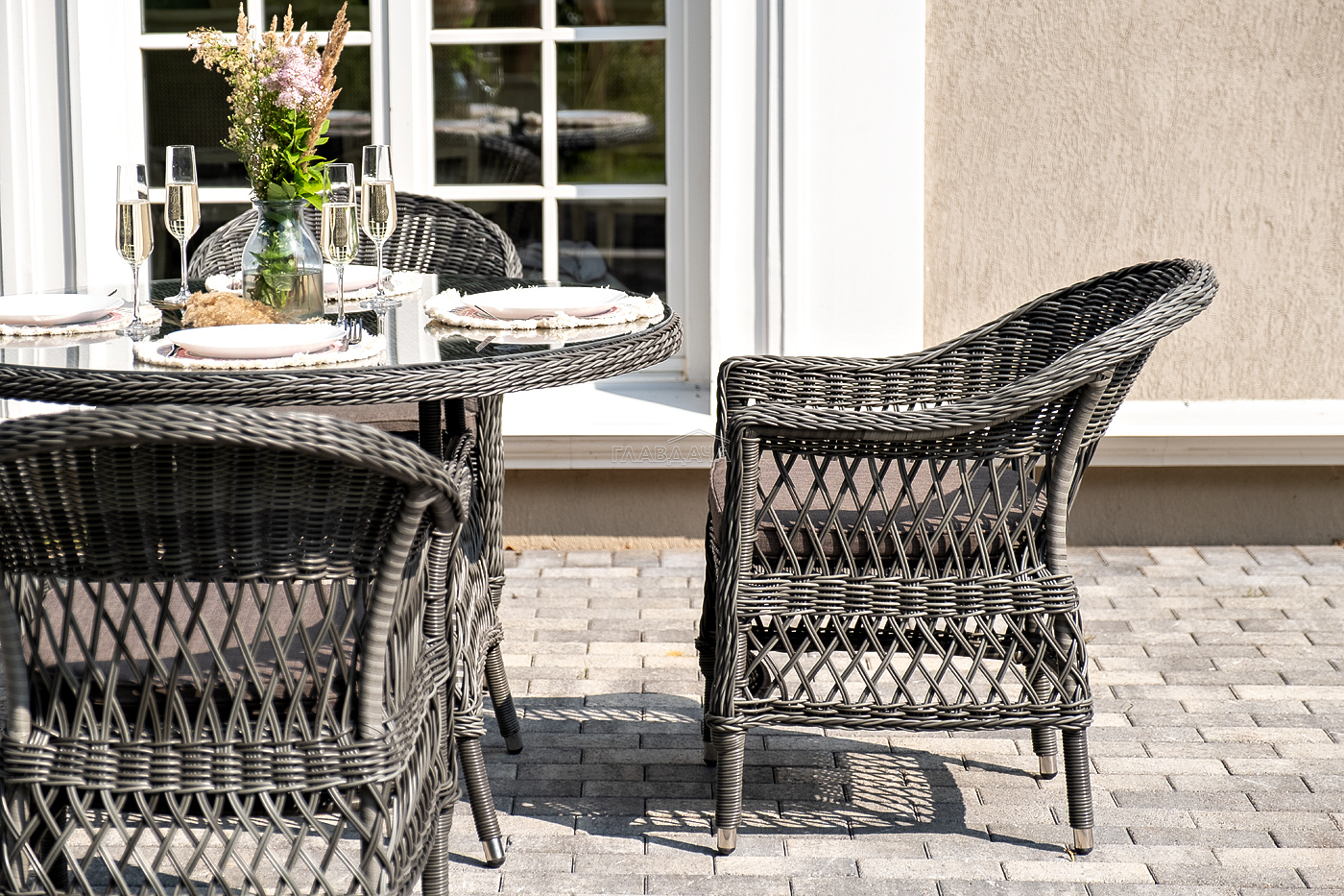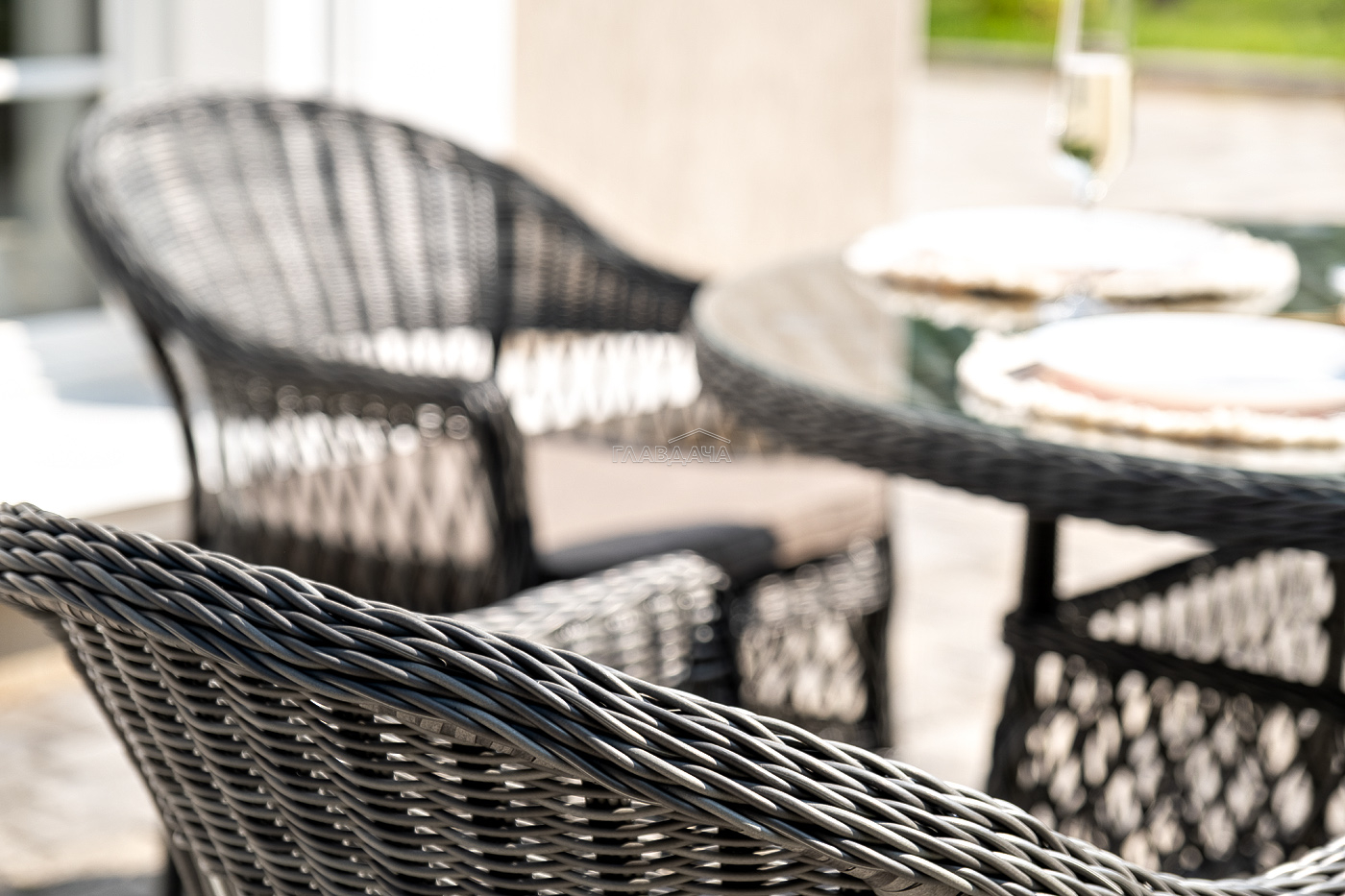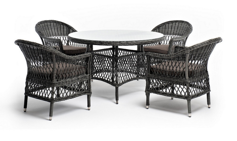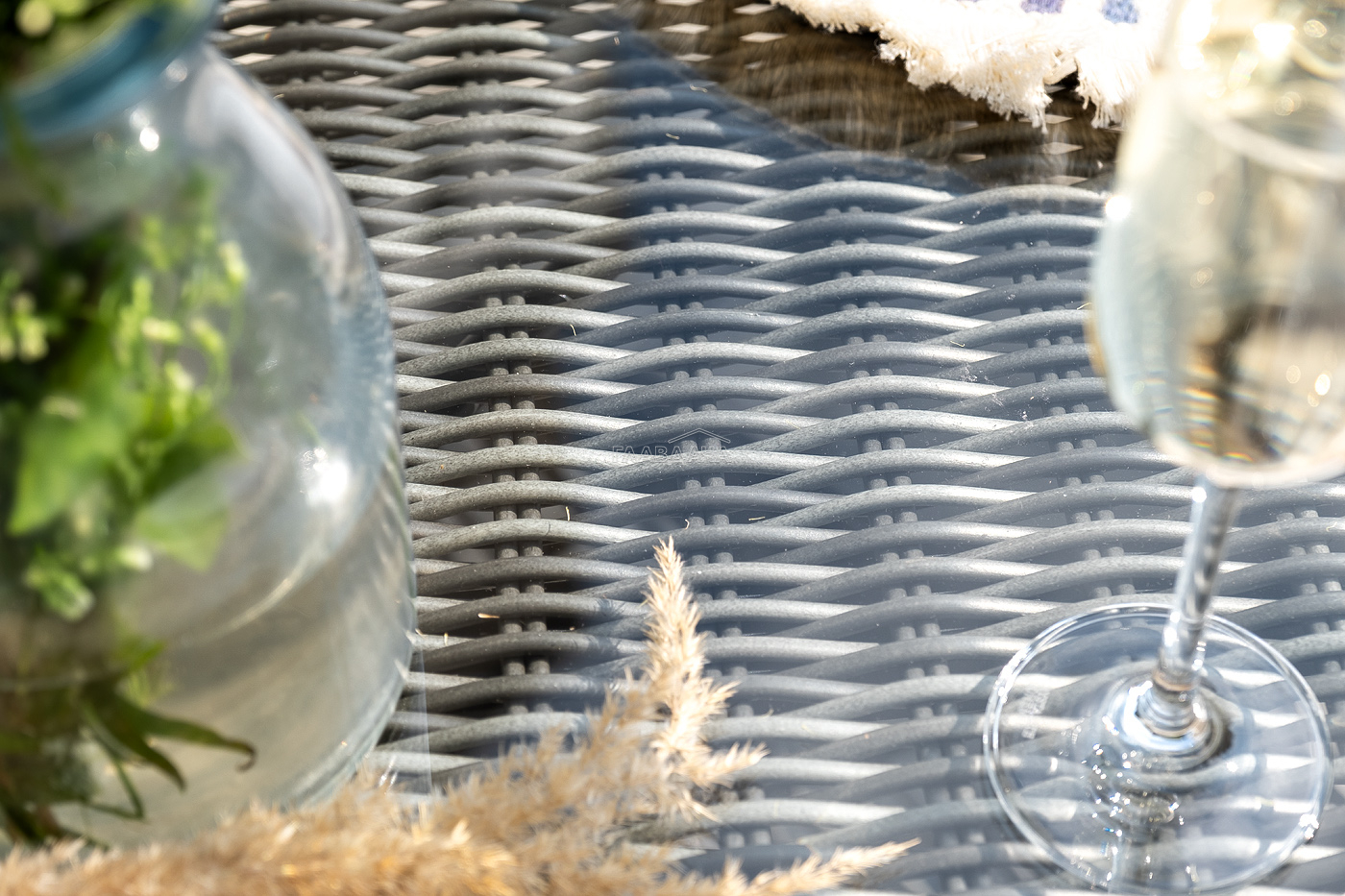 Вся мебель изготовлена из алюминия, поэтому ее очень легко перемещать. Декоративное покрытие выполнено из долговечного искусственного ротанга, устойчивого к перепадам температур и переменам погоды. Столешница изготовлена из прочного закаленного стекла 5 мм, кресла укомплектованы подушками серого цвета со съёмными чехлами.