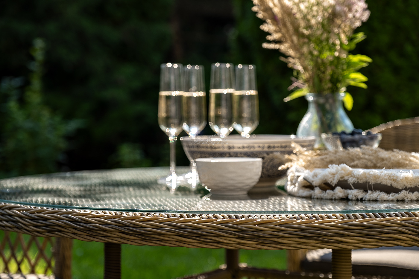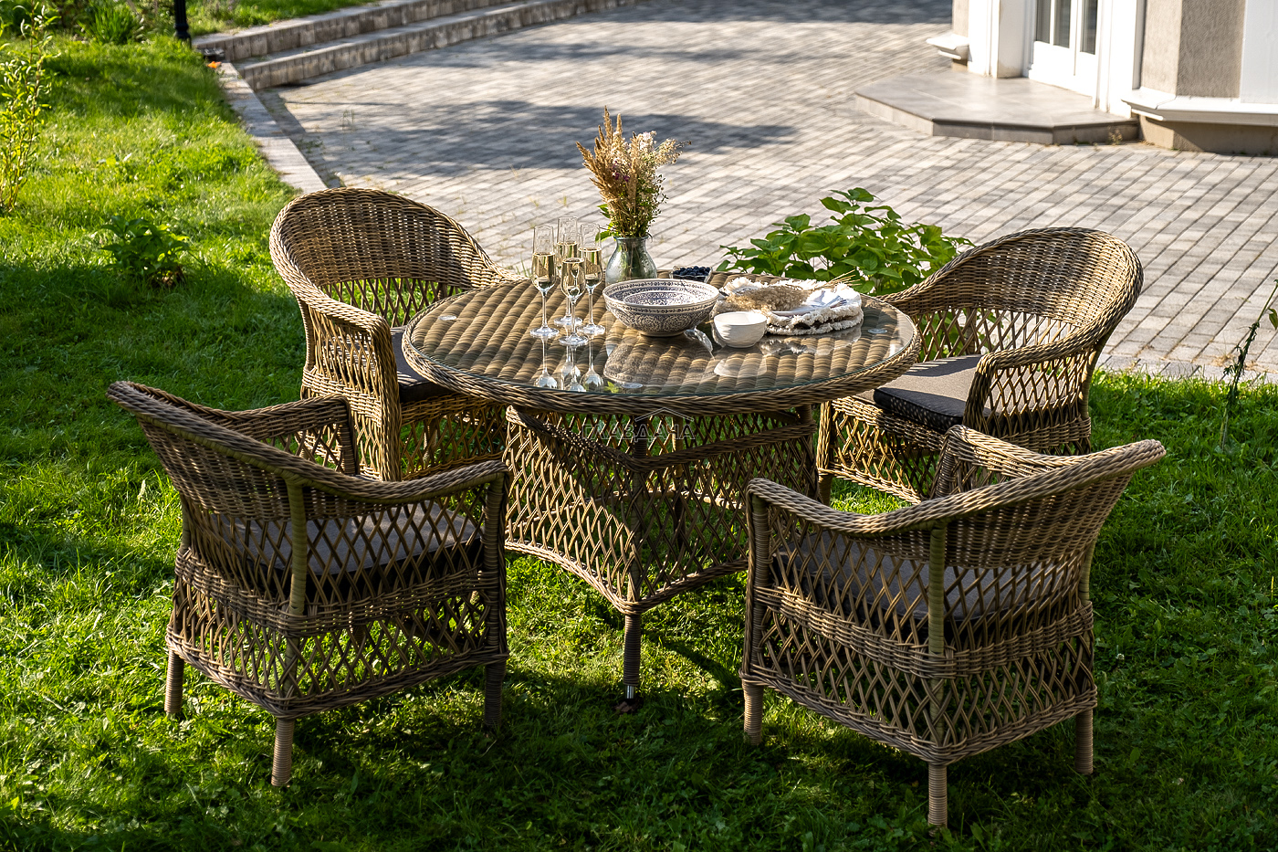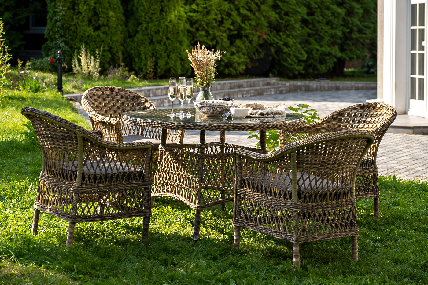 Обеденная группа «Дольче» дает возможность обустроить обеденную зону на открытом дачном участке, веранде или беседке.