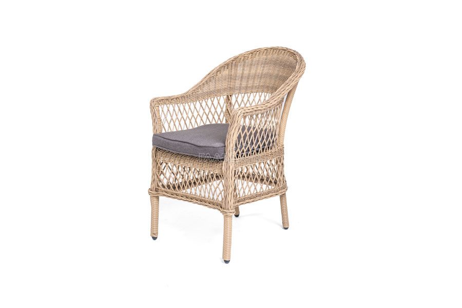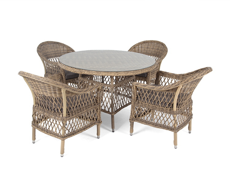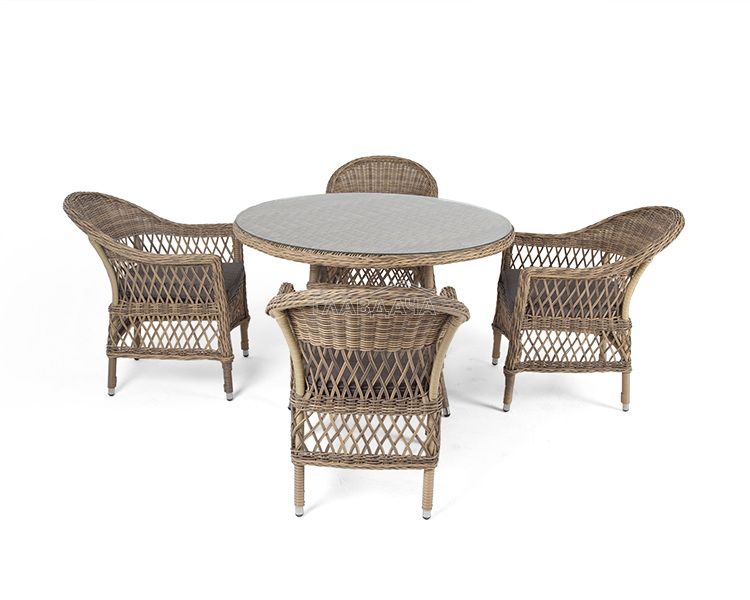 Из алюминия выполнен устойчивый каркас мебели, который задекорирован искусственным ротангом круглого ручного плетения. Комплект представлен в соломенном цвете.