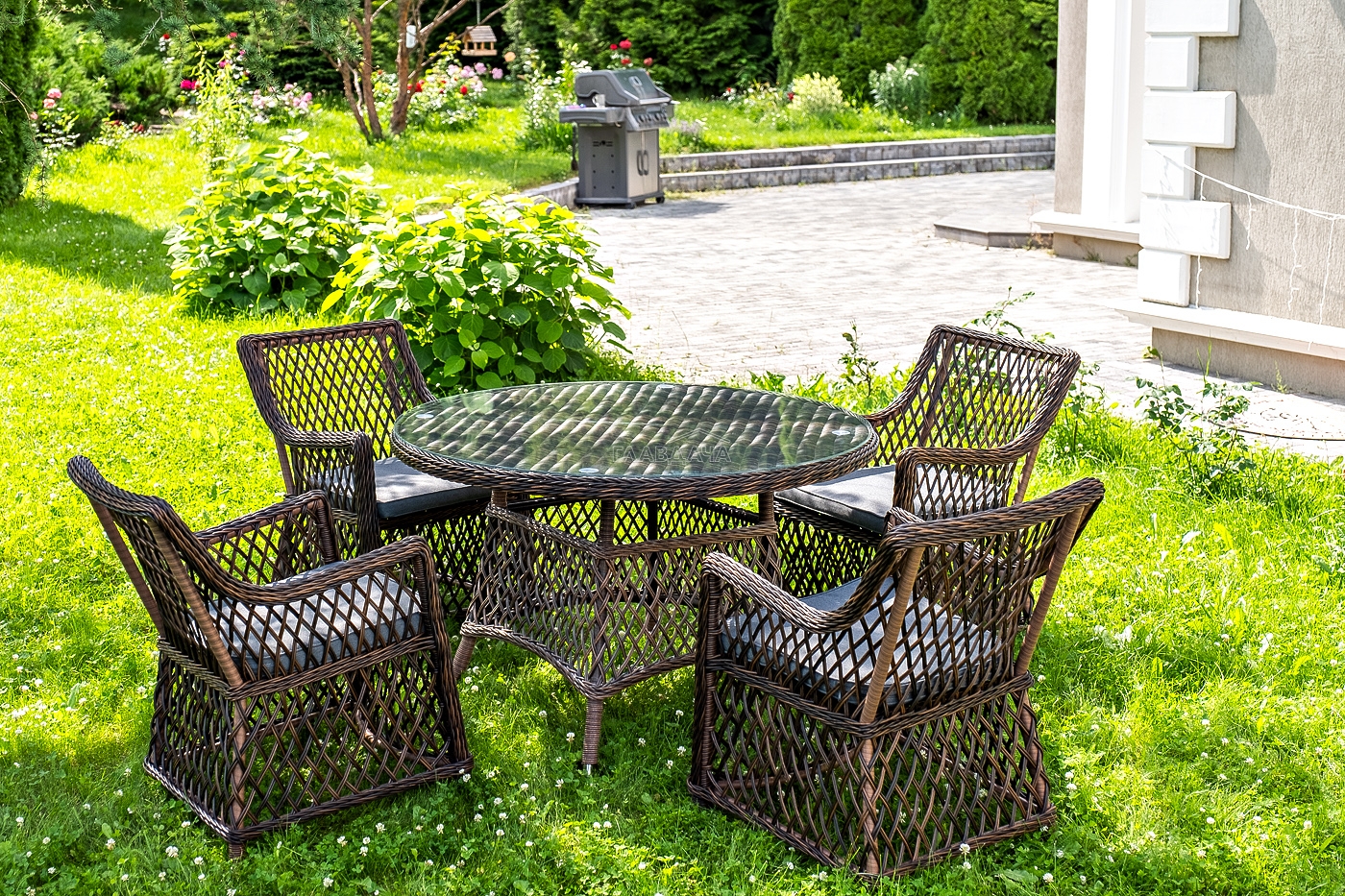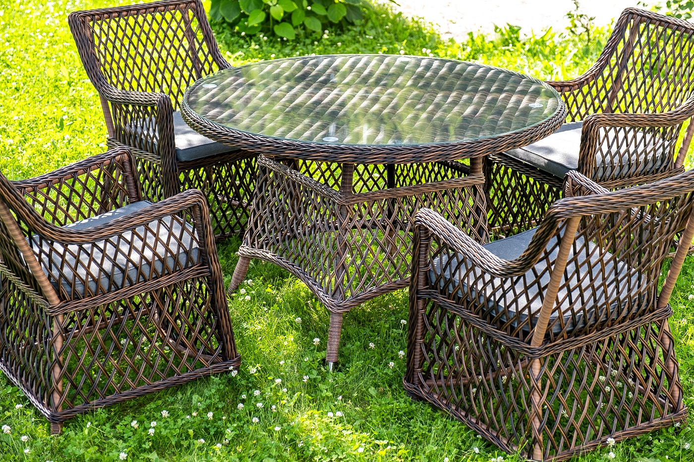 Классическая уличная обеденная группа «Доппио» для сада, летней веранды ресторана. В комплекте круглый обеденный стол «Эспрессо» (1180×1180×750 мм) с ударопрочной стеклянной столешницей и 4 кресла коллекции «Латте» 550×660×850 мм.