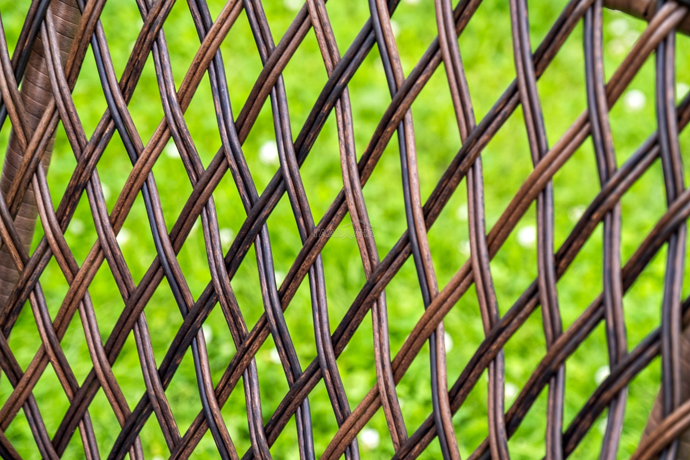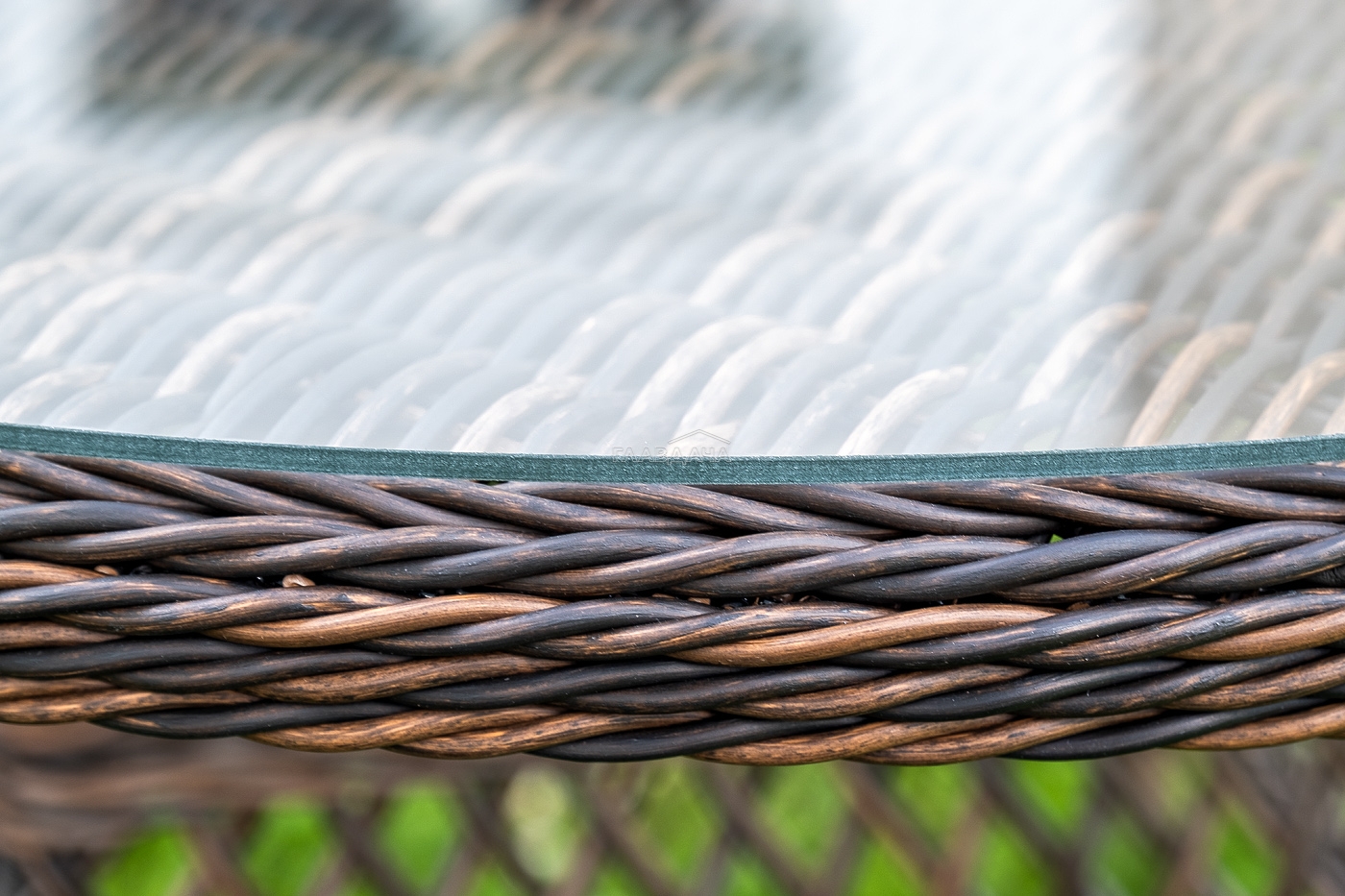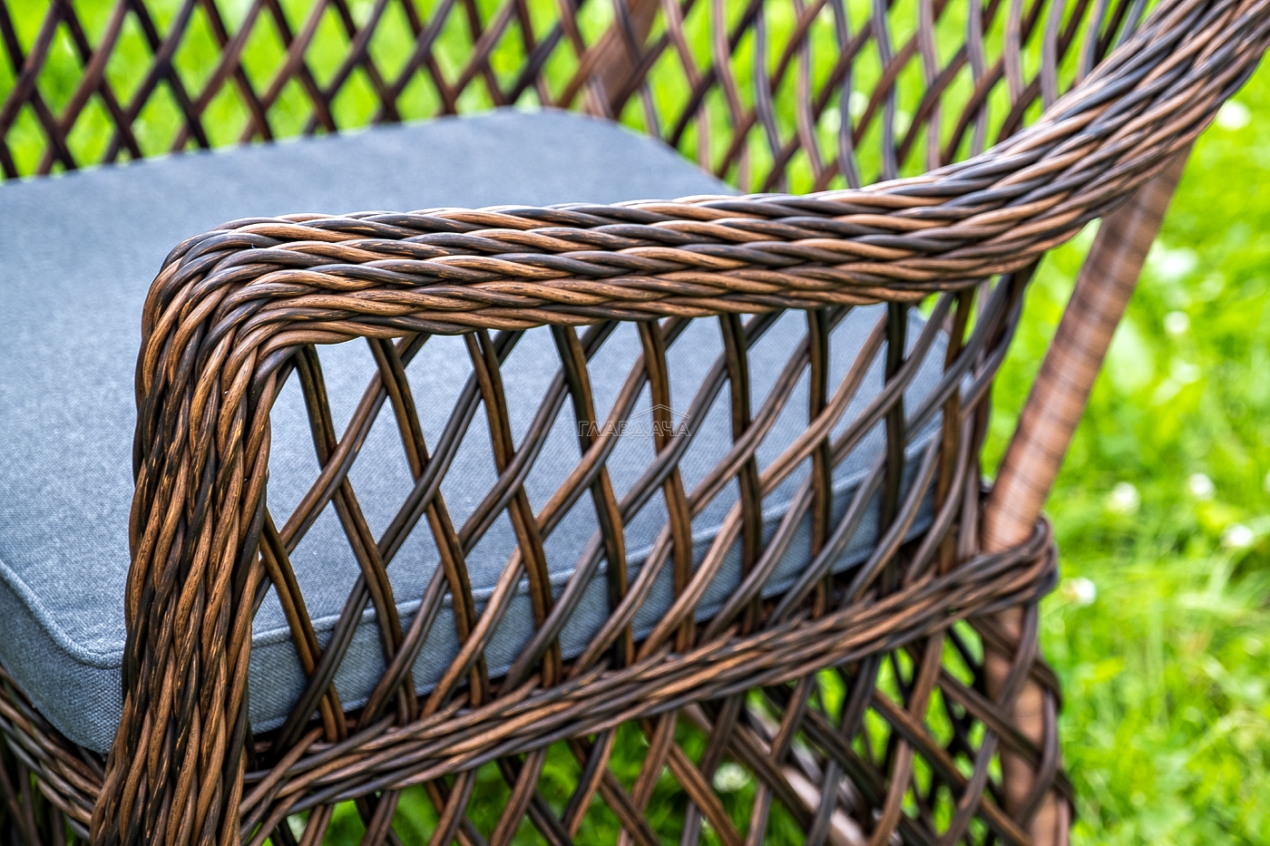 Каркас мебели выполнен из прочного и легкого алюминия, вручную оплетенного круглым синтетическим ротангом натурального коричневого оттенка. На креслах предусмотрены мягкие подушки со съёмными чехлами серого цвета.