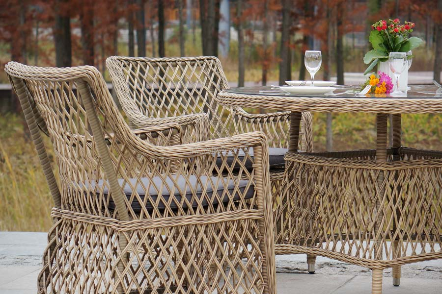 Каркас мебели выполнен из прочного и легкого алюминия, вручную оплетенного круглым синтетическим ротангом натурального соломенного оттенка. На креслах предусмотрены мягкие подушки со съёмными чехлами серого цвета.
