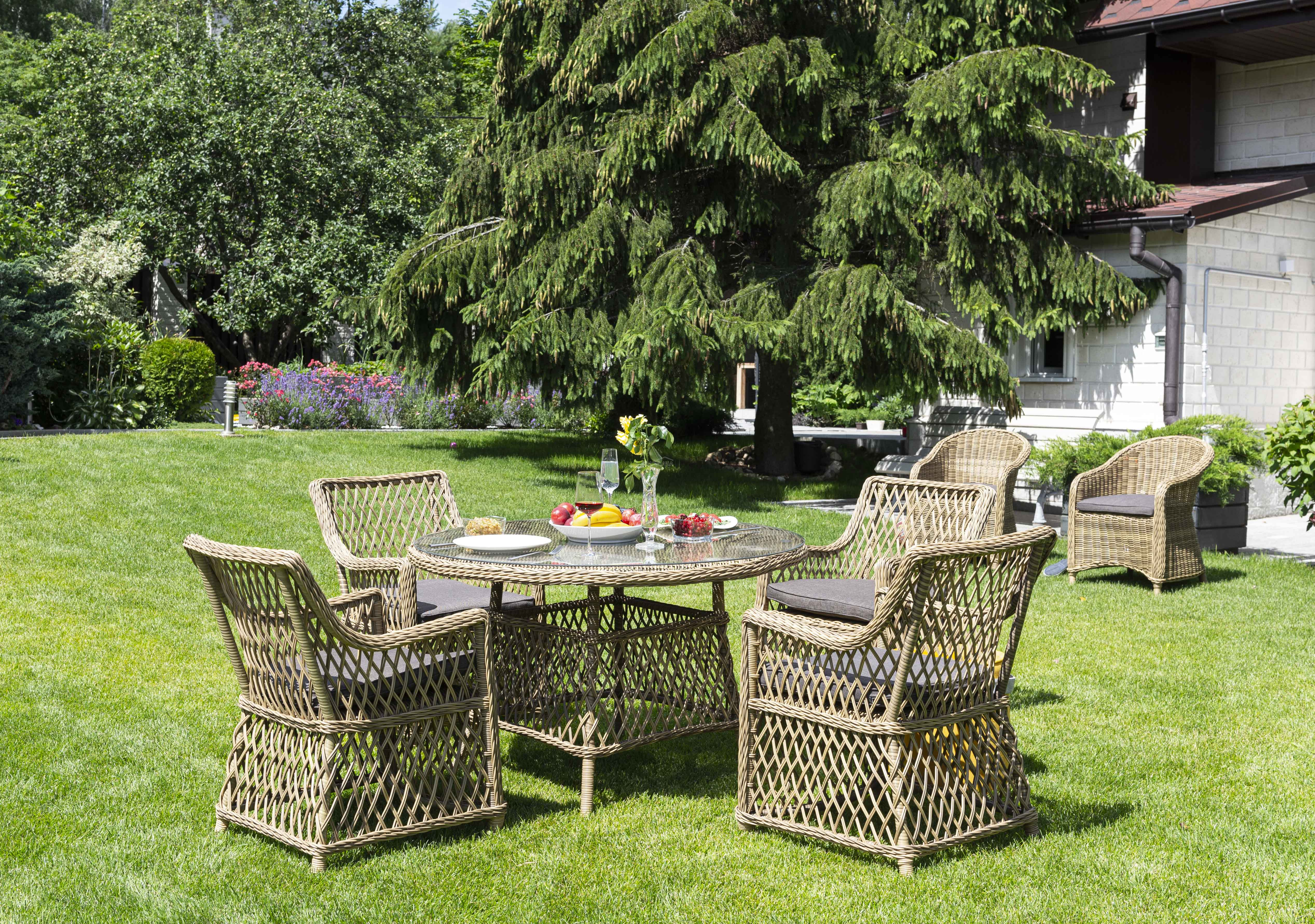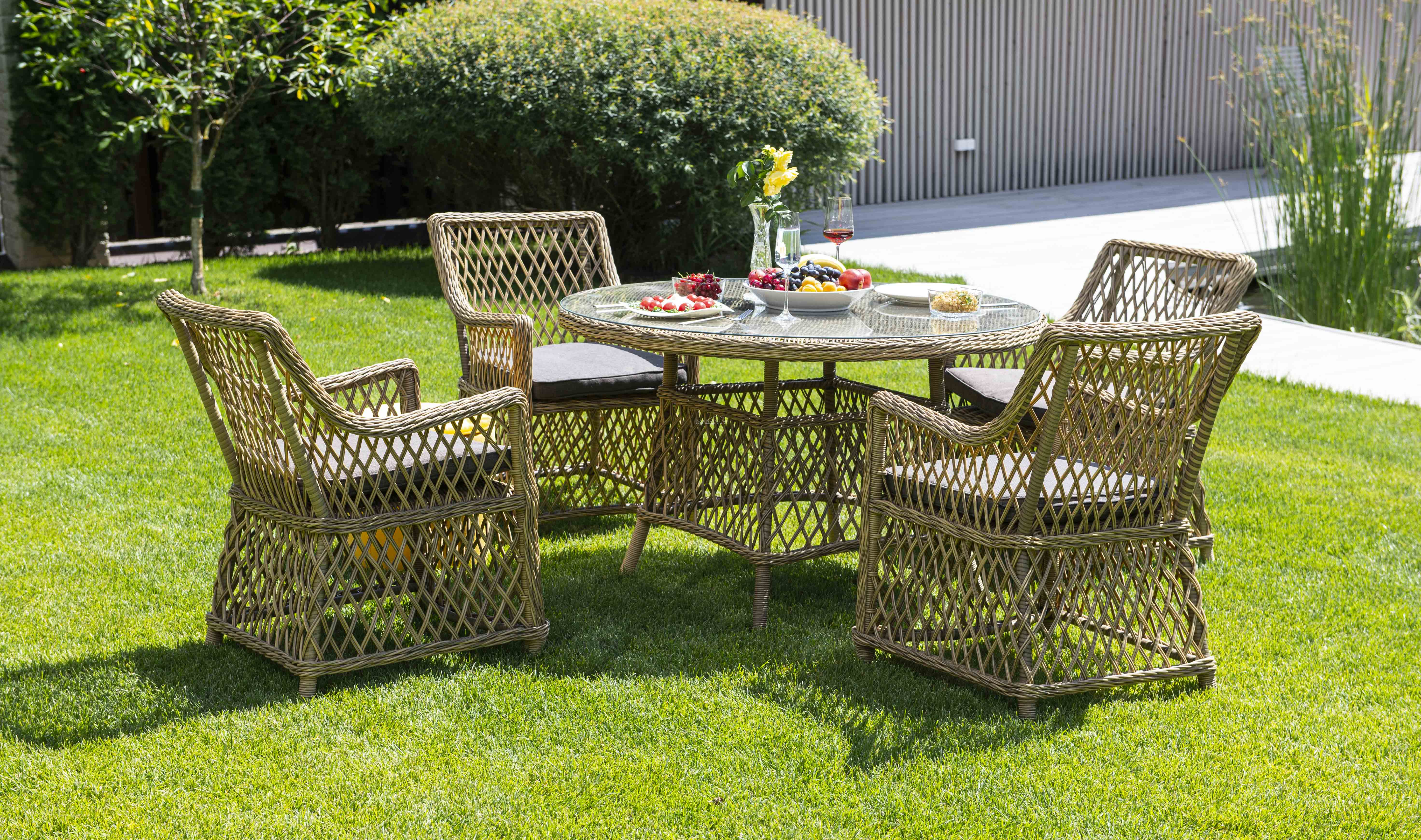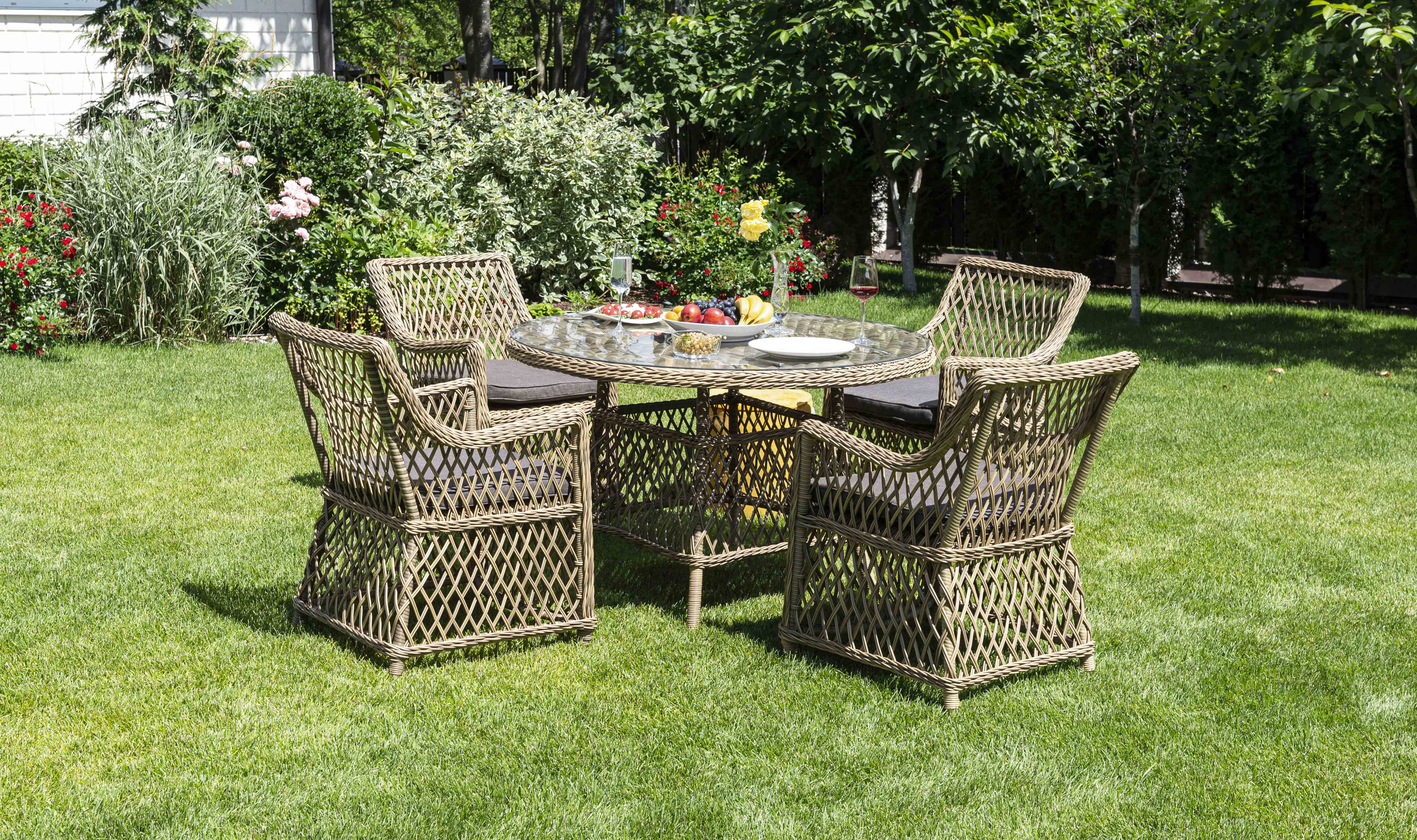 Классическая уличная обеденная группа «Доппио» для сада, летней веранды ресторана. В комплекте круглый обеденный стол «Эспрессо» (1180×1180×750 мм) с ударопрочной стеклянной столешницей и 4 кресла коллекции «Латте» 550×660×850 мм.