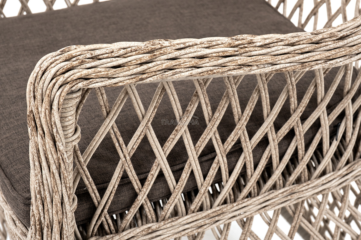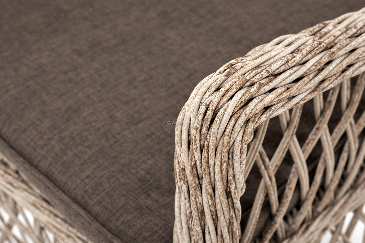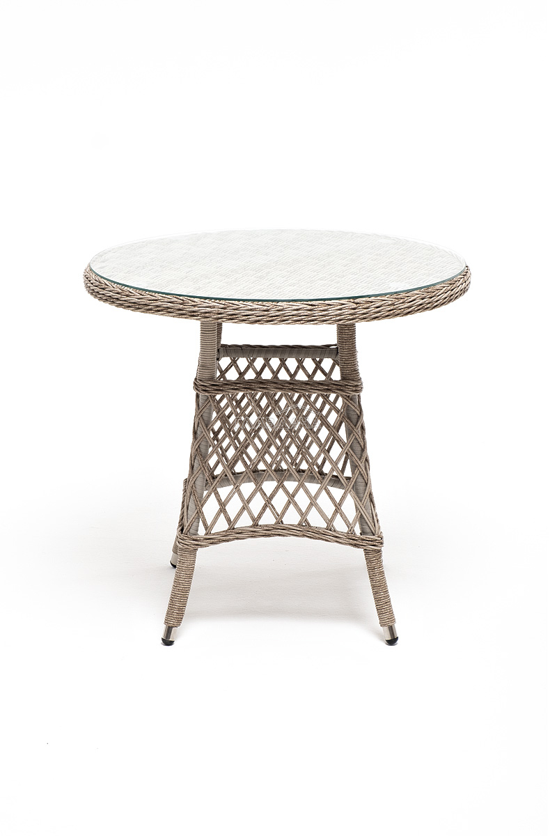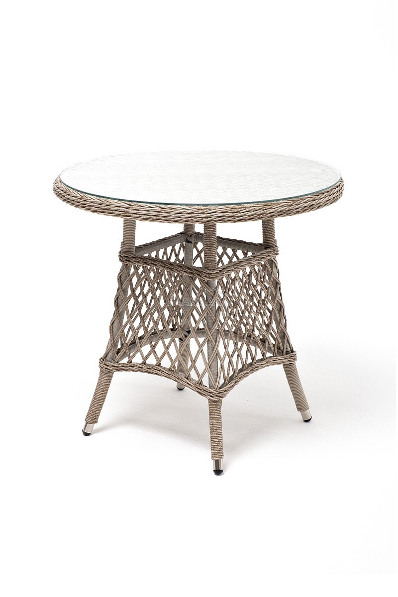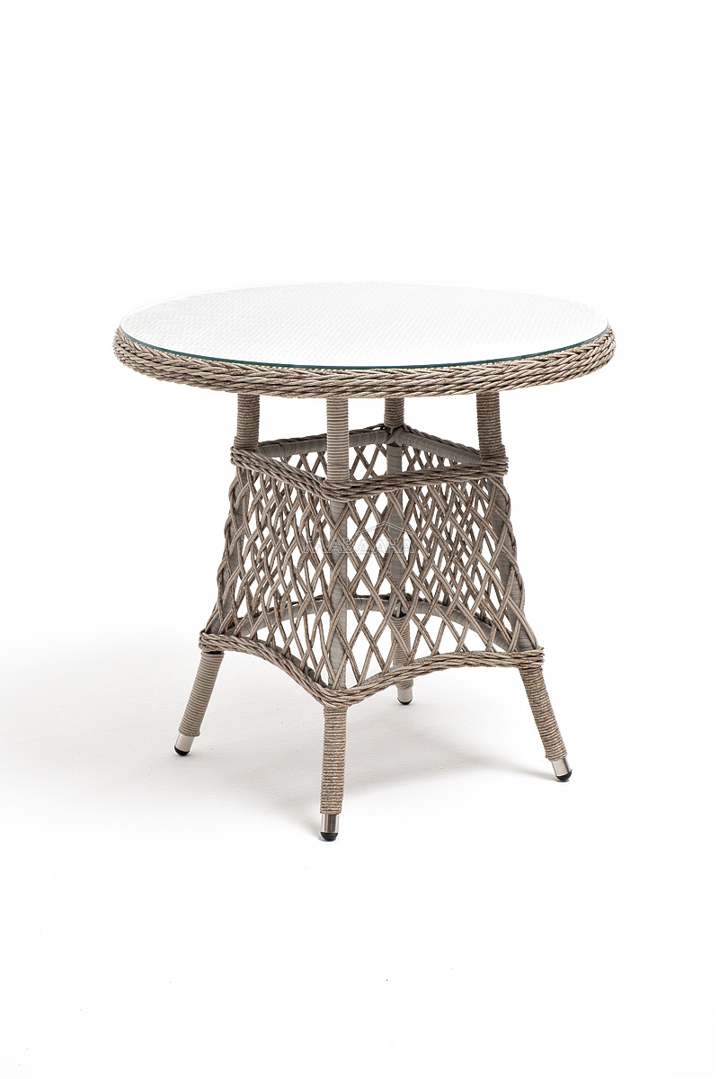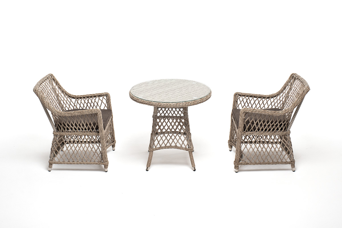 В плетеный комплект входит круглый стол «Эспрессо» диаметром 80 см с ударопрочной стеклянной столешницей и 2 кресла коллекции «Латте» 550×660×850 мм.