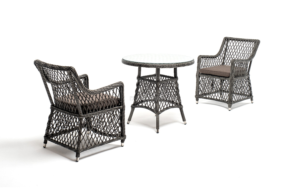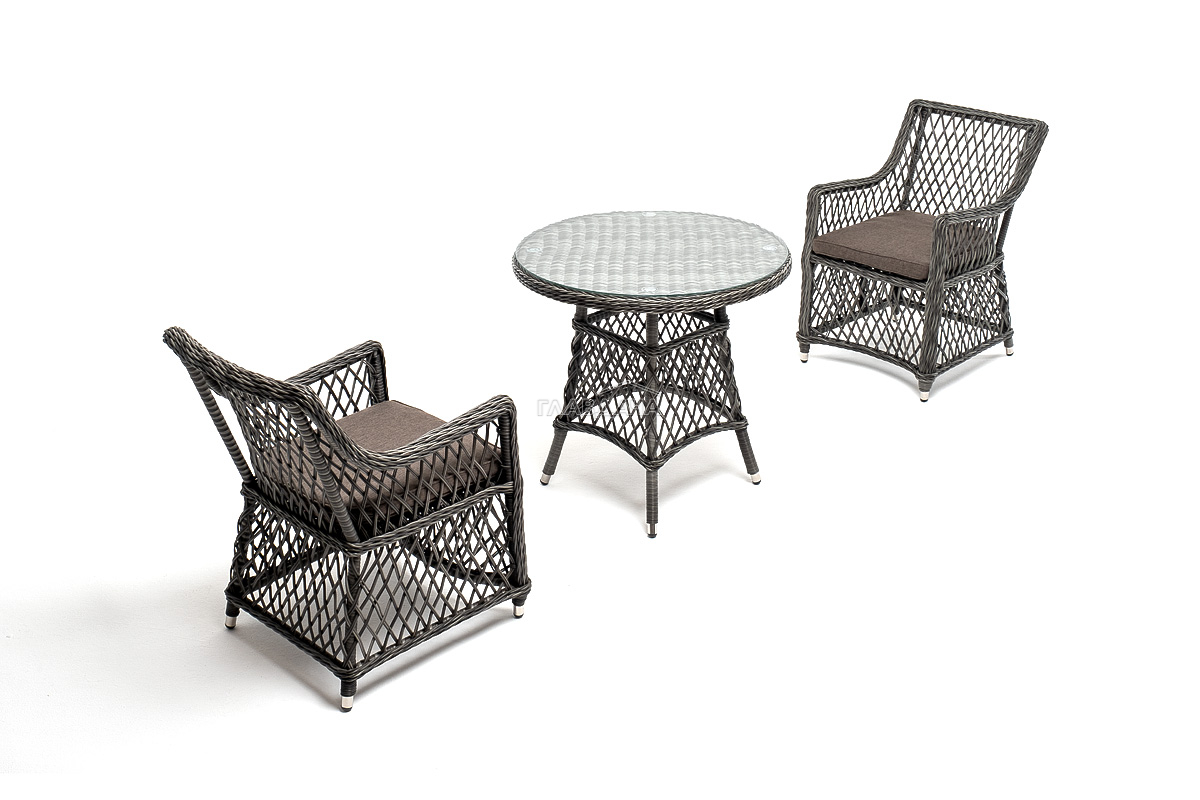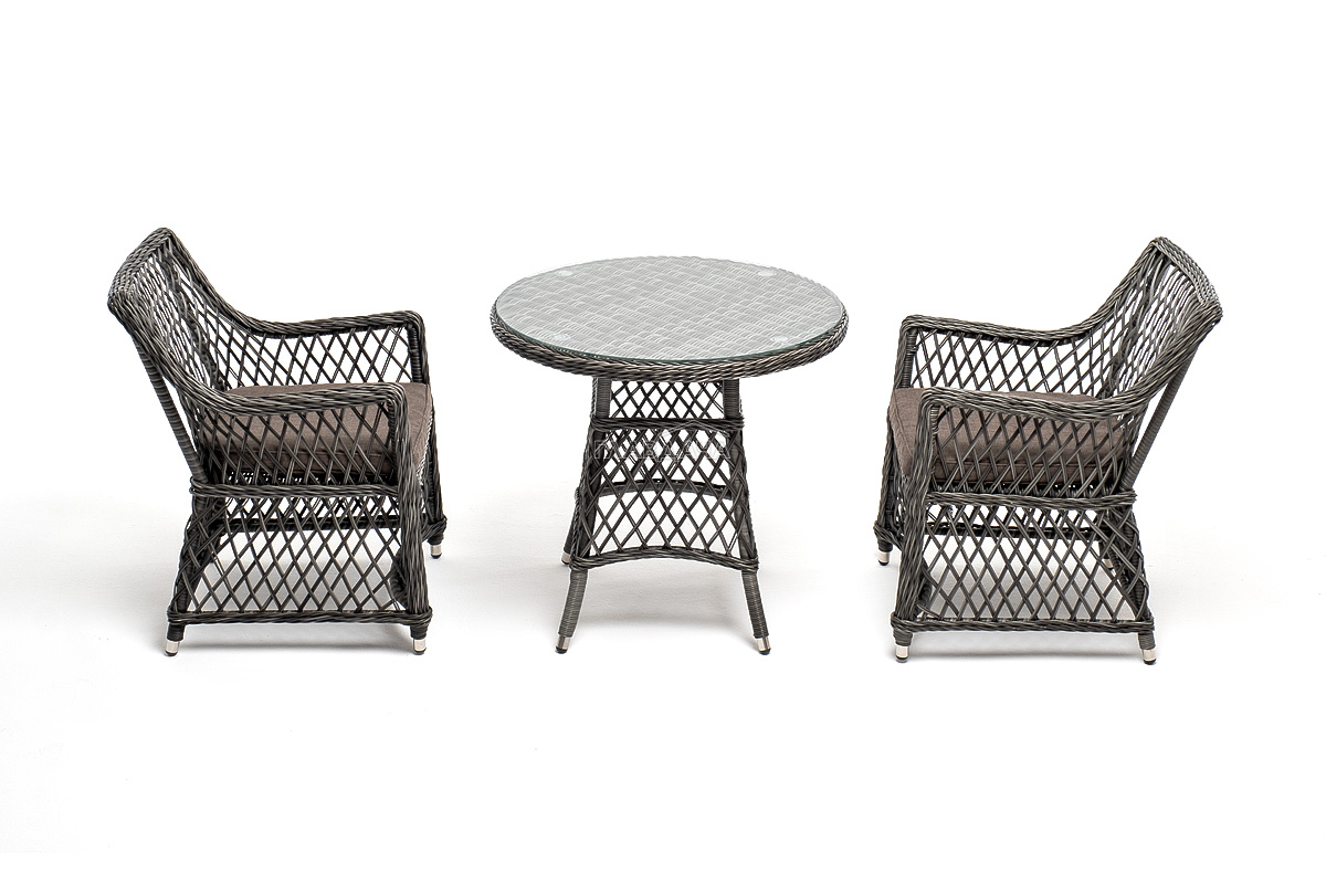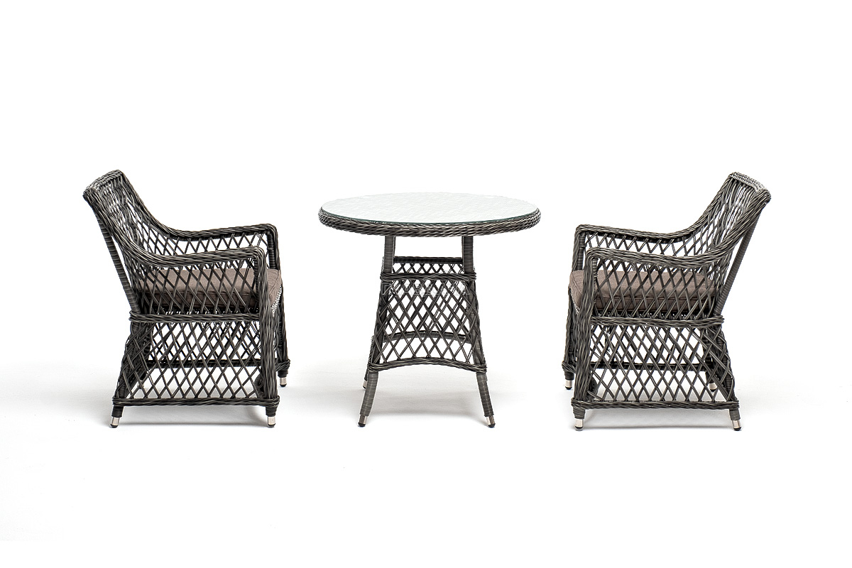 В плетеный комплект входит круглый стол «Эспрессо» диаметром 80 см с ударопрочной стеклянной столешницей и 2 кресла коллекции «Латте» 550×660×850 мм.