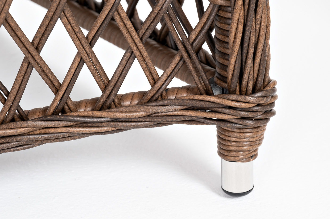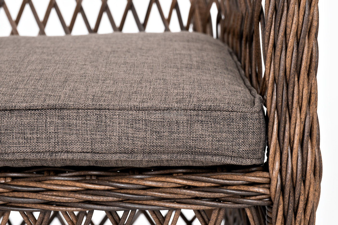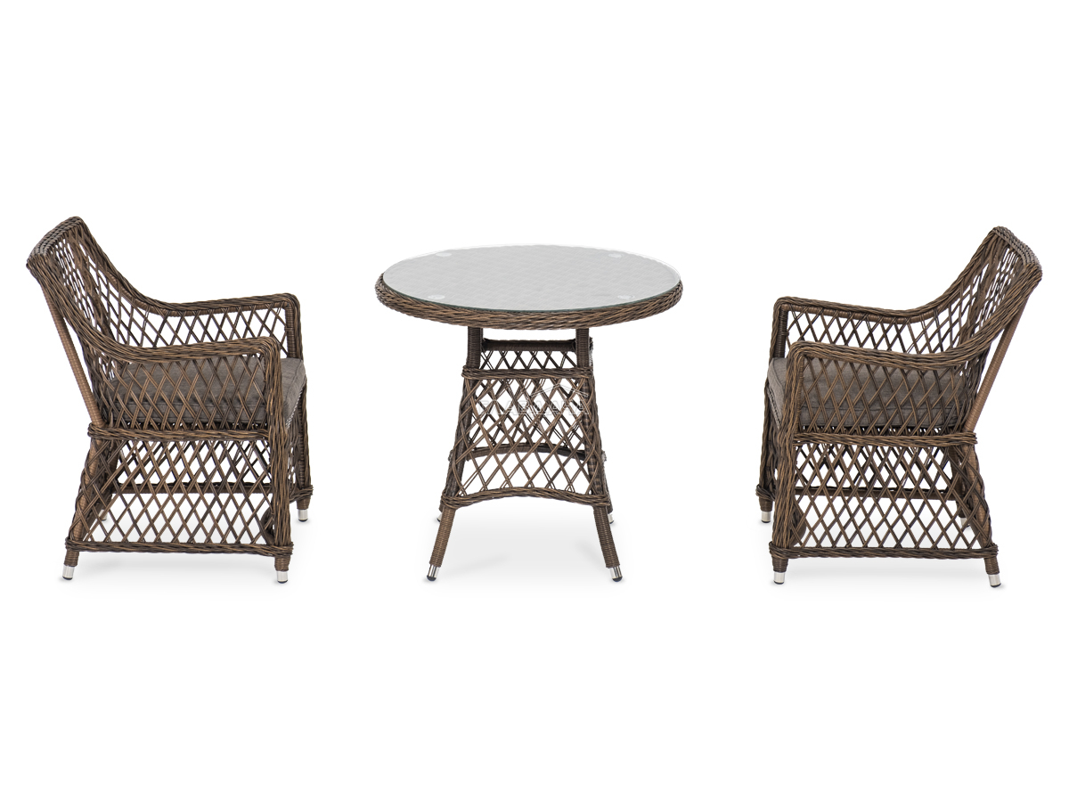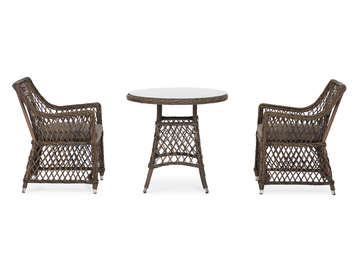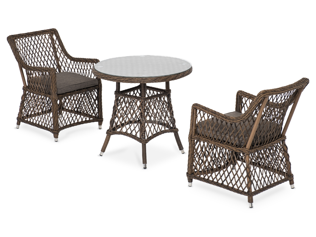 В плетеный комплект входит круглый стол «Эспрессо» диаметром 80 см с ударопрочной стеклянной столешницей и 2 кресла коллекции «Латте» 550×660×850 мм.