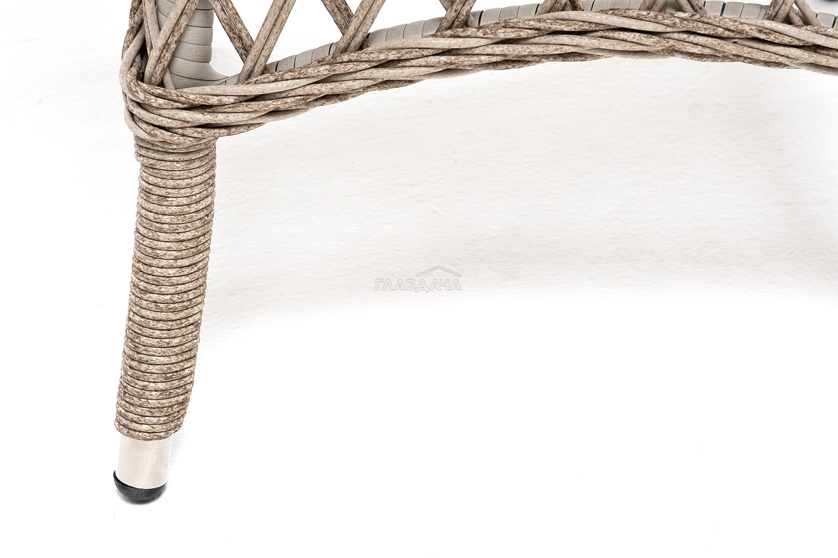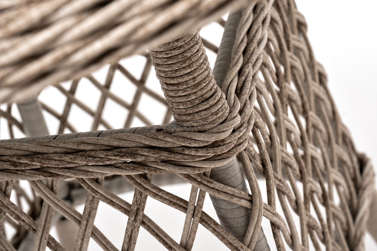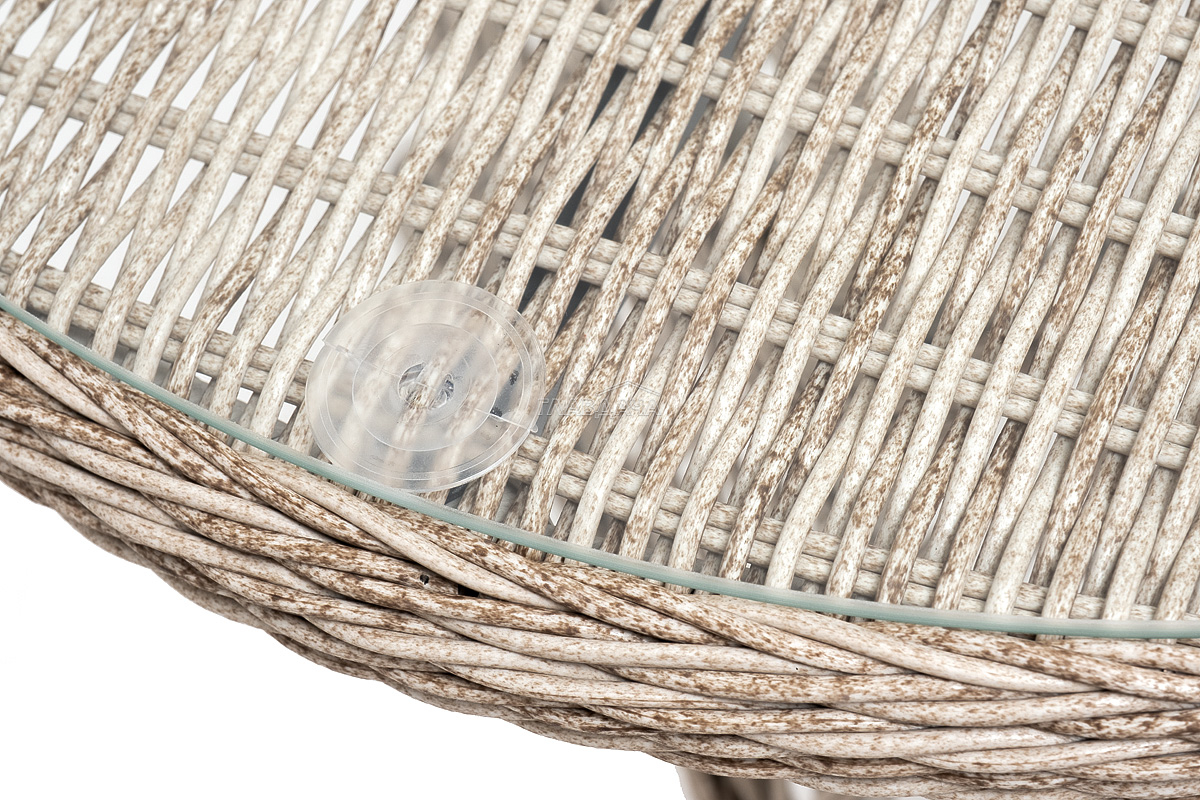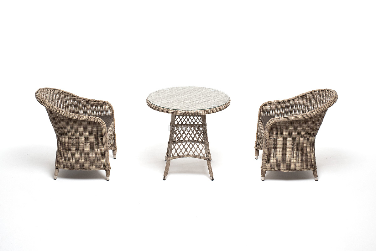 В плетеный комплект входит круглый стол «Эспрессо» диаметром 80 см с ударопрочной стеклянной столешницей и 2 кресла коллекции «Равенна» 570×680×810 мм.