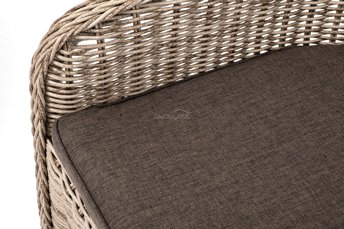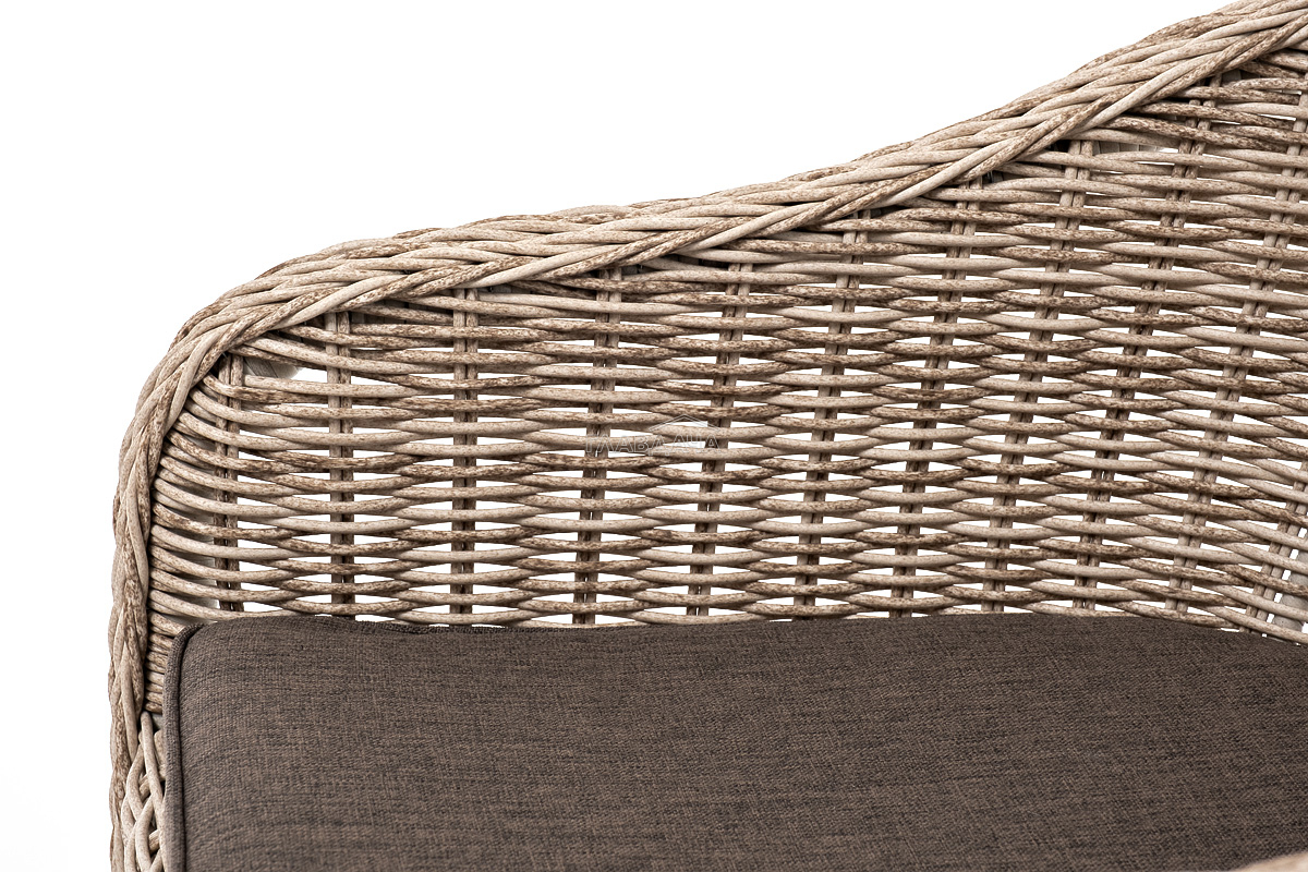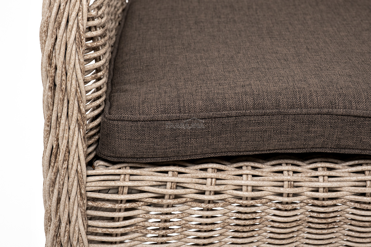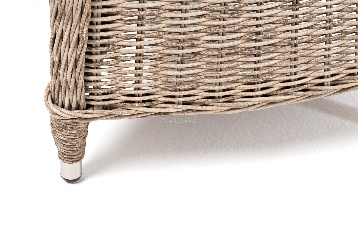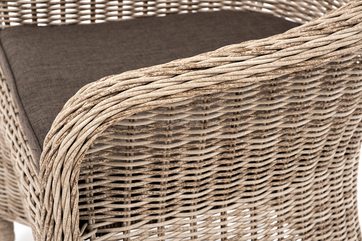 В плетеный комплект входит круглый стол «Эспрессо» диаметром 80 см с ударопрочной стеклянной столешницей и 2 кресла коллекции «Равенна» 570×680×810 мм.