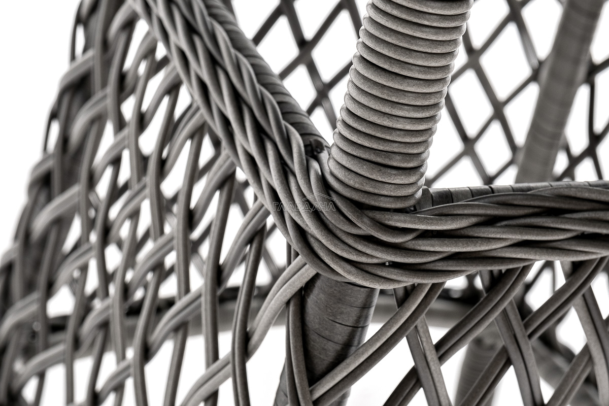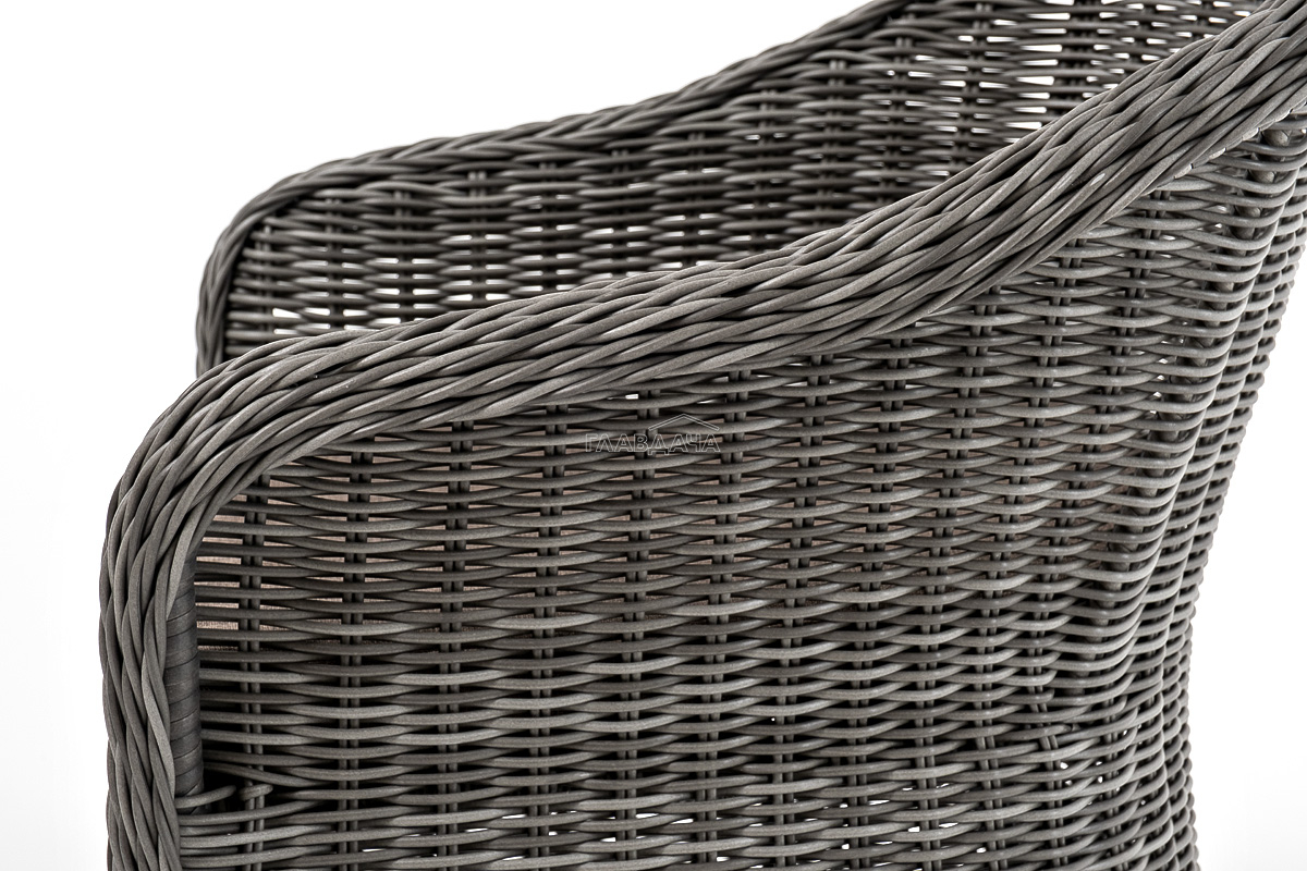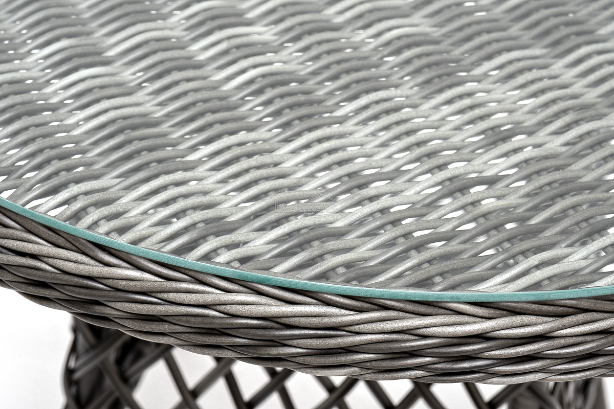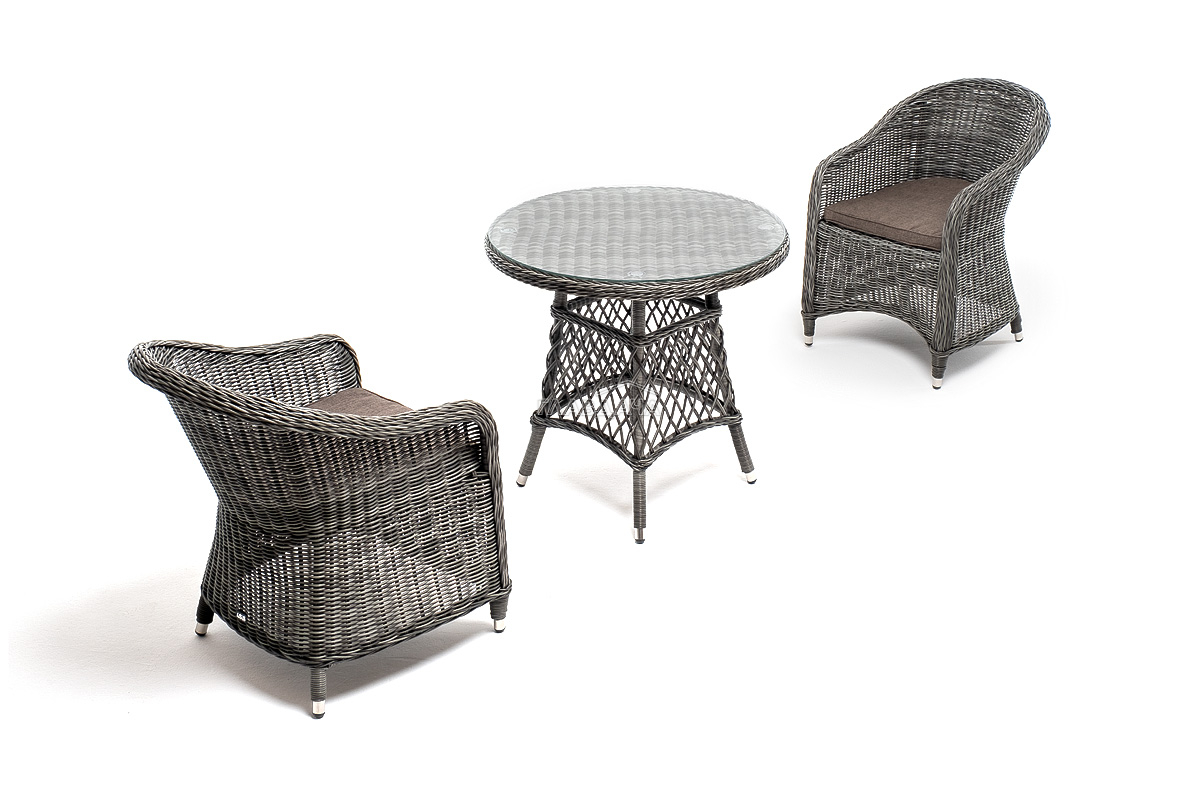В плетеный комплект входит круглый стол «Эспрессо» диаметром 80 см с ударопрочной стеклянной столешницей и 2 кресла коллекции «Равенна» 570×680×810 мм.